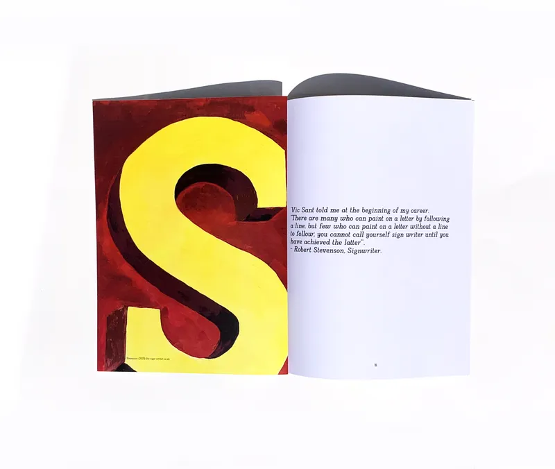 This publication is purposely unbound for a user to take spreads apart and assemble hand-painted a sign, like the scale of those popular in the 19th century in the style of traditional West Midlands signwritiers. This publication is also displayed within my own typeface, Pica Market. Developed with inspiration from Miller and Richard Newspaper Type, market-place signage and signwriting, Pica Market is a legible combination of features which felt appropriate to convey the historical relevance and creativity of this subject.