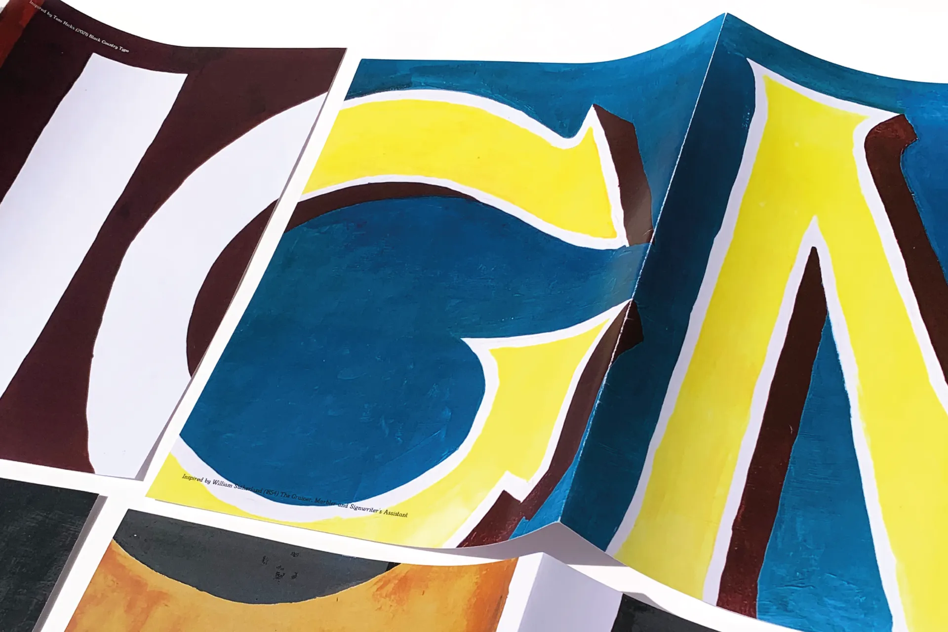 This publication is purposely unbound for a user to take spreads apart and assemble hand-painted a sign, like the scale of those popular in the 19th century in the style of traditional West Midlands signwritiers. This publication is also displayed within my own typeface, Pica Market. Developed with inspiration from Miller and Richard Newspaper Type, market-place signage and signwriting, Pica Market is a legible combination of features which felt appropriate to convey the historical relevance and creativity of this subject.