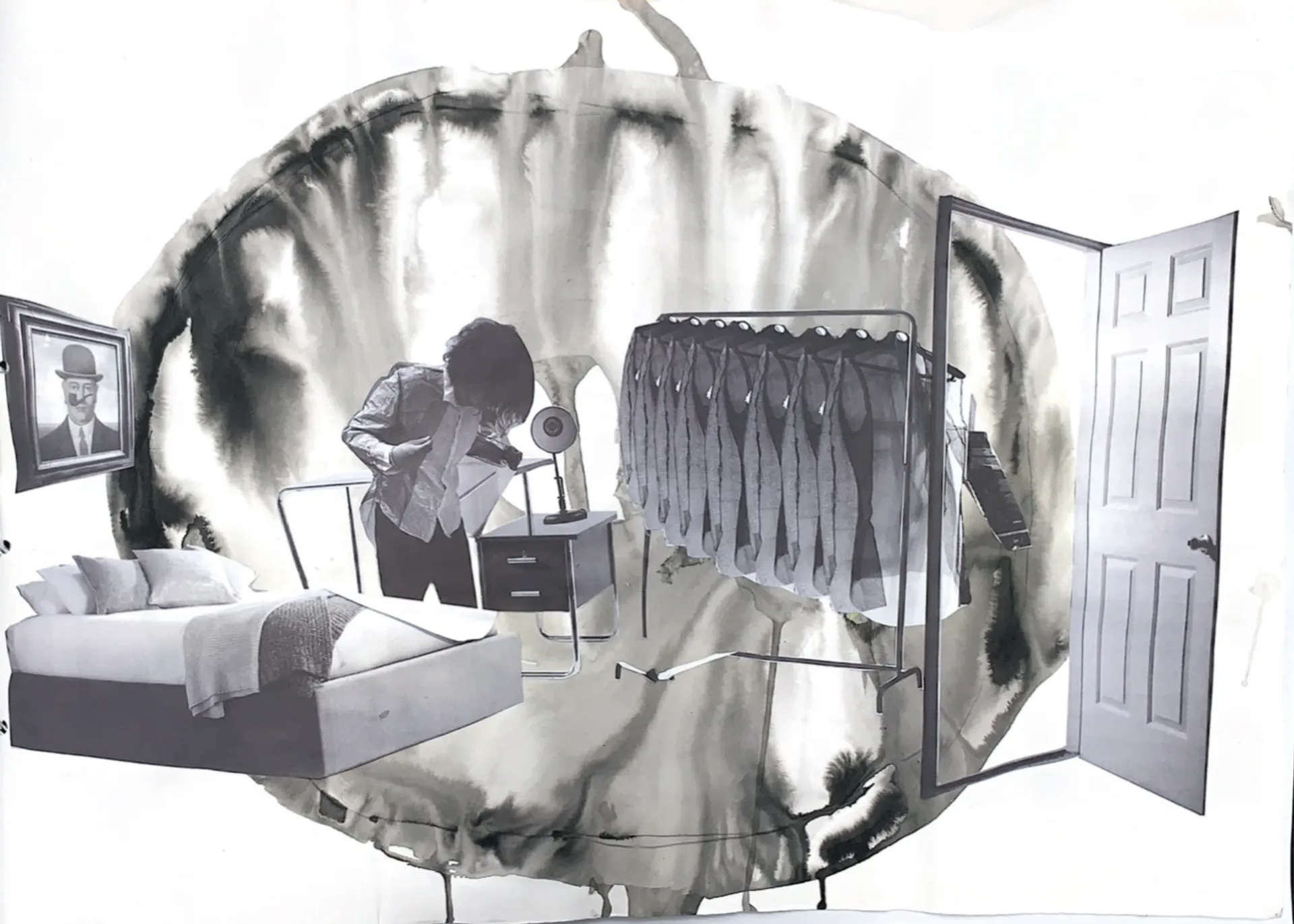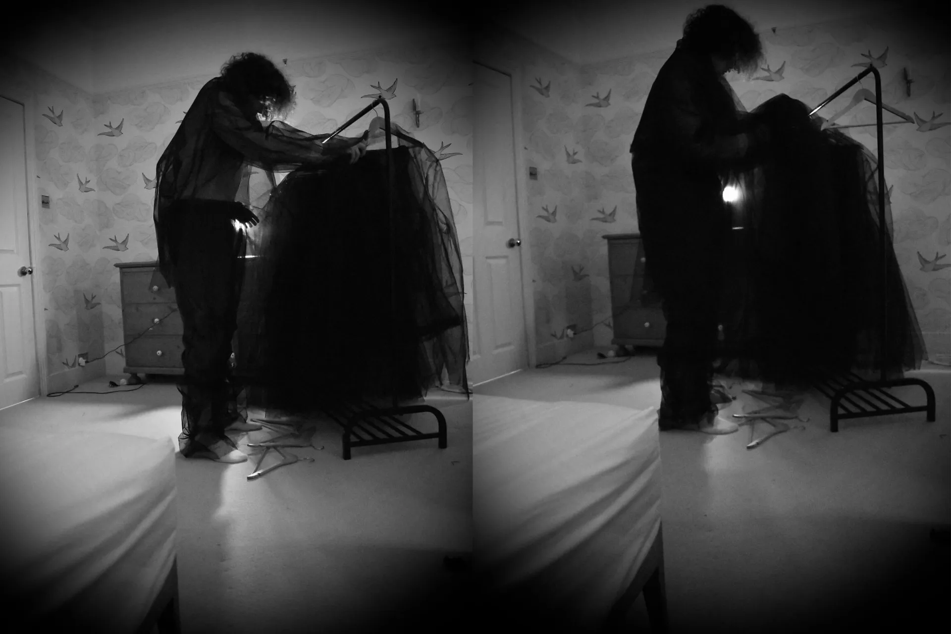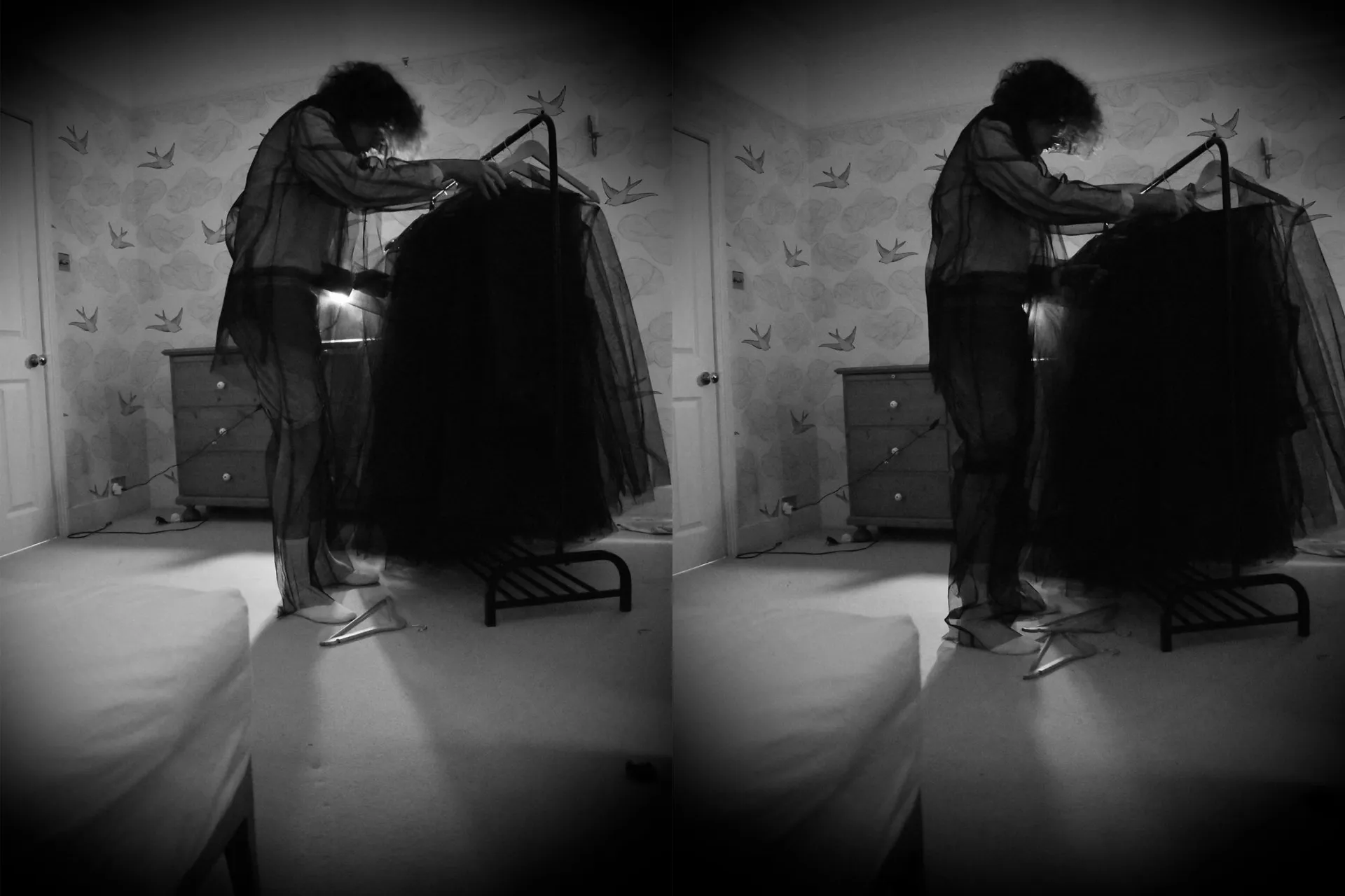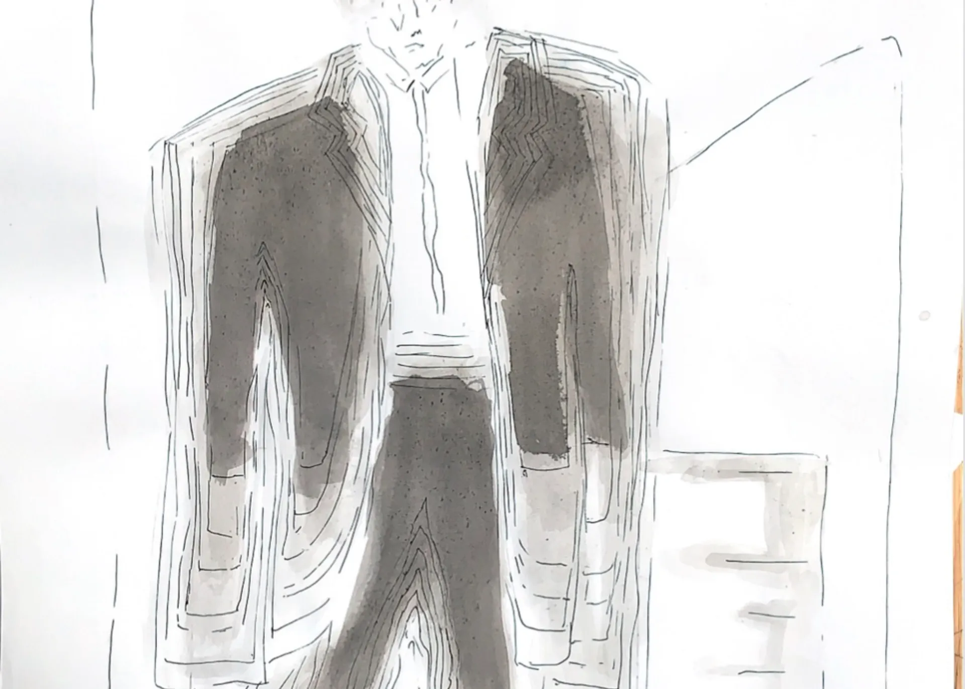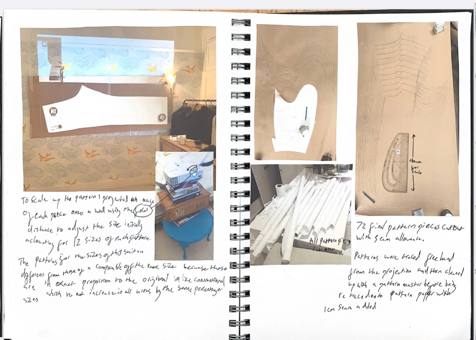 So often the suit used to hide something about the wearer, to present a false image of themselves to the world. My garment explores this dishonesty; it consists of 9 nearly transparent suits of increasing size layered one after the other until the become completely opaque