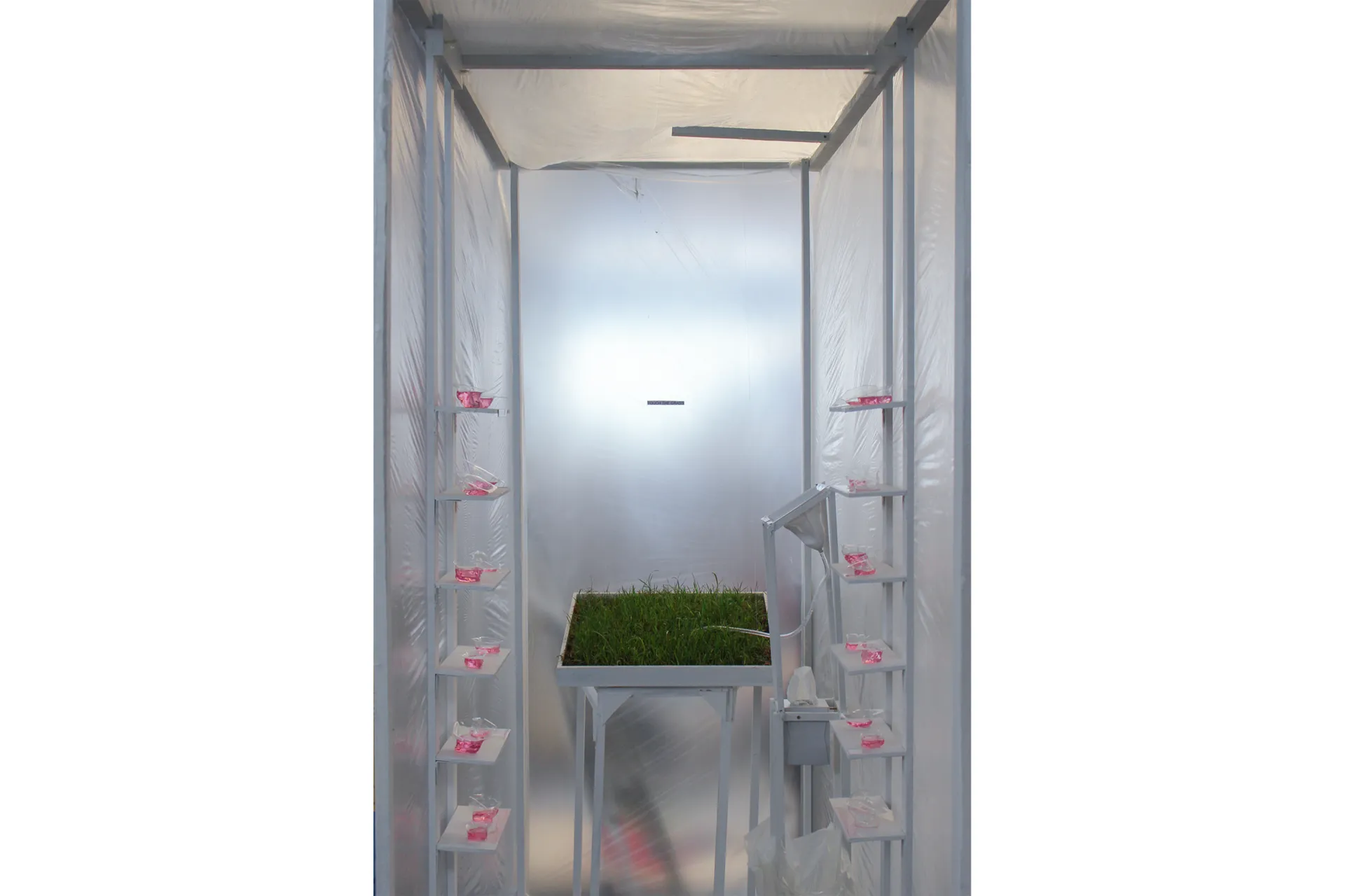 Dimensions variable. Fabricated wooden structures, polythene dust sheet, grass, mild steel and aluminium brackets, airbrush, paint, found and repaired soap dispenser, soap, fabricated sample cups, mouthwash, fabricated liquid disposal tubing, tissues.
