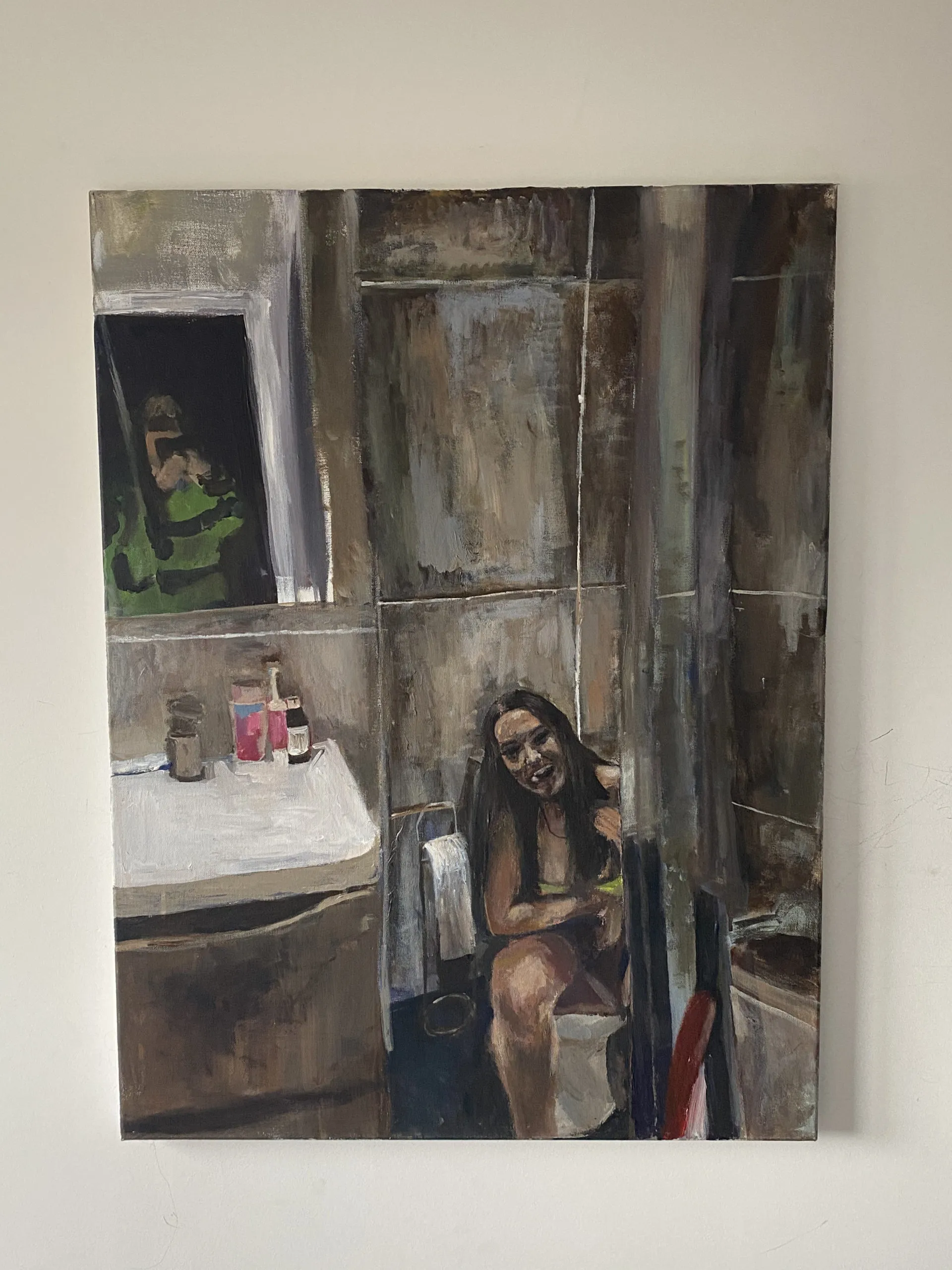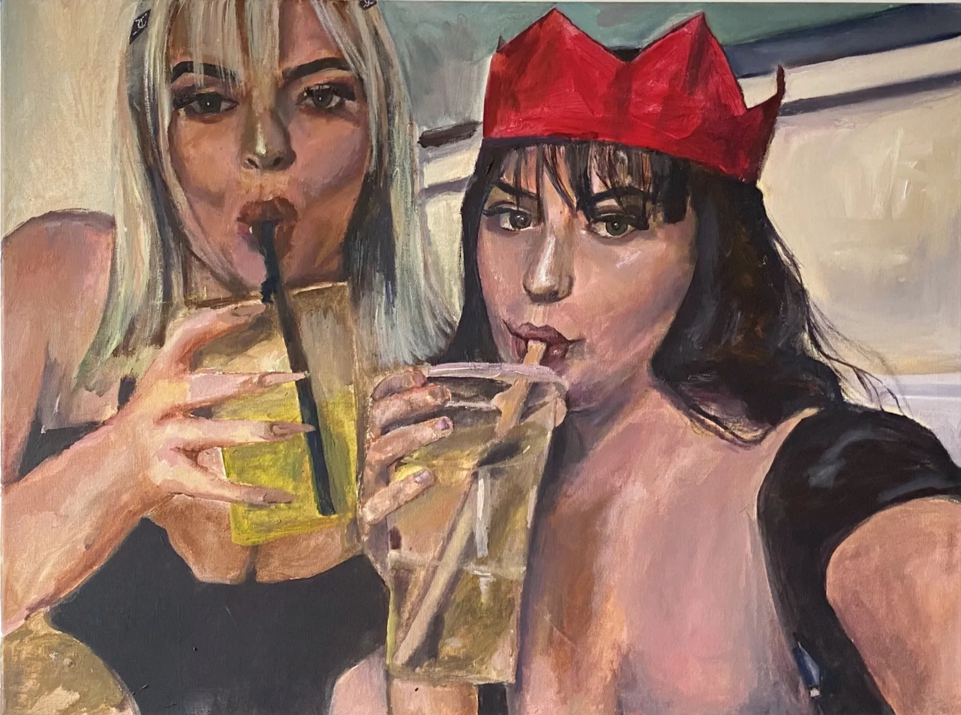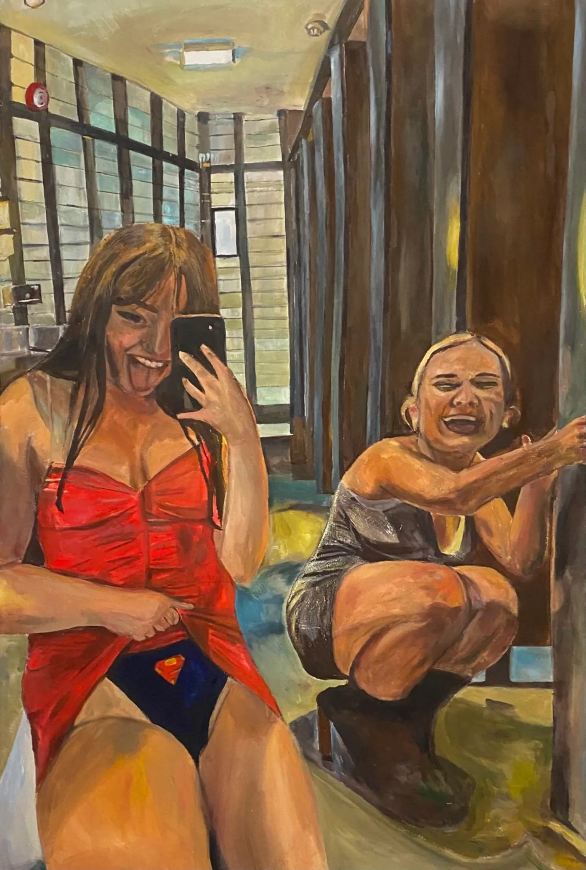 ‘SHAMELESS WOMEN’ is a collection of six paintings that follow a ‘girls night out’. These works are enhanced by an audio that forms a soundscape which follows the progression of the night. The painted works act as snapshots for the moments across the night which are highlighted in the audio work. Each work is an unconventional as well as empowering representation of its female subject.