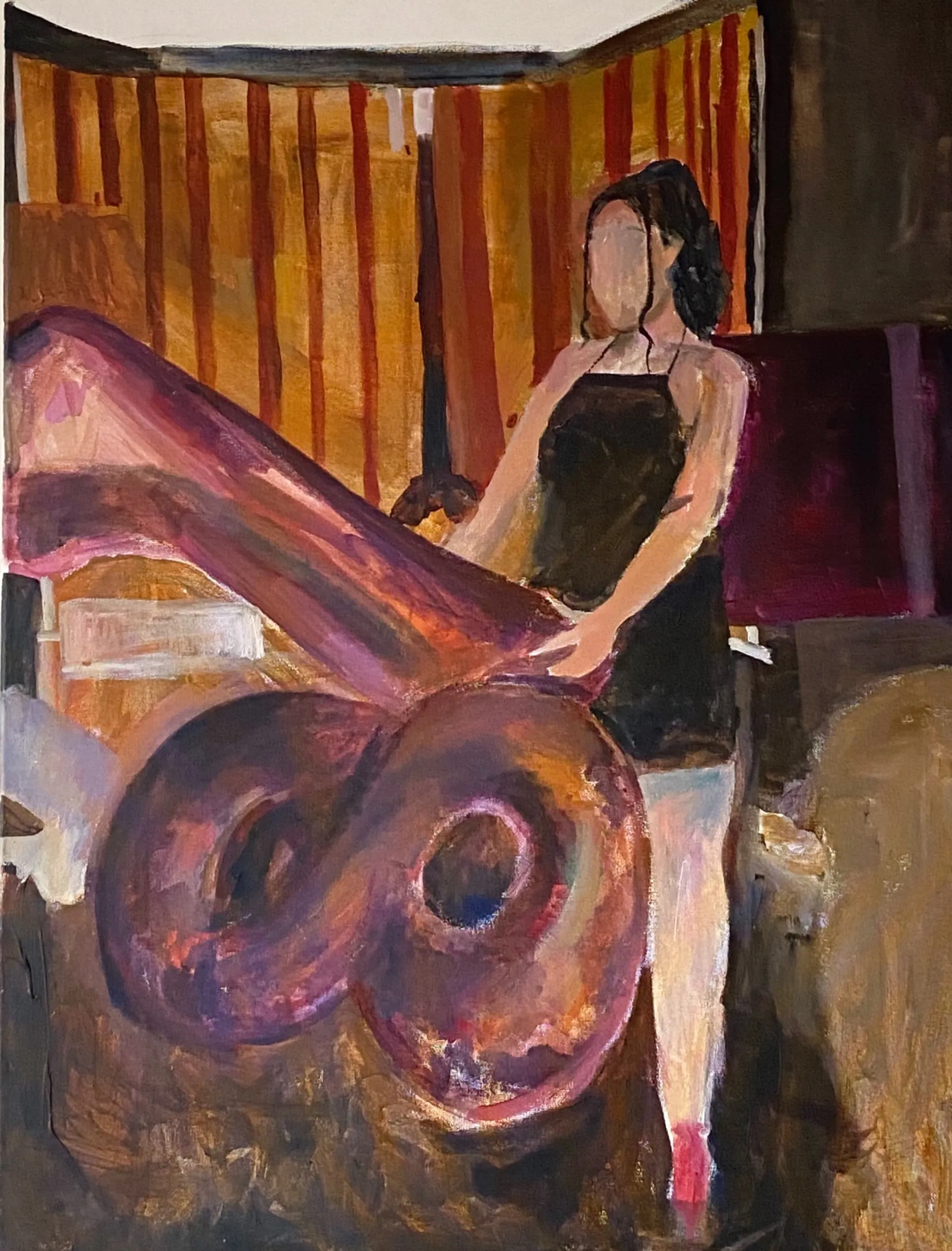 My work’s focus is empowered female figures represented across canvas works, film and are often paired with audio accompaniments. Some works touch on themes of abject and outrageousness whilst all depict a strong female focal point. I am interested in empowering reclamations of the female figure, exploring themes ‘controversial’ and ‘grotesque’ and their relationship with the female form as well as imagery presenting powerful and beautiful representations the subject. Within my depictions, there is a humour behind the image, created by the shamelessness the figures show around subjects such as sex and urination. behind works, I like to create an irony and playfulness. My work consists of moments I have personally captured, which I honour by transforming into large-scale works and music-video style films a with original audios, connecting my artistic practice with my interest music writing. As my work has faced controversy in the past, my intention is to introduce new ideas concerning how the female form is represented by interpreting and depicting the feminine figure at the intersection where beauty and scandal meet.