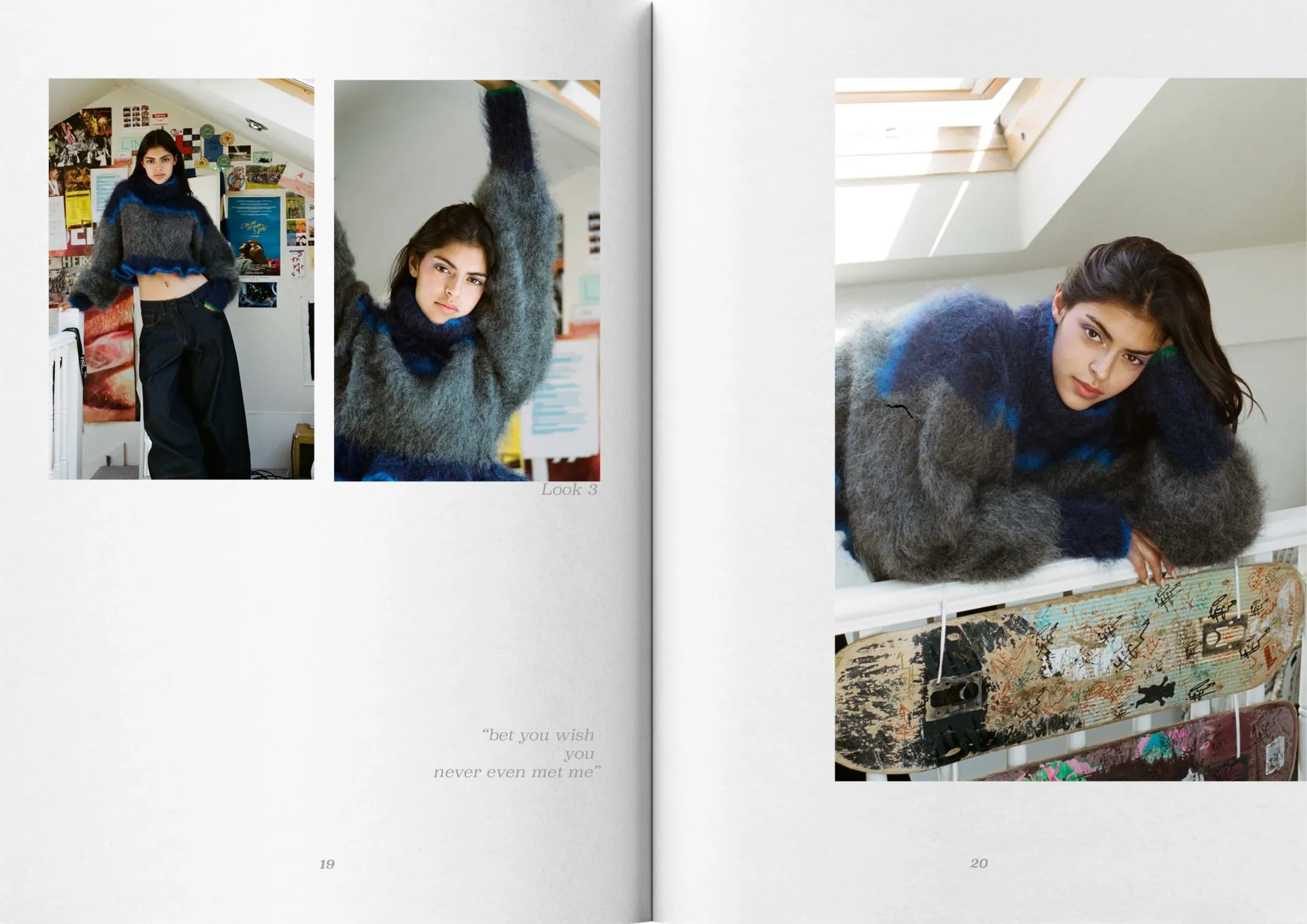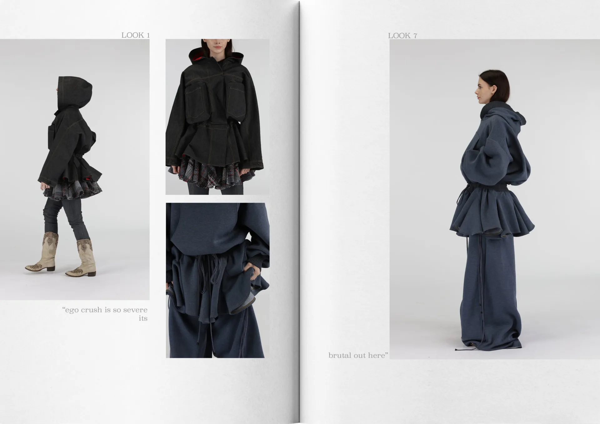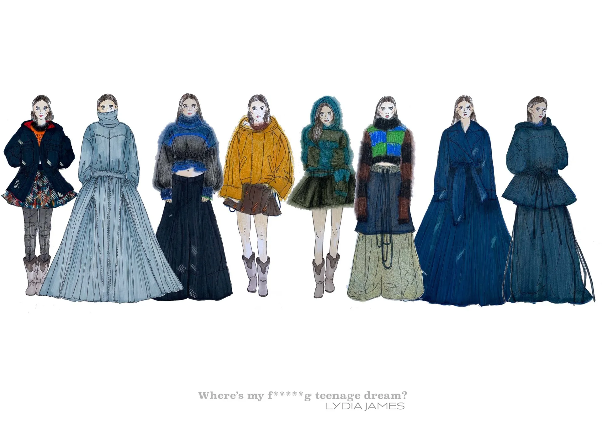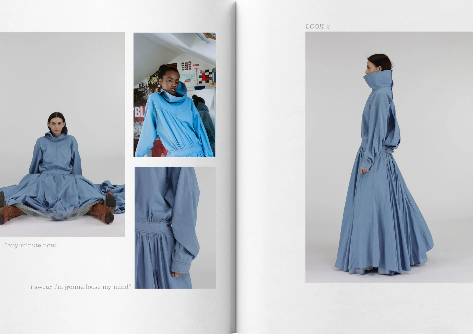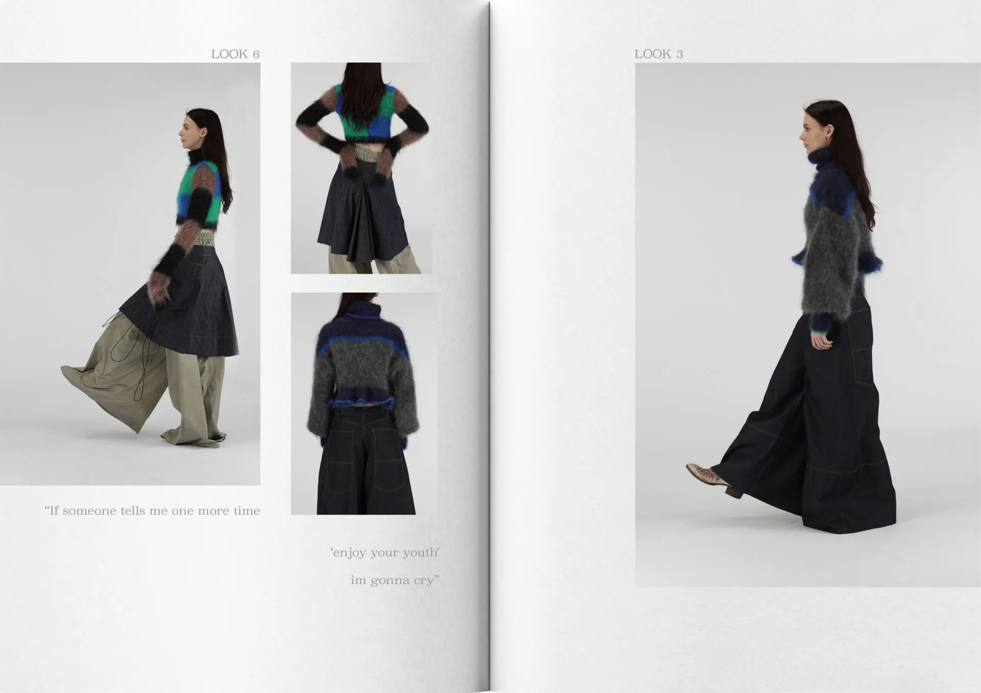 My collection mixes mohair knitwear with denim predominantly, consisting of 8 looks. The silhouette mimics that of being a teenager, overwhelming, oversized, playful and voluminous. Trying to fit into a big world.