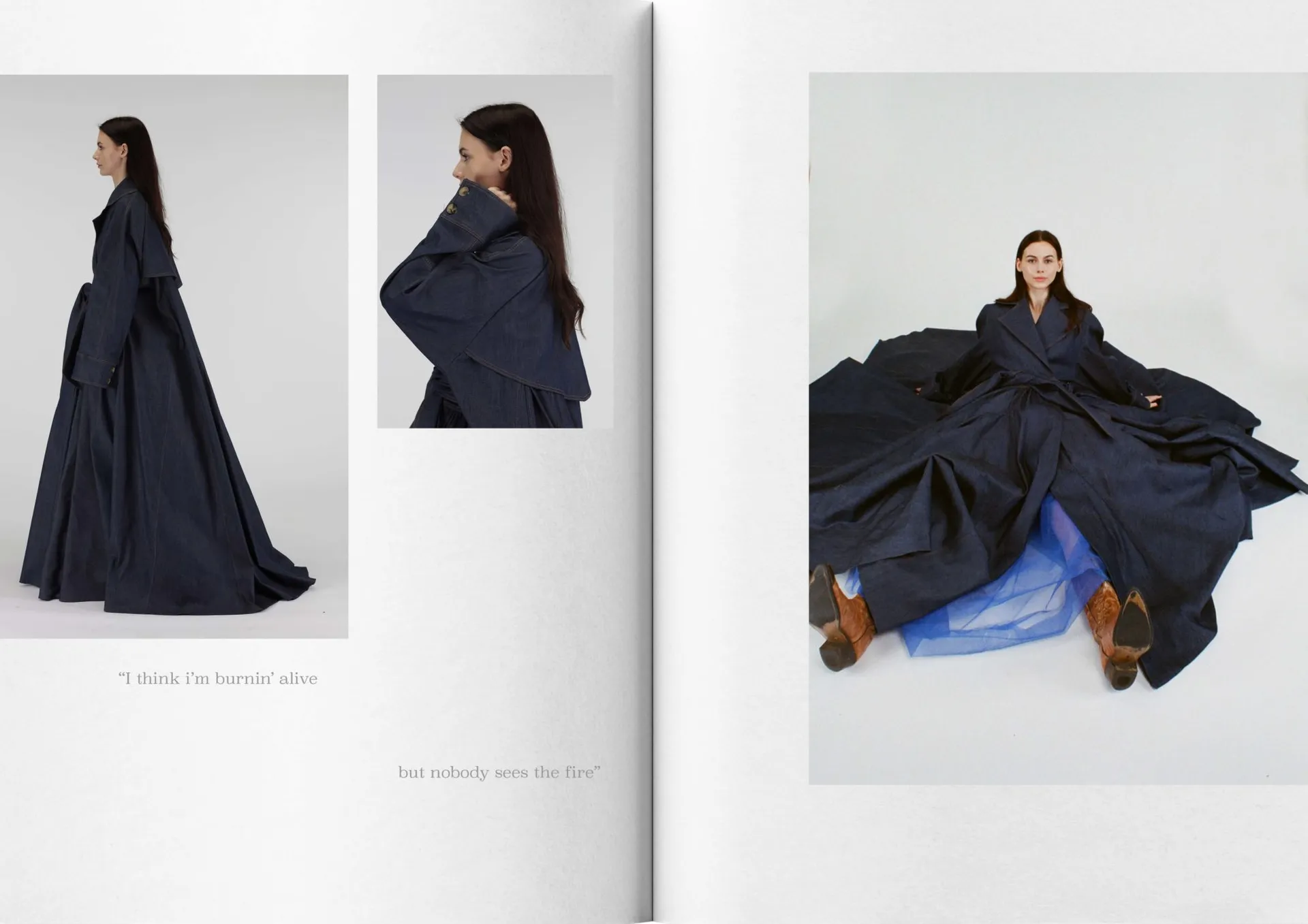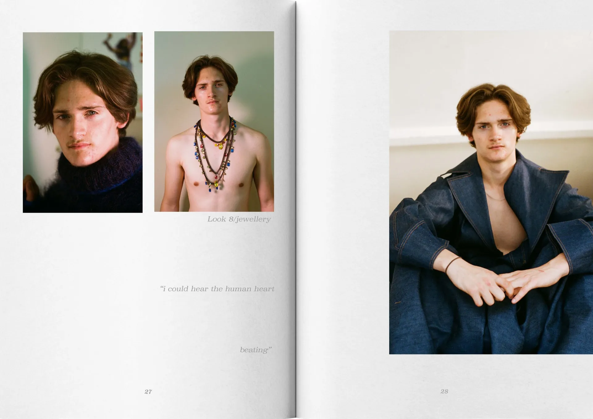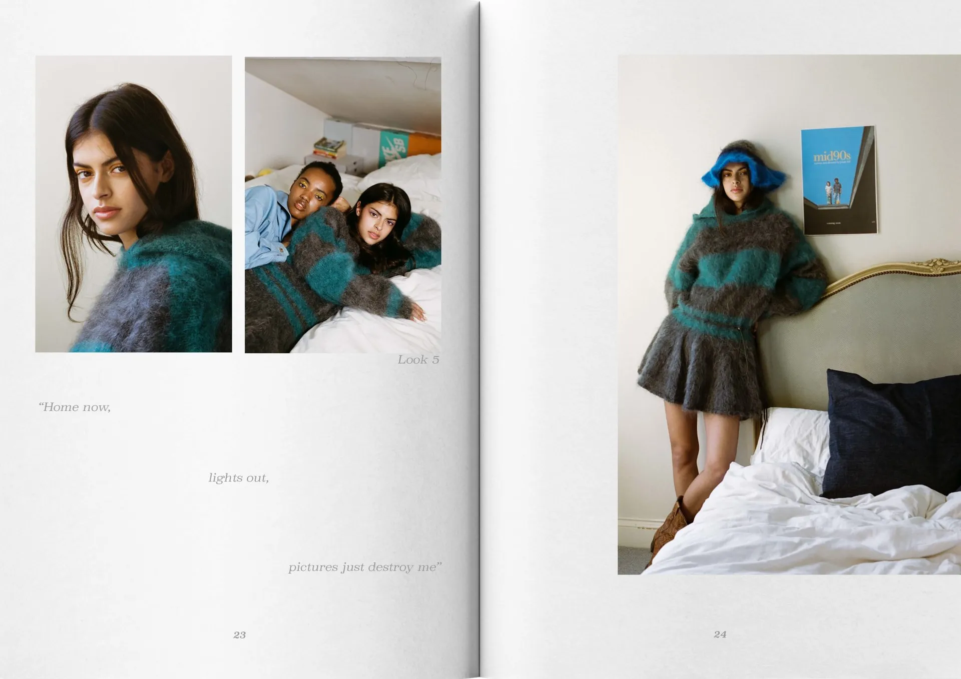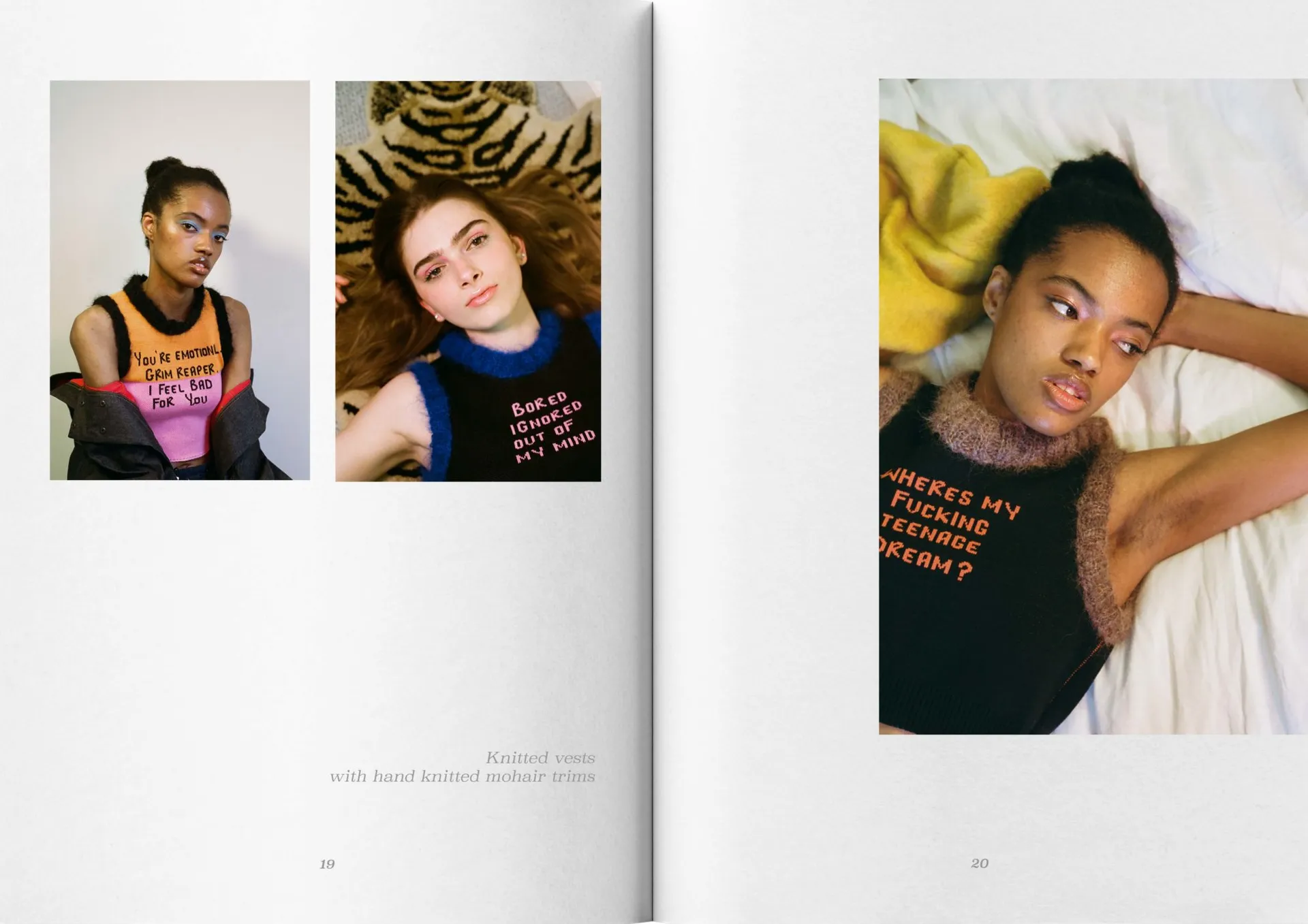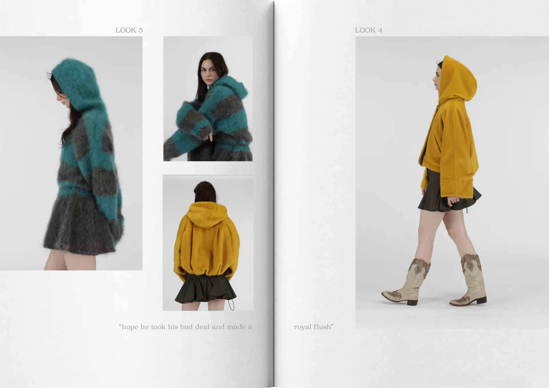 My collection mixes mohair knitwear with denim predominantly, consisting of 8 looks. The silhouette mimics that of being a teenager, overwhelming, oversized, playful and voluminous. Trying to fit into a big world.