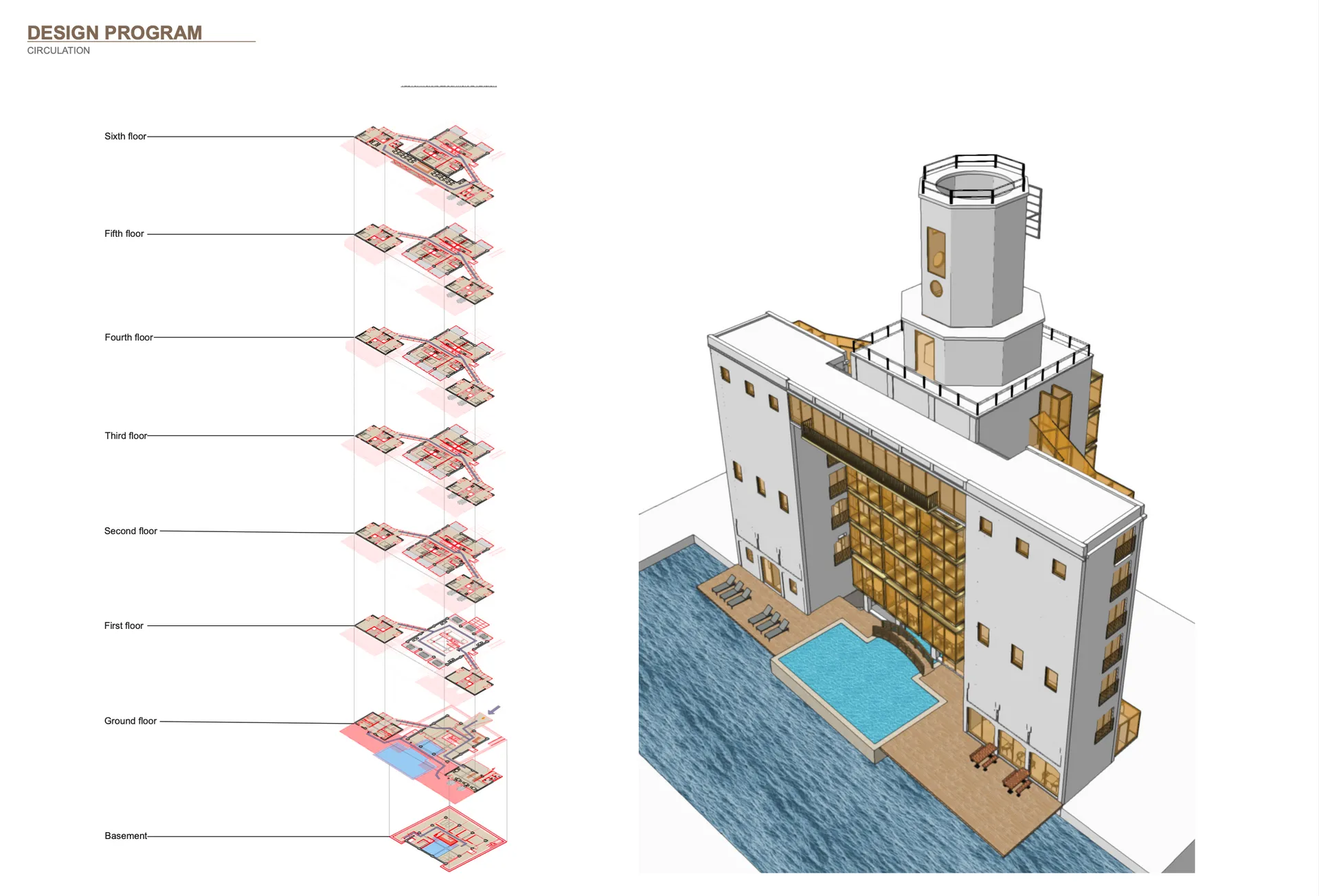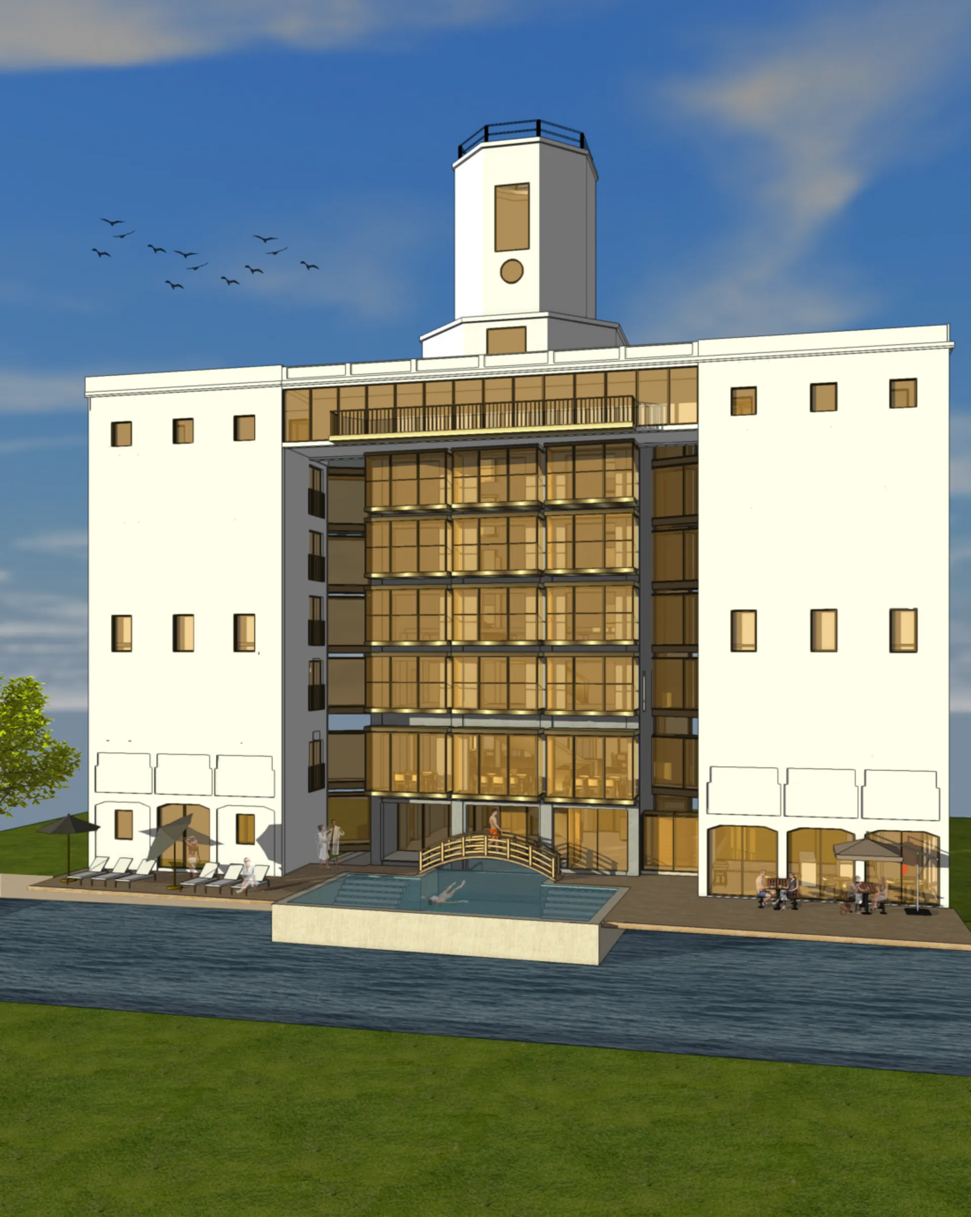 The building consists of 47 hotel rooms, a co-working space, a spa and wellness area, and