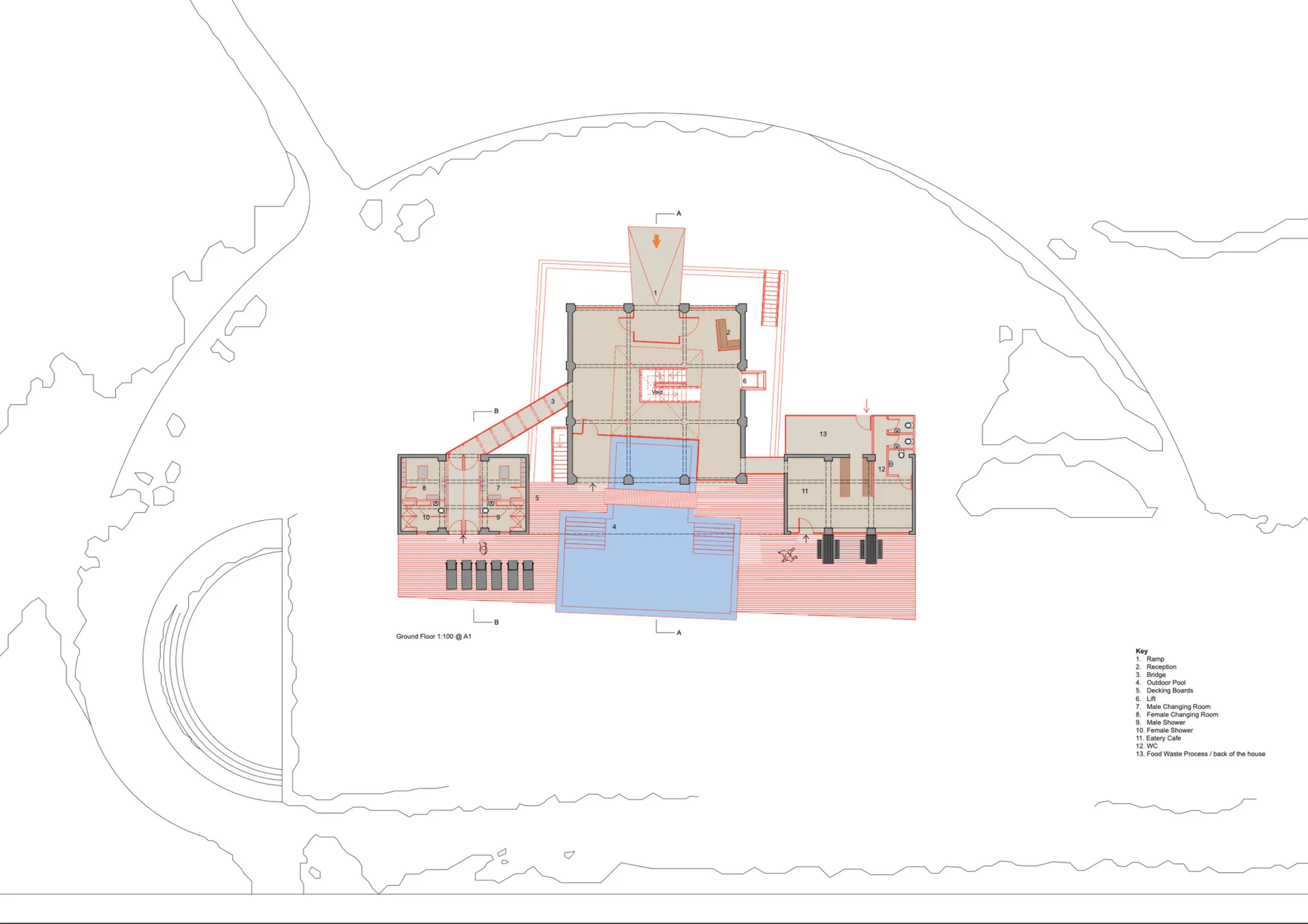 The spa and wellness area is located in the basement and consists of a massage room, sauna, steam room, cold bath, and an indoor pool. The basement was extended in order to be able to add gardens on the outside of the building as well as add more natural light inside the basement.