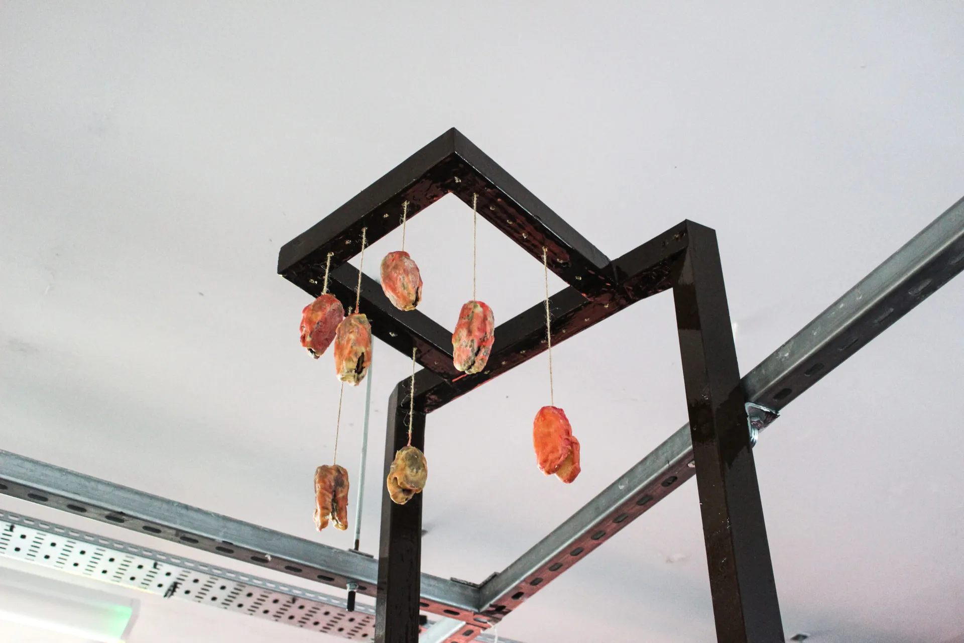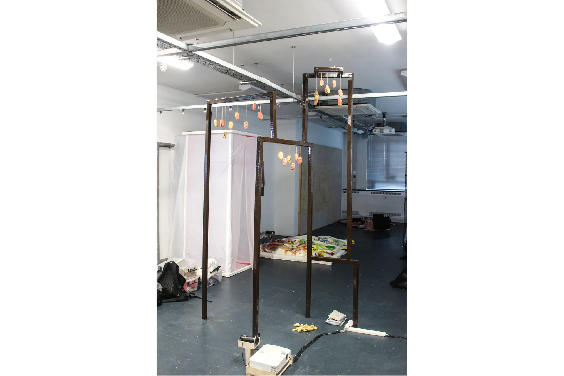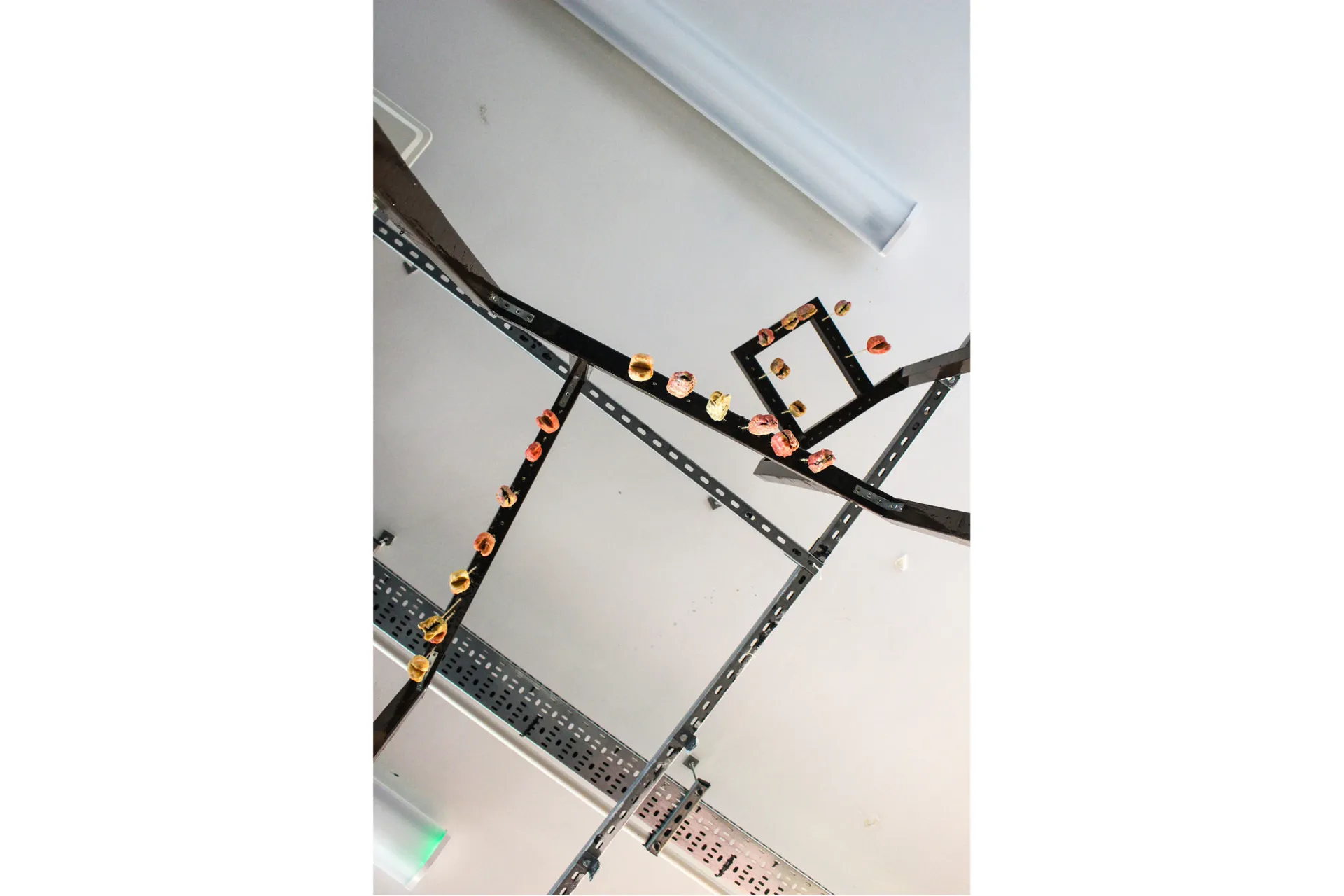 The plasticky tree structure highlights Manfred’s fascination with climbing frames and playgrounds. Drawing on the design language of arches and multi-levels, the structure gives you infinite ways of interaction, up to the viewers own exploration and manipulation. Working for the highest fruit by climbing rewards you with the sweetest of the bunch, obtainable by only the most willing.