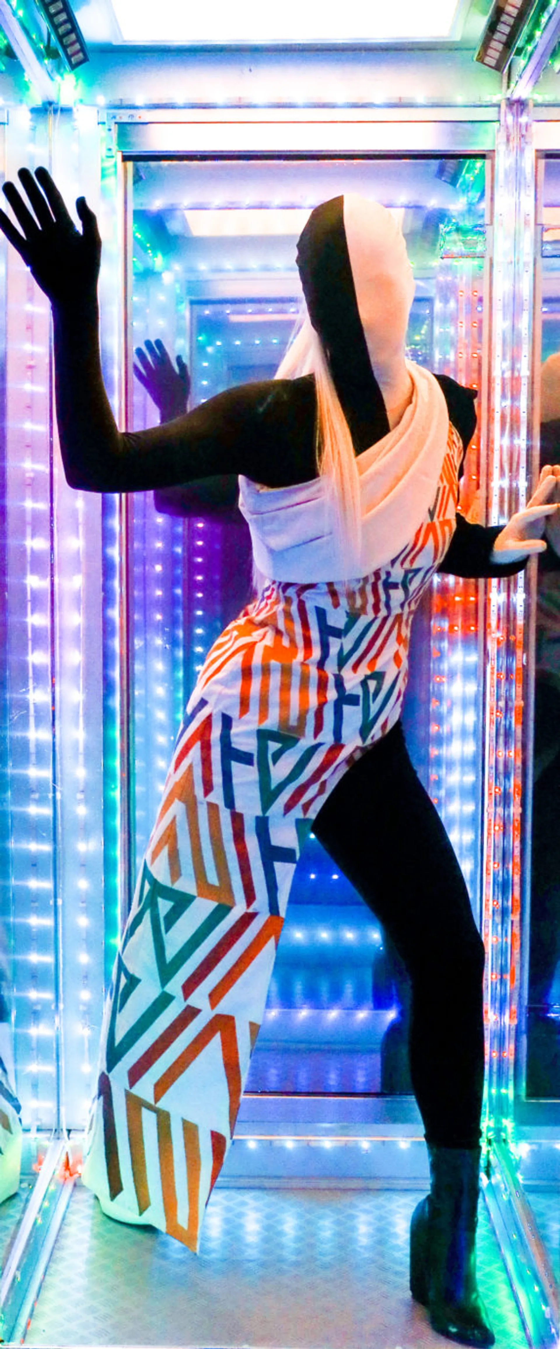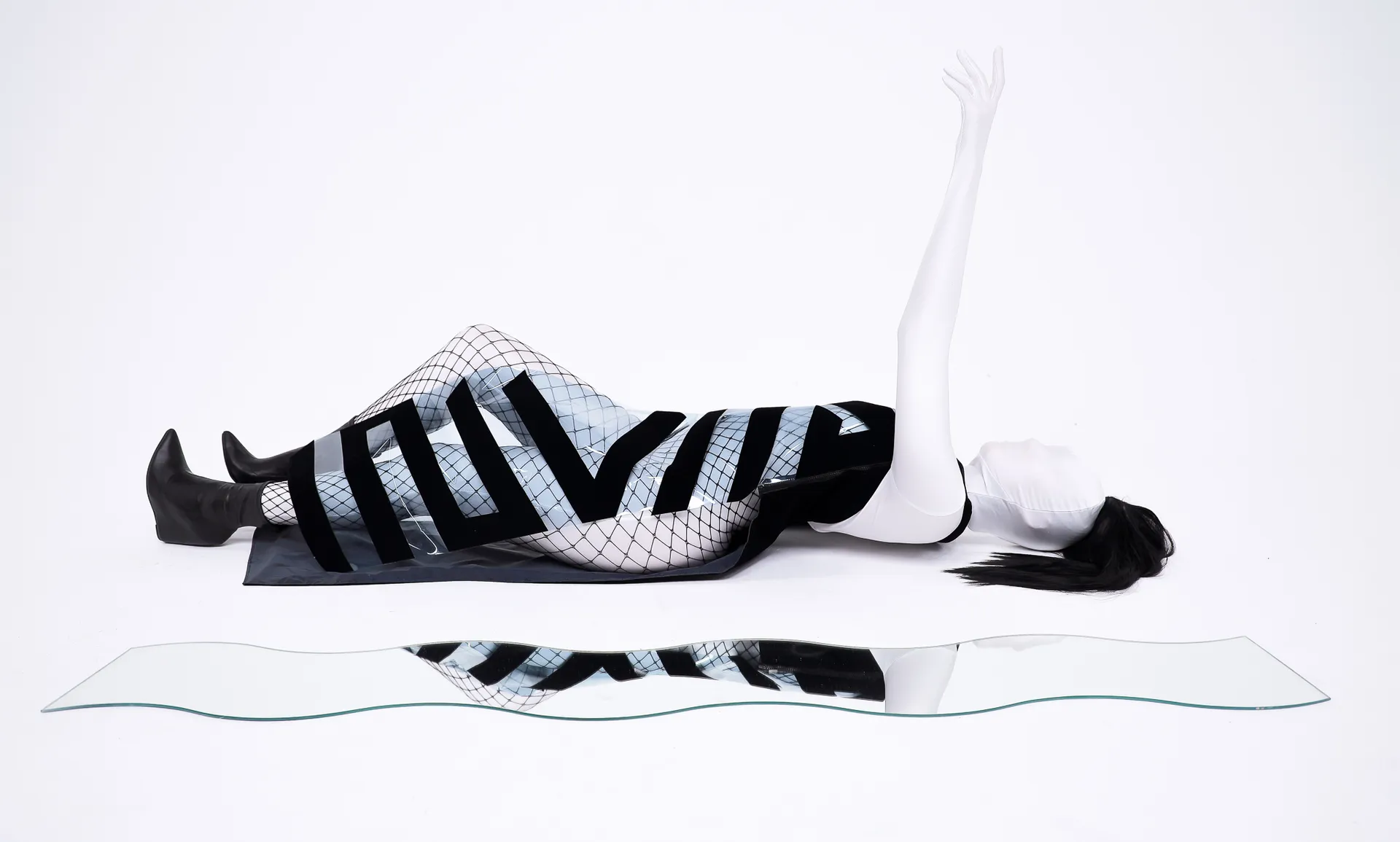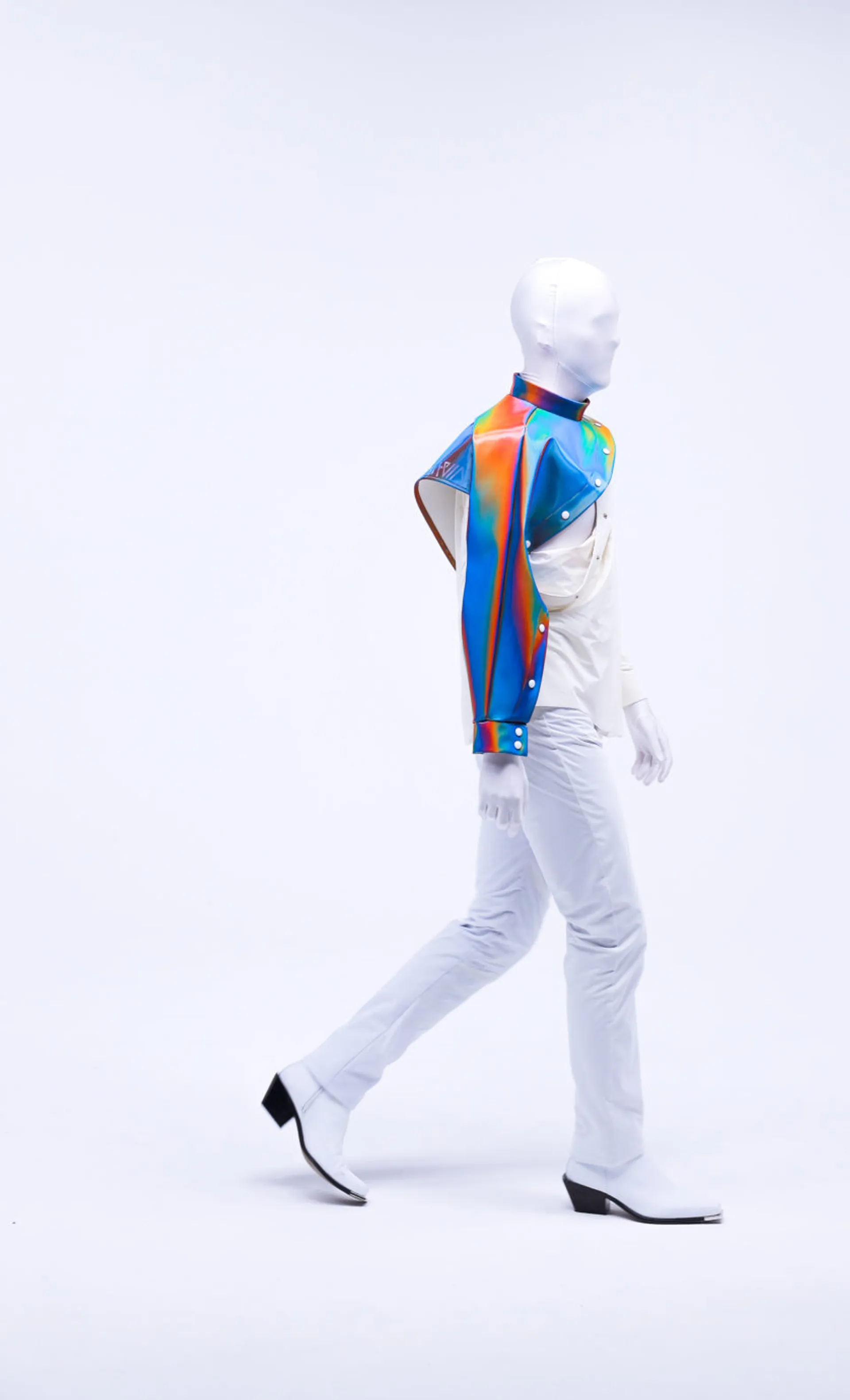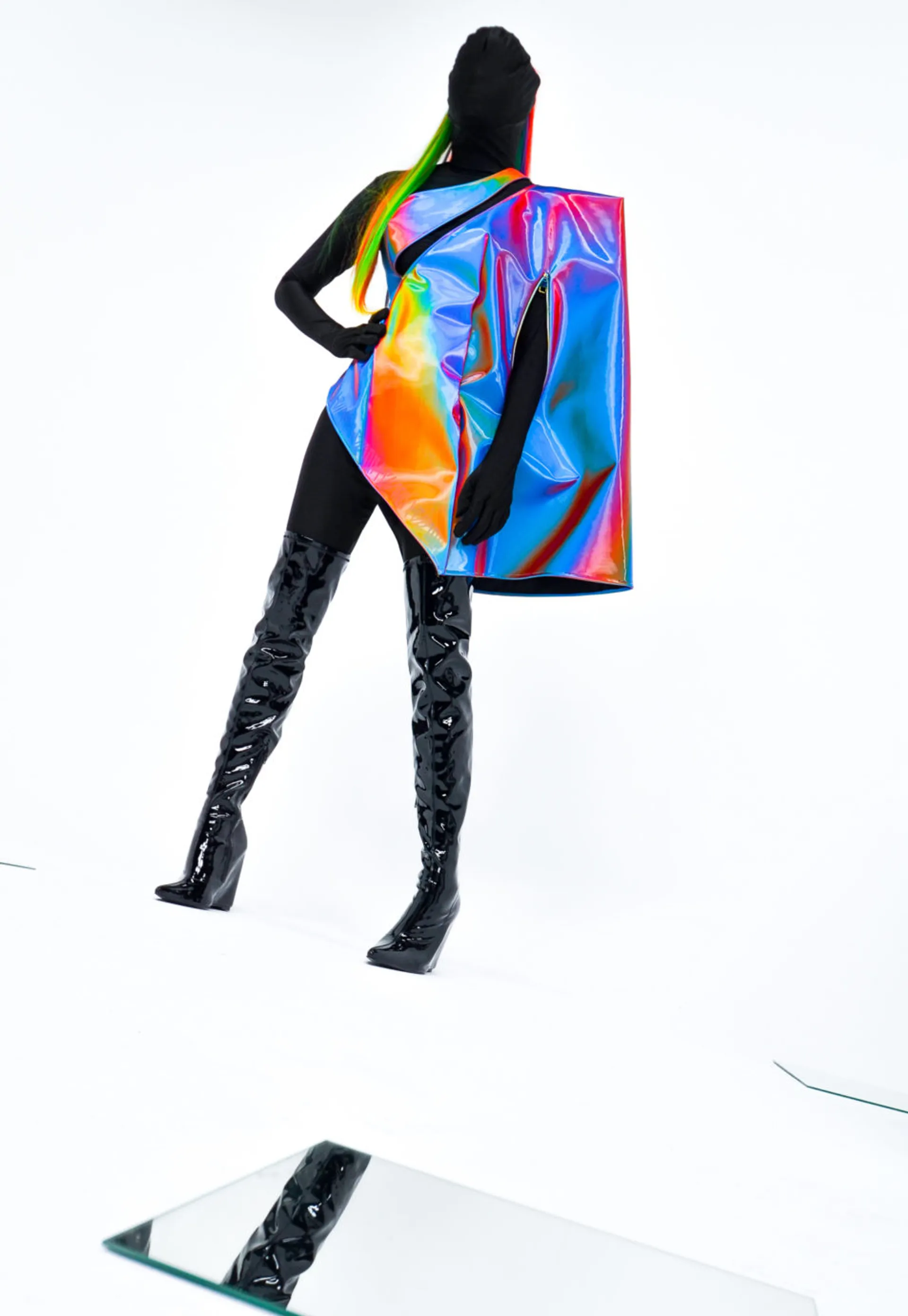 My collection is a deep and vulnerable insight, into how the world is perceived through my own eyes, and the eyes of other synesthetes, who live with the neurological phenomenon known as Synesthesia. “Synth” (which means “together”) and “Ethesia” (which means “perception”), is the stimulation of one sensory cognitive pathway, leading to automatic, involuntary experiences in a second sensory cognitive pathway. In my experience, letters, numbers, words, and shapes shift colours in different scenarios, or fonts, but mostly stay the same. As I am also Dyslexic, I see letters and words in different sizes, reflections and swapped positions. This uncontrolled stimulation of the brain can cause sensory overloads. For myself, these circumstances are calmed by bathing in ultraviolet light, stripping all colour from the visible spectrum within the surrounding environment. The 5 outfits of this capsule collection are each paired with the 5 senses that are affected by my condition, and partnered with 5 letters that make up my surname / brand identity. I perceive these letters to have 5 separate colours, smells, and tastes, manifested in this promotional package, representing stages of under to over stimulation, all of which are involuntarily impacted by shape, colour, and environment. Please submerse yourself in this collection that represents the physical embodiment of how I view the world. Explore the smells, tastes, textures, and colours, in this environment, and interact with them using all 5 of your senses, to expose the reactants, effects, and products, of multi-sensory interaction.