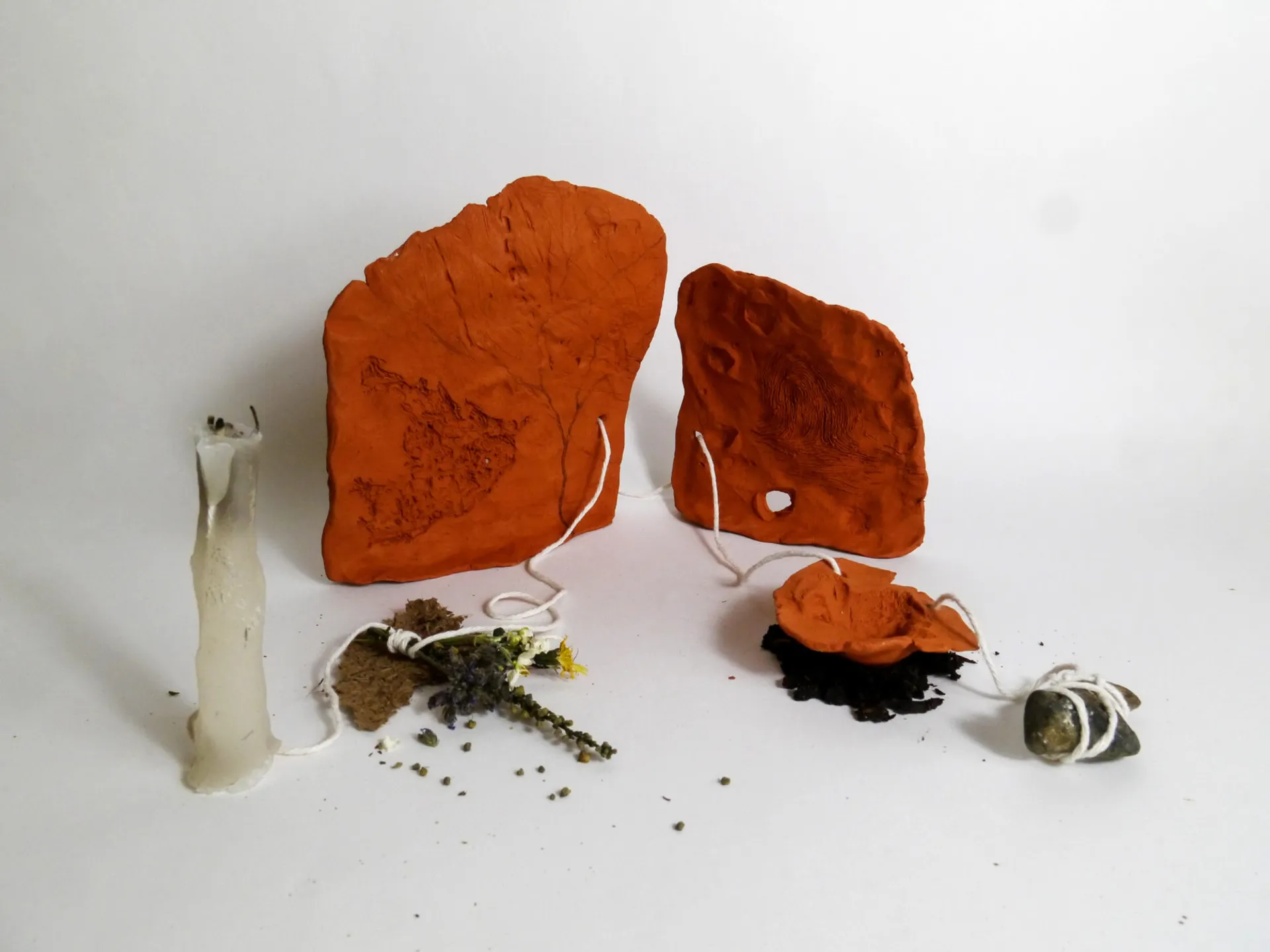 Many pieces incorporate raw clay found at sites local to the artist, which are then hand processed, and clumps of earth displaced and encased wax. The process of these sculptures is transformative, collecting fragments of the environment to create physical beings that incite a meeting of presence and ephemeral of history. Sourced locally, clay has been displaced from the ground by another. The temporal material of sedimentary rock, resting in pressure and warmth in the ground only to be removed for our purpose. From the mountain to the brick or bowl, to our home.