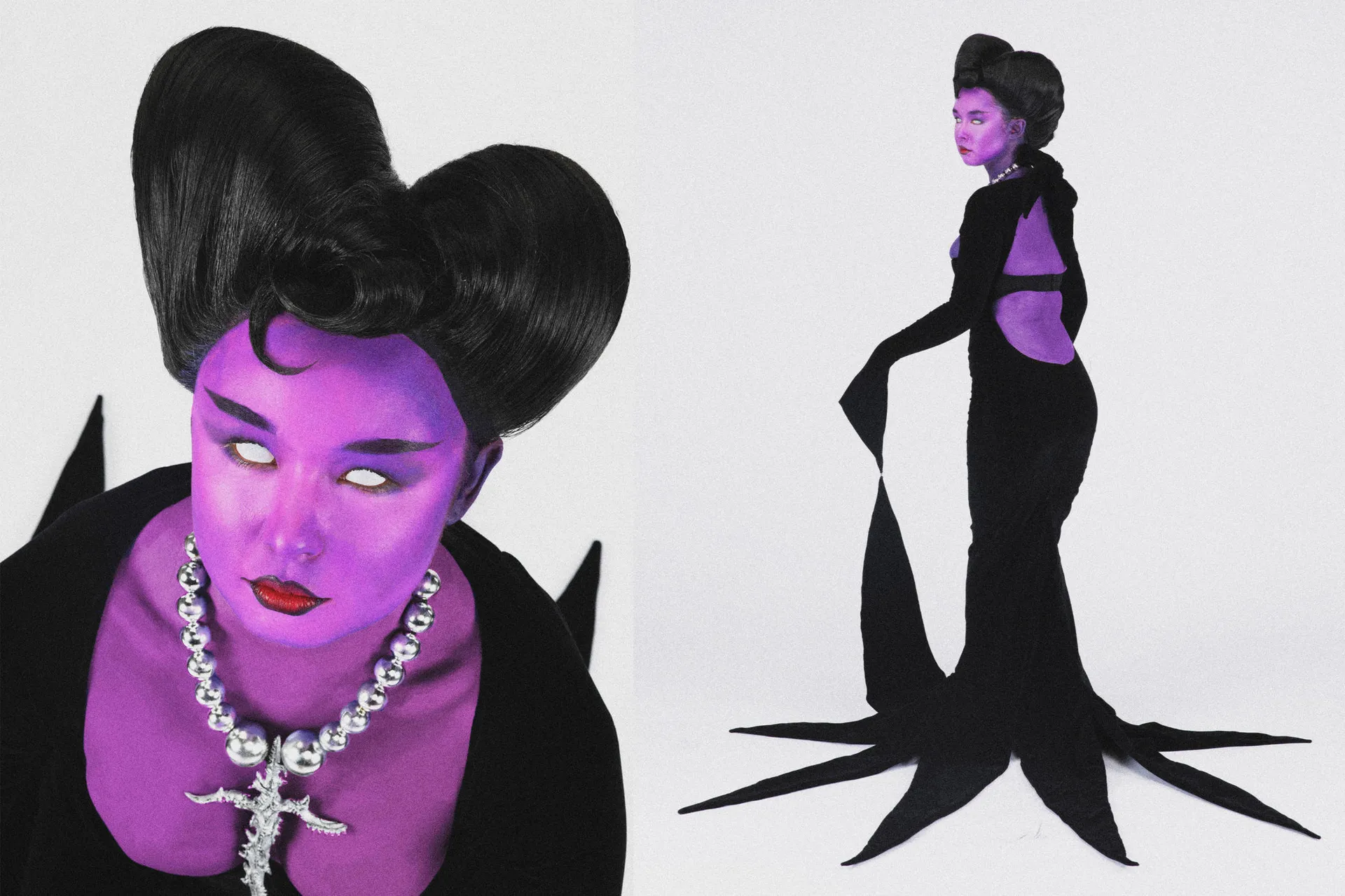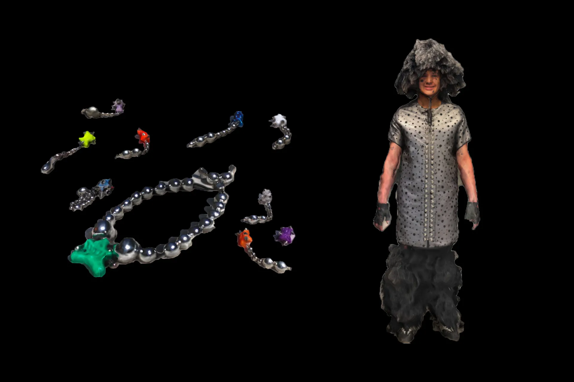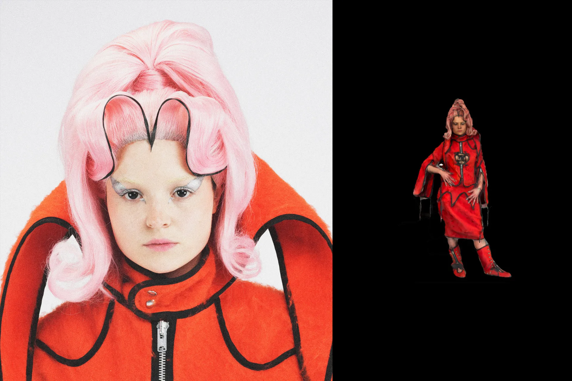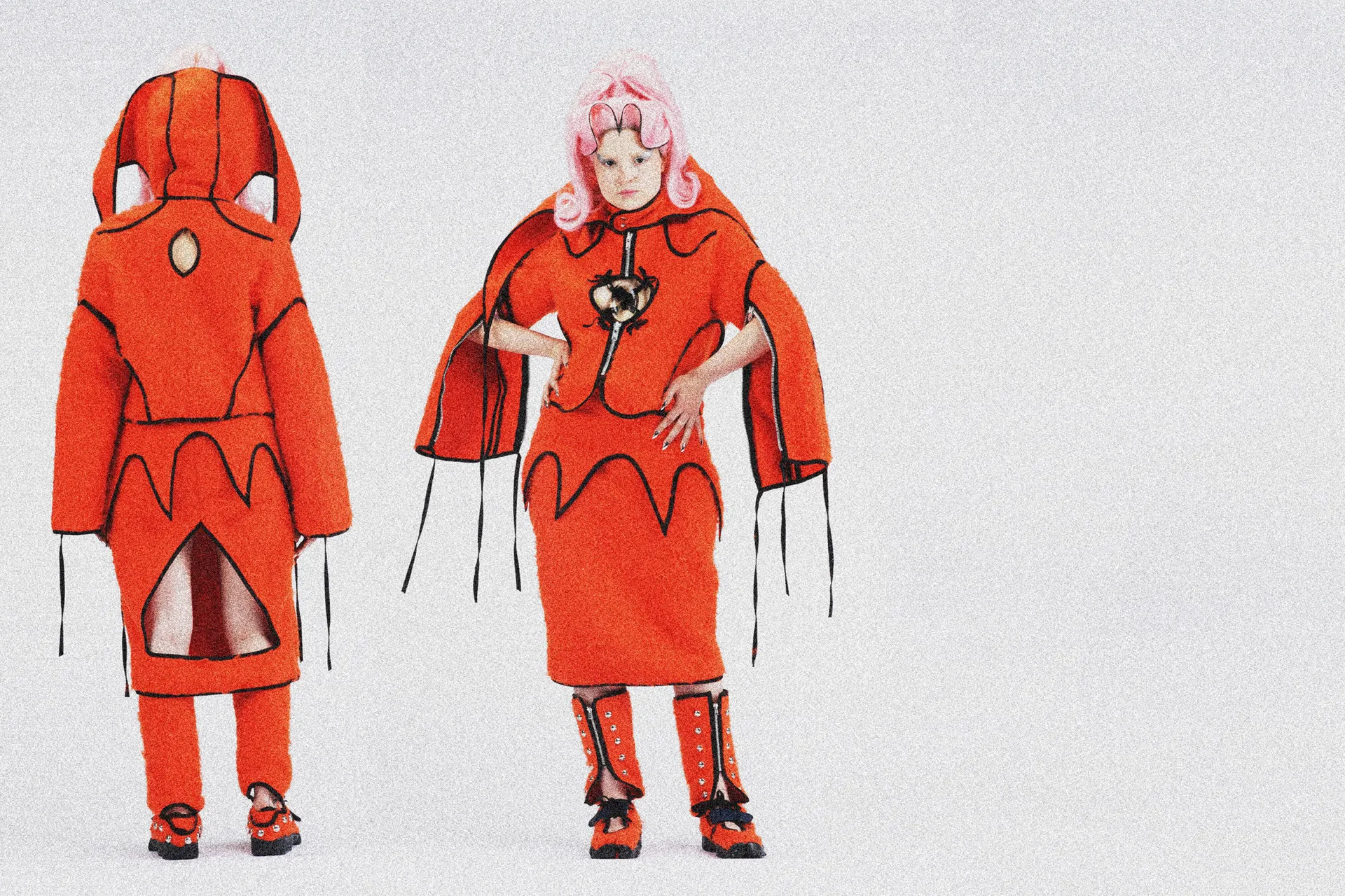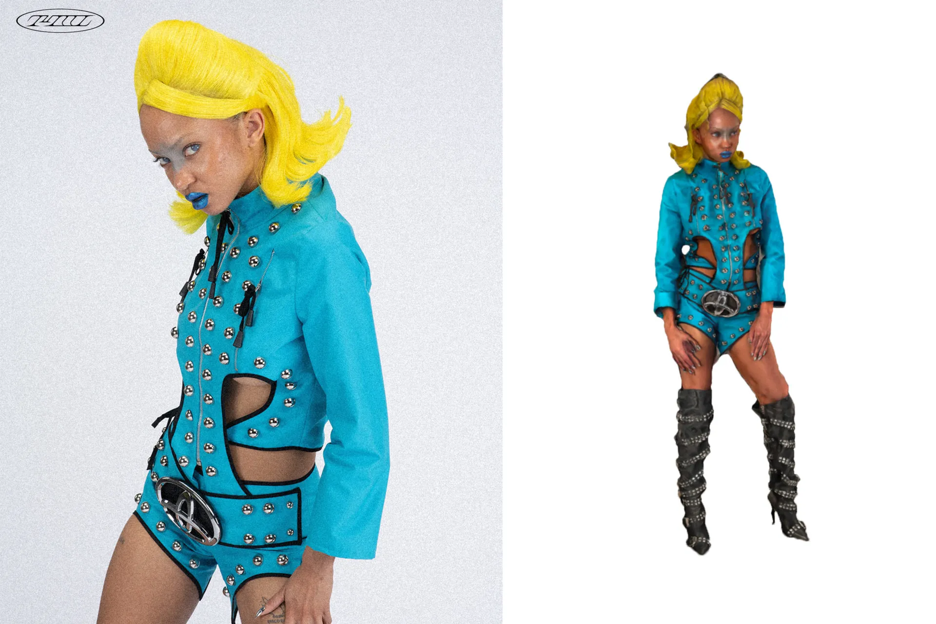 Milli Vol.1 consists of a few aspects. I have been heavily in-fluenced by retrofuturism and films such as Barbarella, The 10th Victim, Liquorice Pizza and The Love Witch. Focusing on the theme of a future that never came to be or films that have a 70s aesthetic. My designs have been inspired by sat-ire, soft porn and have a camp nature. Taking aspects of this era and combining them with tech wear references from the 21st century the collection Milli Vol.1 is a refelection of my upcycling process and love for collecting second hand toys. I have involved my upcycled jewellery brand PrincessPlastik within Milli Vol.1 and elements of embellishment are a prevalent theme throughout.