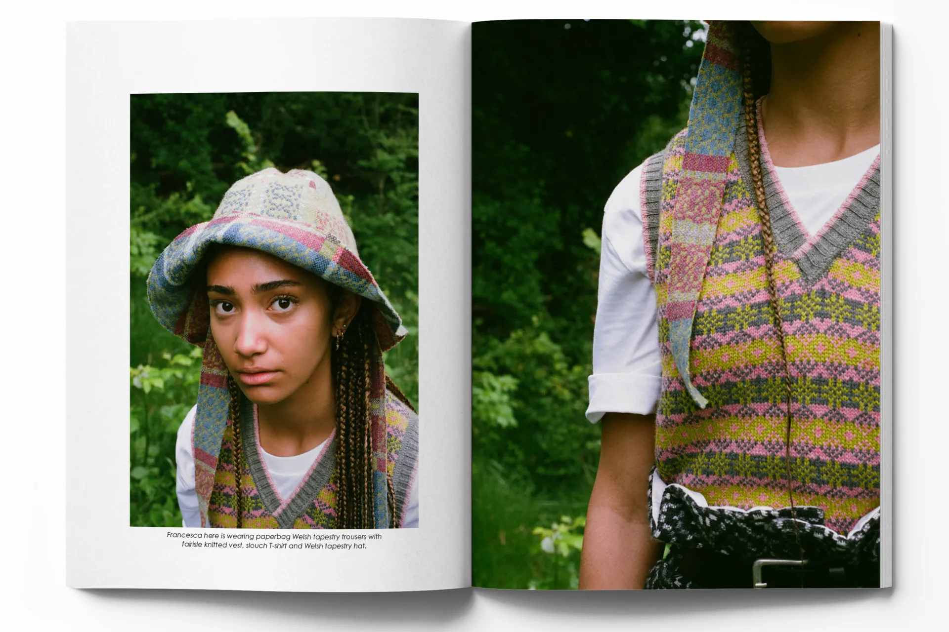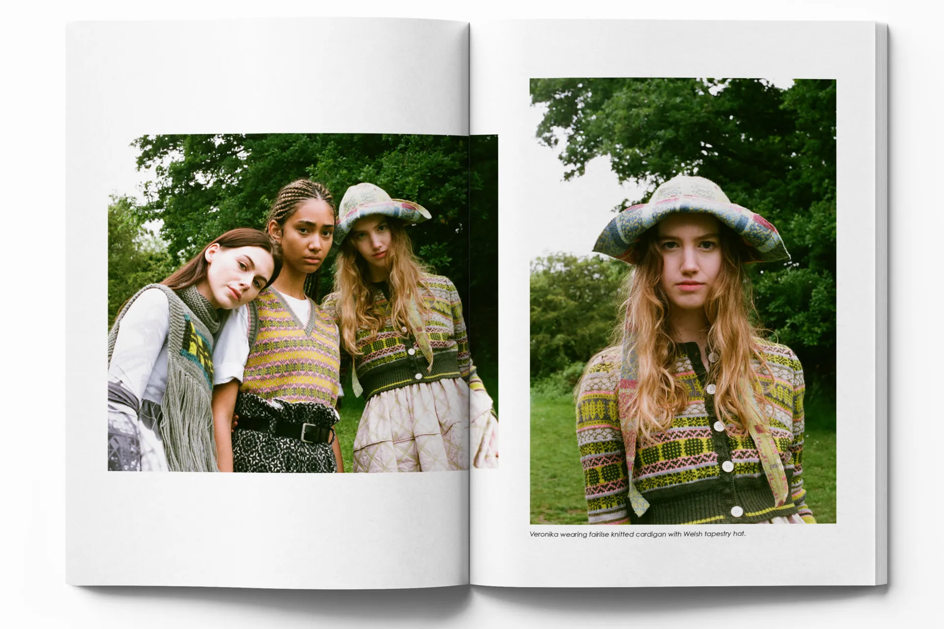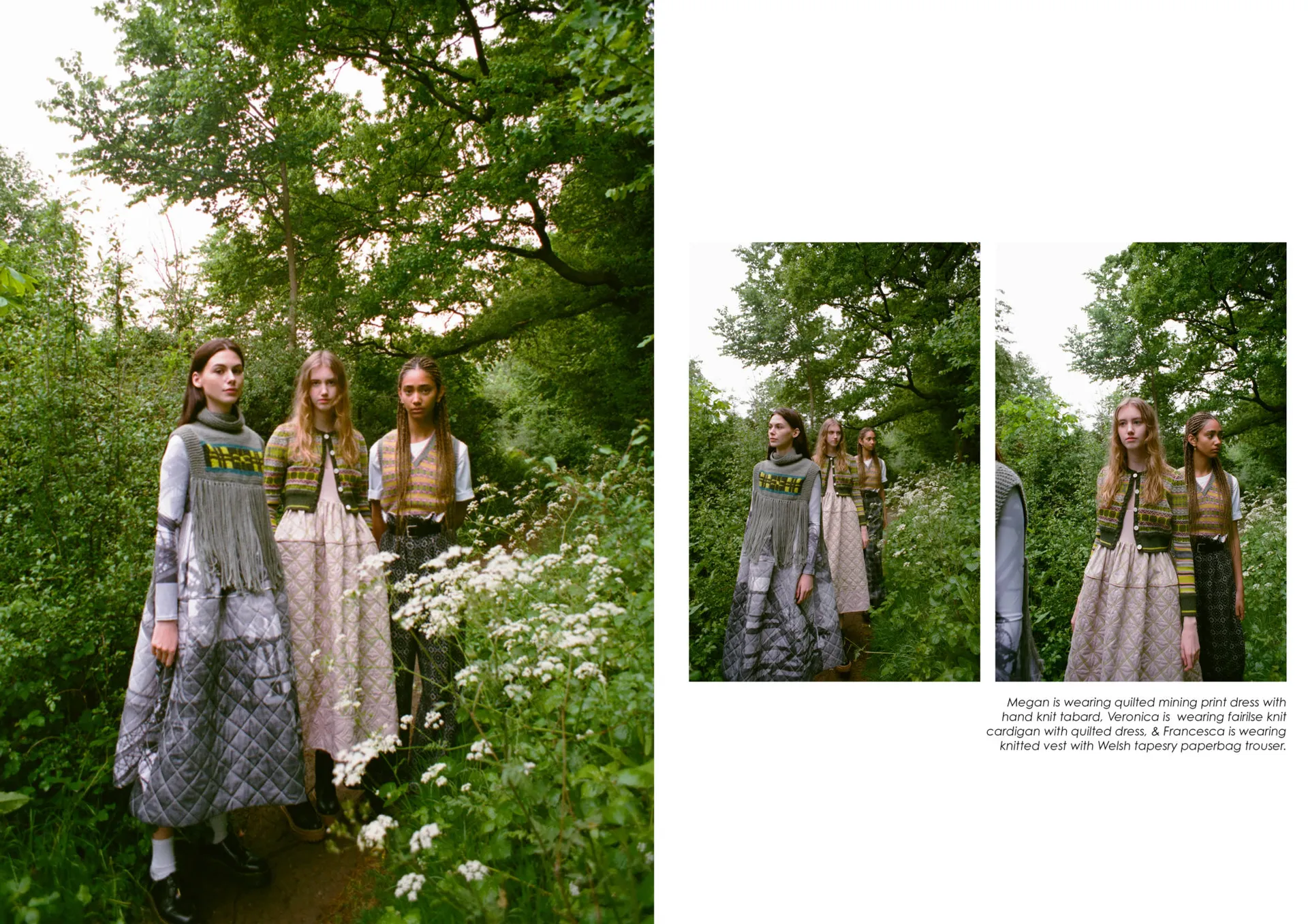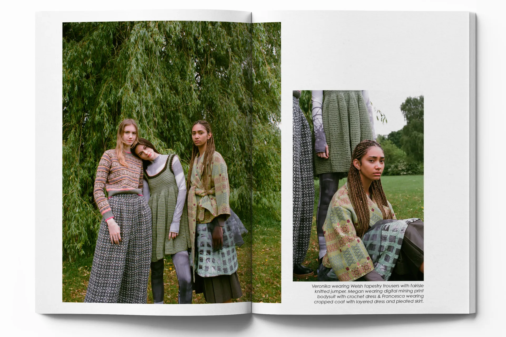 The inspiration for my final collection came from looking at my Welsh heritage and the desire to pay homage to that. The starting point for the research was portraits of Welsh women knitting in traditional Welsh dress from the 19th century, this informed the voluminous silhouette of the collection. The colour pallet of this collection has drawn inspiration from Welsh tapestry which holds a lot of heritage of Wales within its designs. I have reinterpreted these into my fair isle knit designs within the collection.