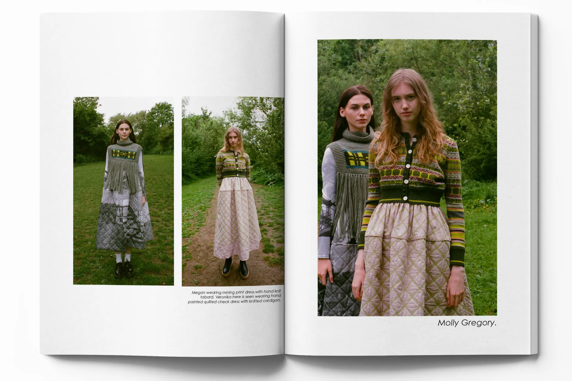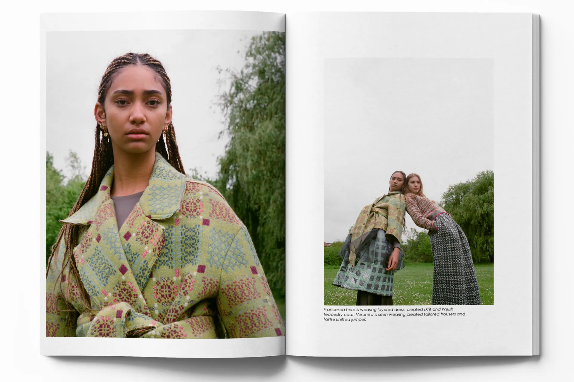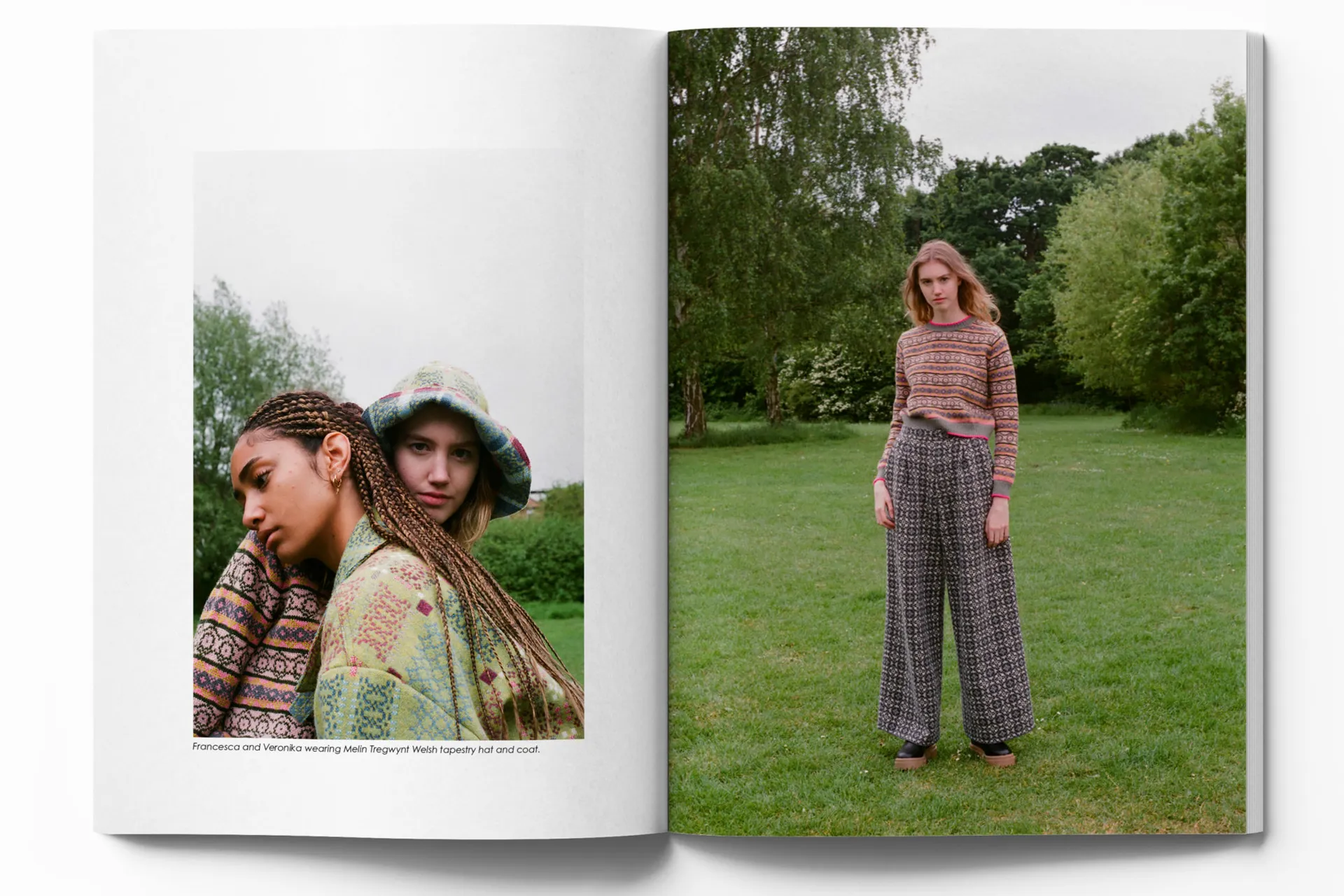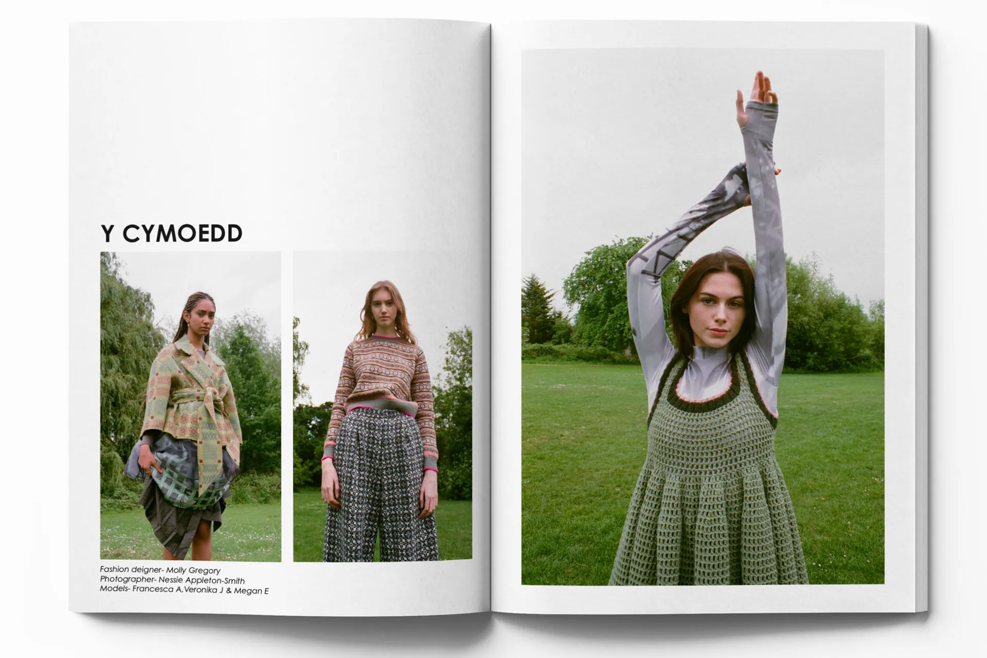 The inspiration for my final collection came from looking at my Welsh heritage and the desire to pay homage to that. The starting point for the research was portraits of Welsh women knitting in traditional Welsh dress from the 19th century, this informed the voluminous silhouette of the collection. The colour pallet of this collection has drawn inspiration from Welsh tapestry which holds a lot of heritage of Wales within its designs. I have reinterpreted these into my fair isle knit designs within the collection.