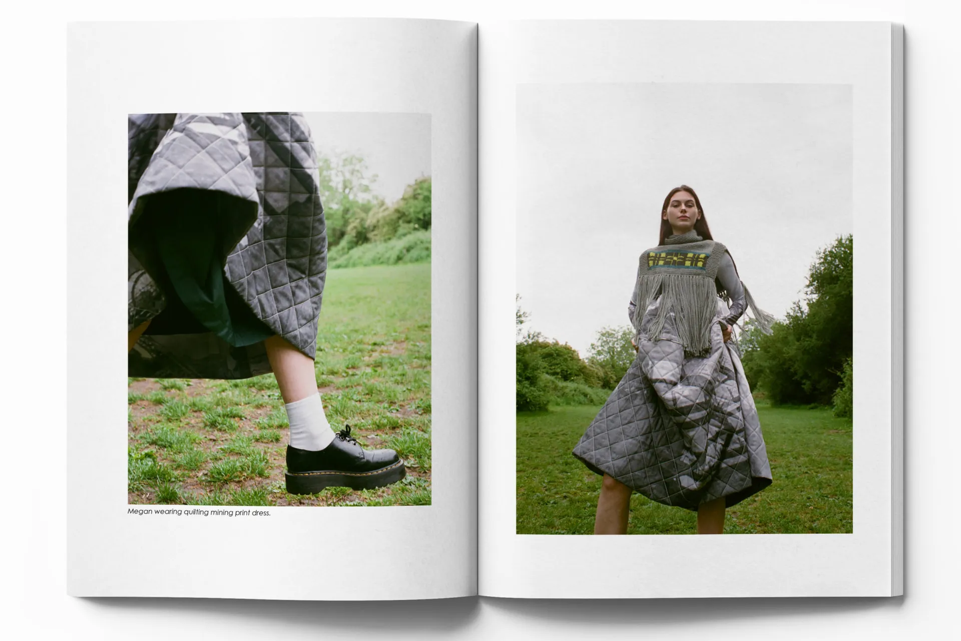 Alongside this research, I have also investigated Wales industrial mining roots by visiting a series of old mining sights and photographing them. The main being the World heritage site in the Blaenavon Valley called Big Pit which homed one of the largest mines in Wales. From these photographs, I created graphic digital prints which contrast the more feminine silhouette of traditional Welsh dress.