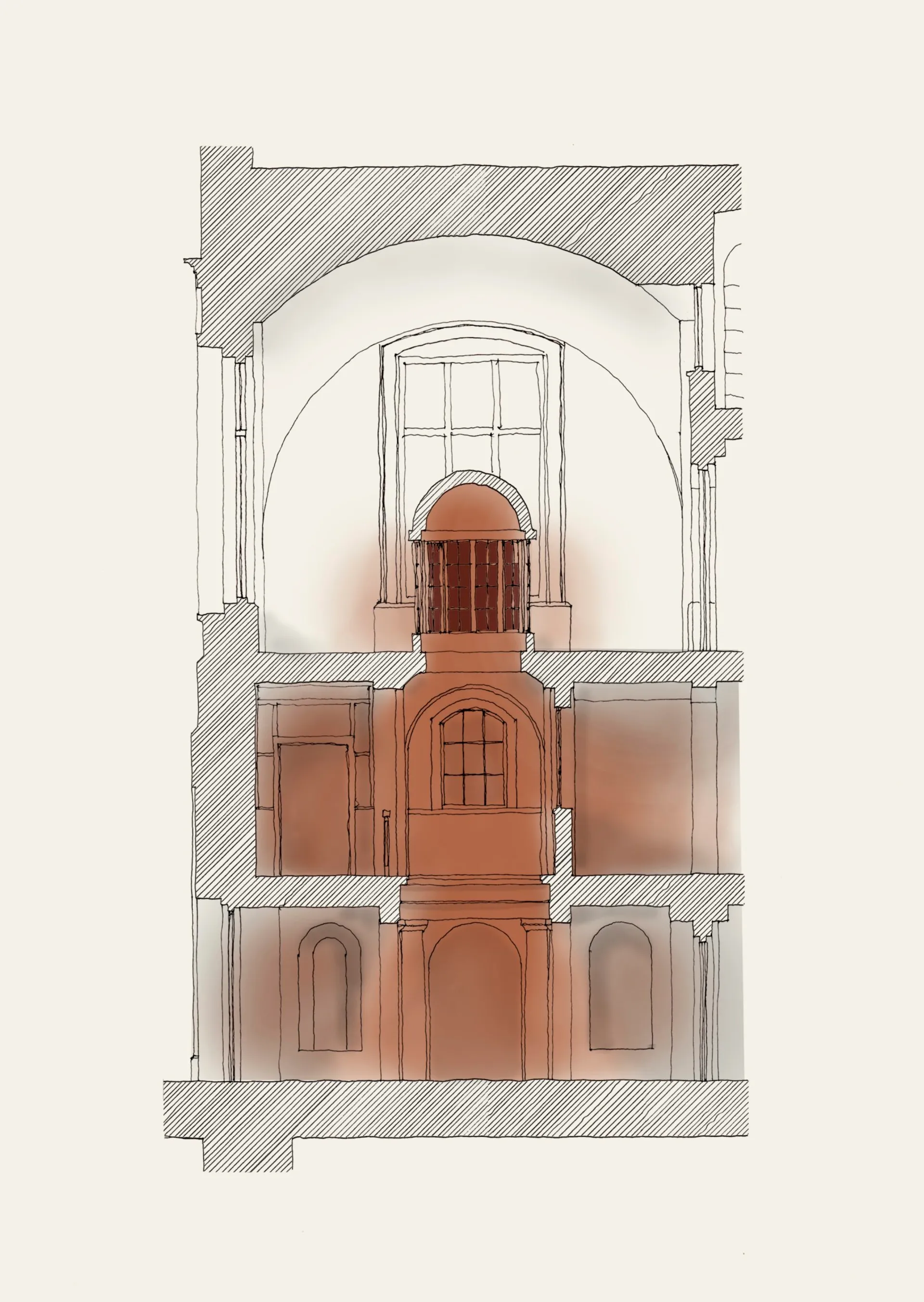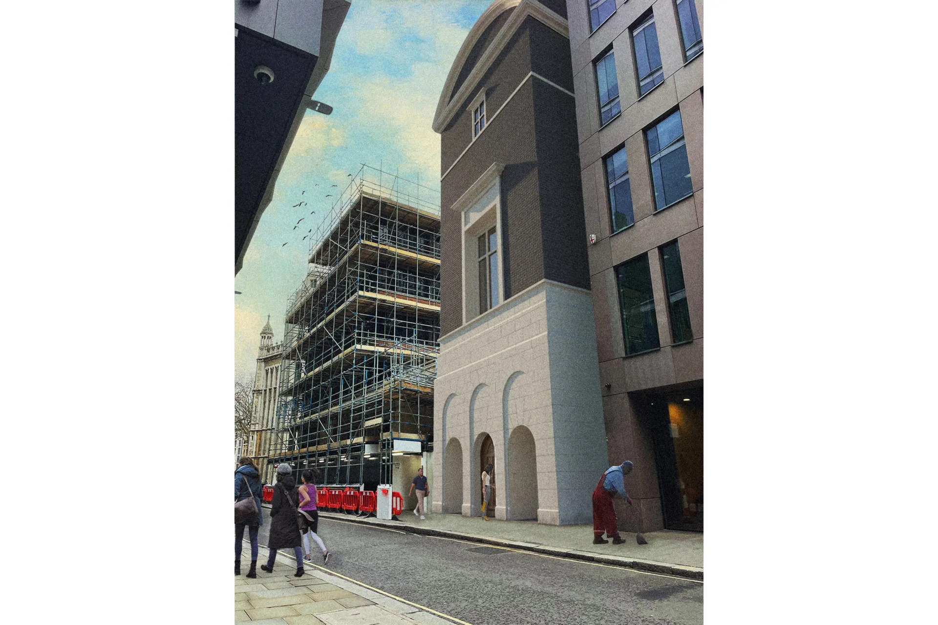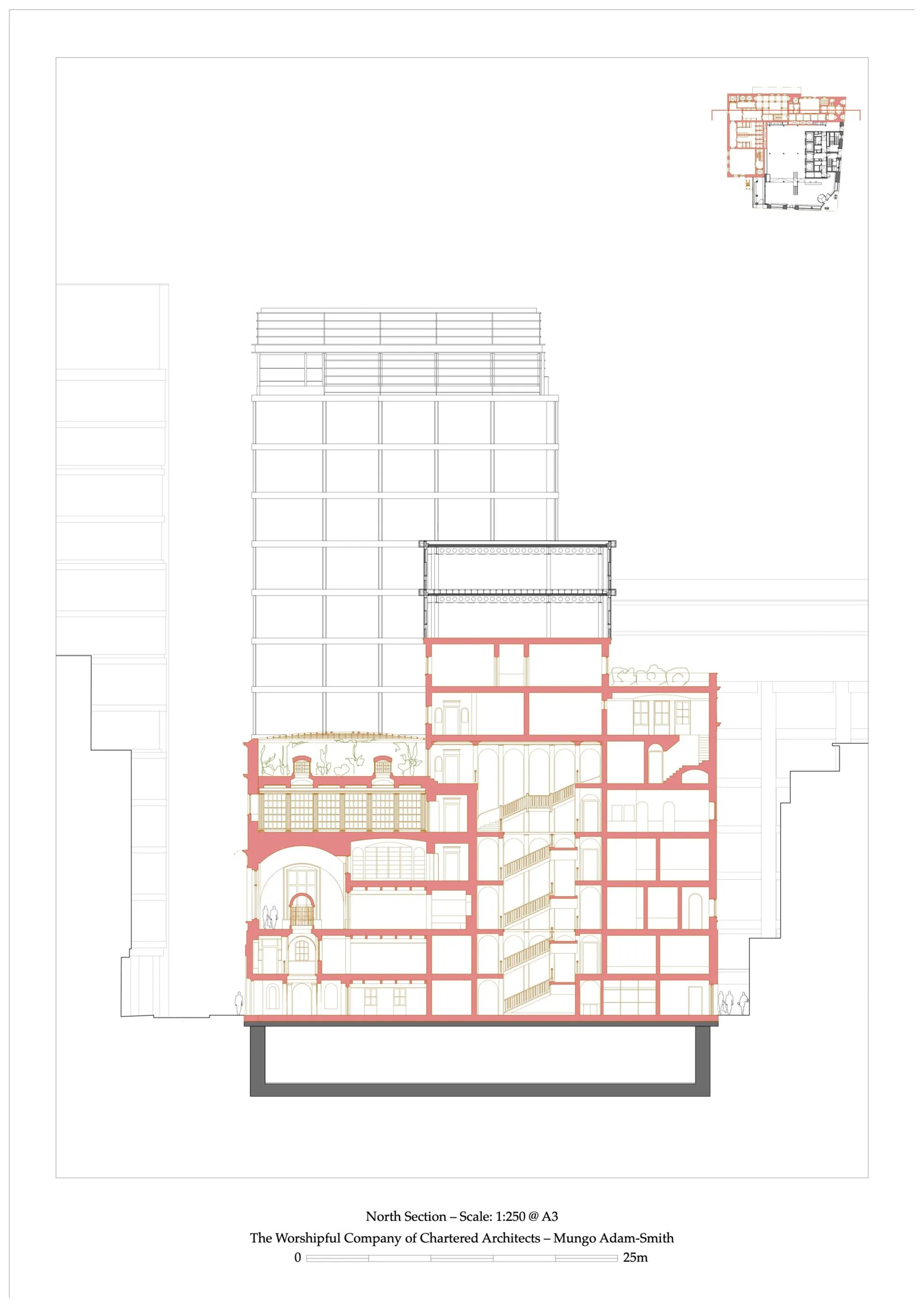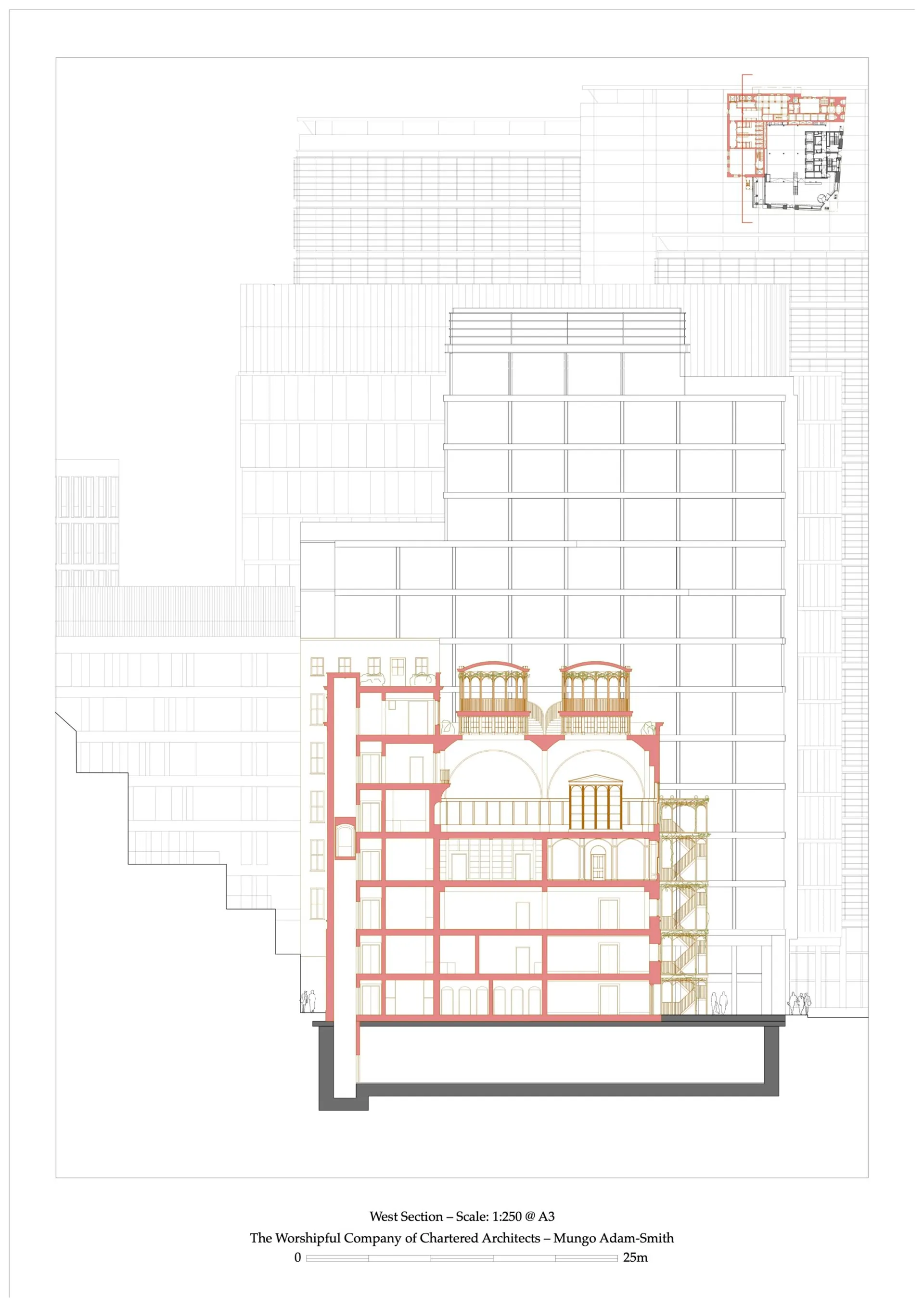 A new home for the Worshipful Company of Chartered Architects in the City of London. A black brick and Portland Stone Livery Hall which primarily explores the ideas of Sir John Soane. The building features a heavy use of arches, domes, rooflights and stained glass. The front elevation faces East towards the centre of the city with a moody entrance vestibule setting the tone for the rest of the building. Main spaces inside include a vaulted top lit Hall and heavily panelled Court Room on the third accessed via a grand staircase inspired by the roman mechanics of Italy’s aqueducts.