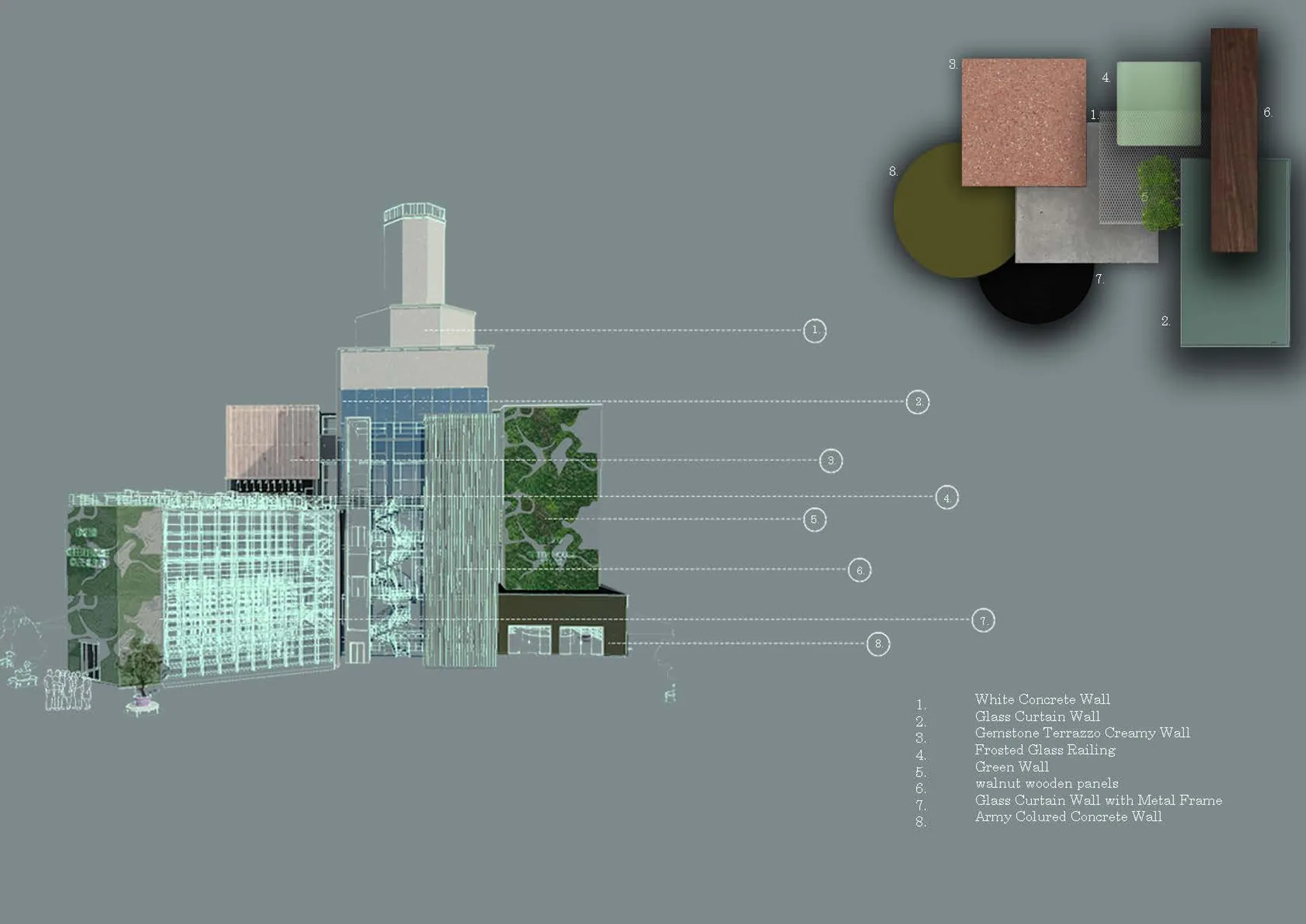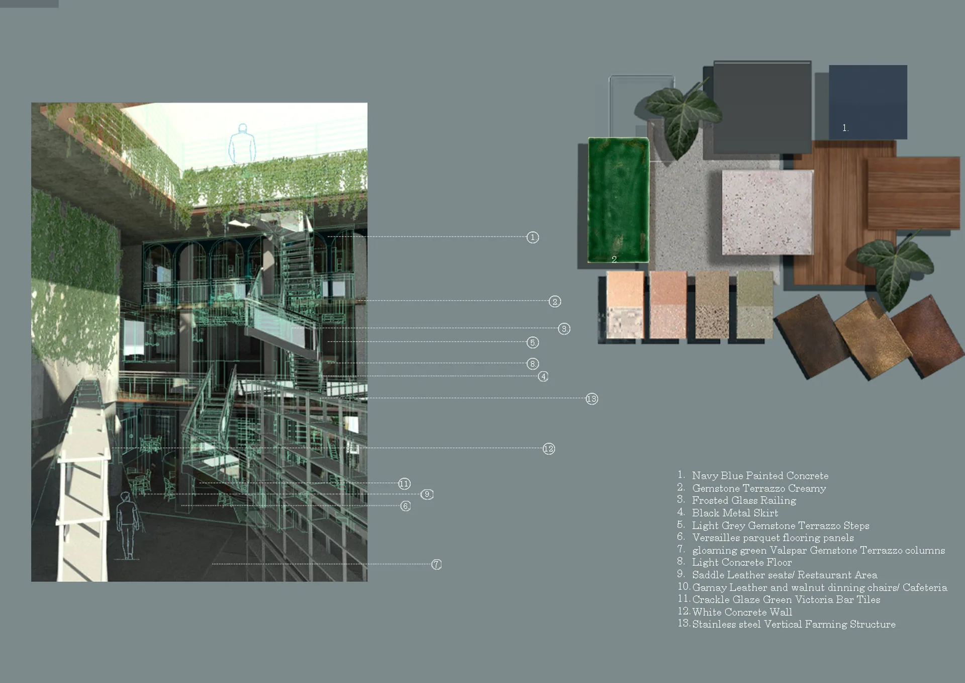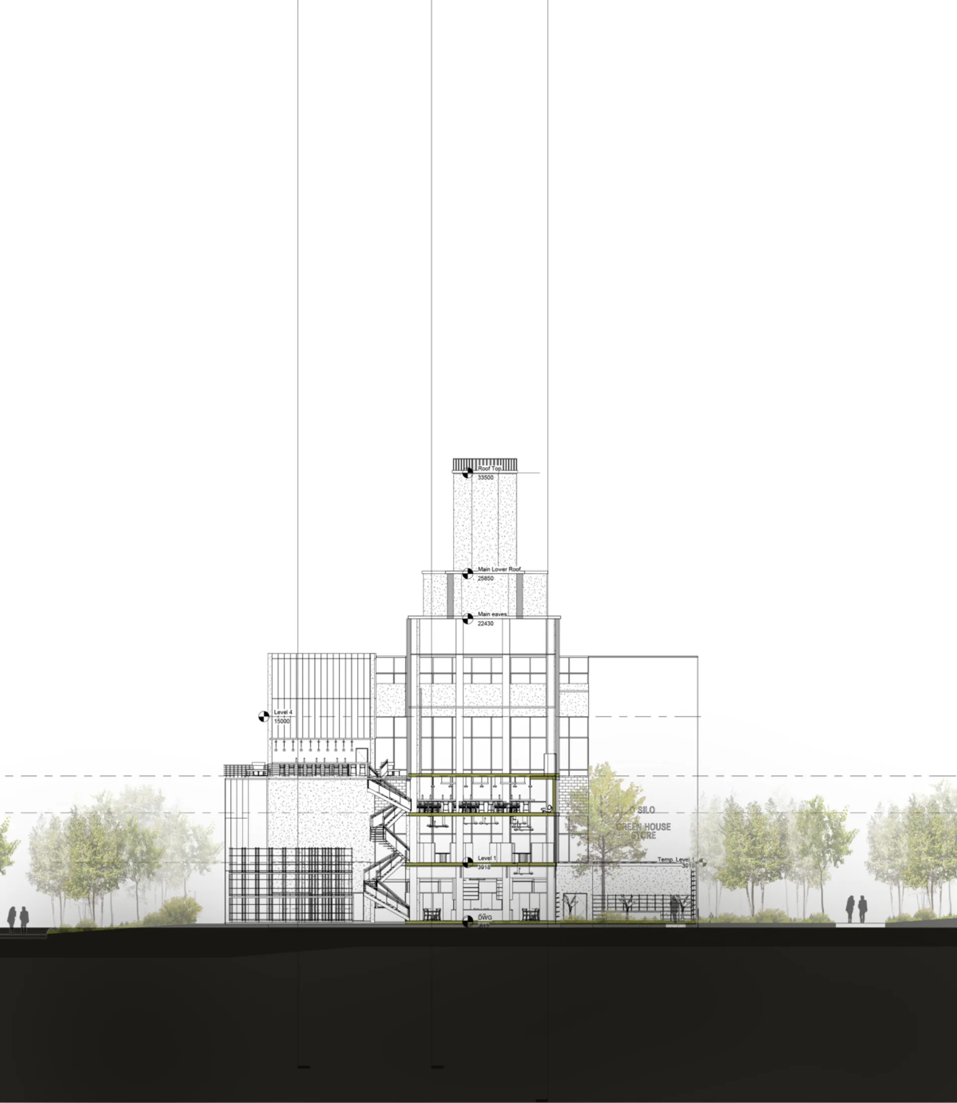 This Project is focusing on creating a new Space for the Newham Community, opening a restaurant and a community vertical farming greenhouse, as well as a Biomaterial Retail space. This project should give a significant and beneficial experience that would educate, encourage and improve the way of life for the community. This Building is a restored grade II listed grain silo, and is best known as the ‘D’ silo on the site of the already demolished Rank Hovis Premier Mill in West Silvertown, London Docklands. The silo D filled significant roles throughout the centuries and became one of the well-loved icons of post-industrial Britain. It is important to maintain the building’s characteristic beauty and make a stronger connection with the local community by designing a place where people can improve their apprehensions and understand the importance of the circular economy and sustainability in their lives, finding actual examples for recycling and introducing them to the future of the vertical farming. As a result, this project should improve and support the community with a combined objective towards a new and sustainable method of living, educating today’s generation for the possible solutions of the future through circular economy, allowing them to implicate this in their own lives.
