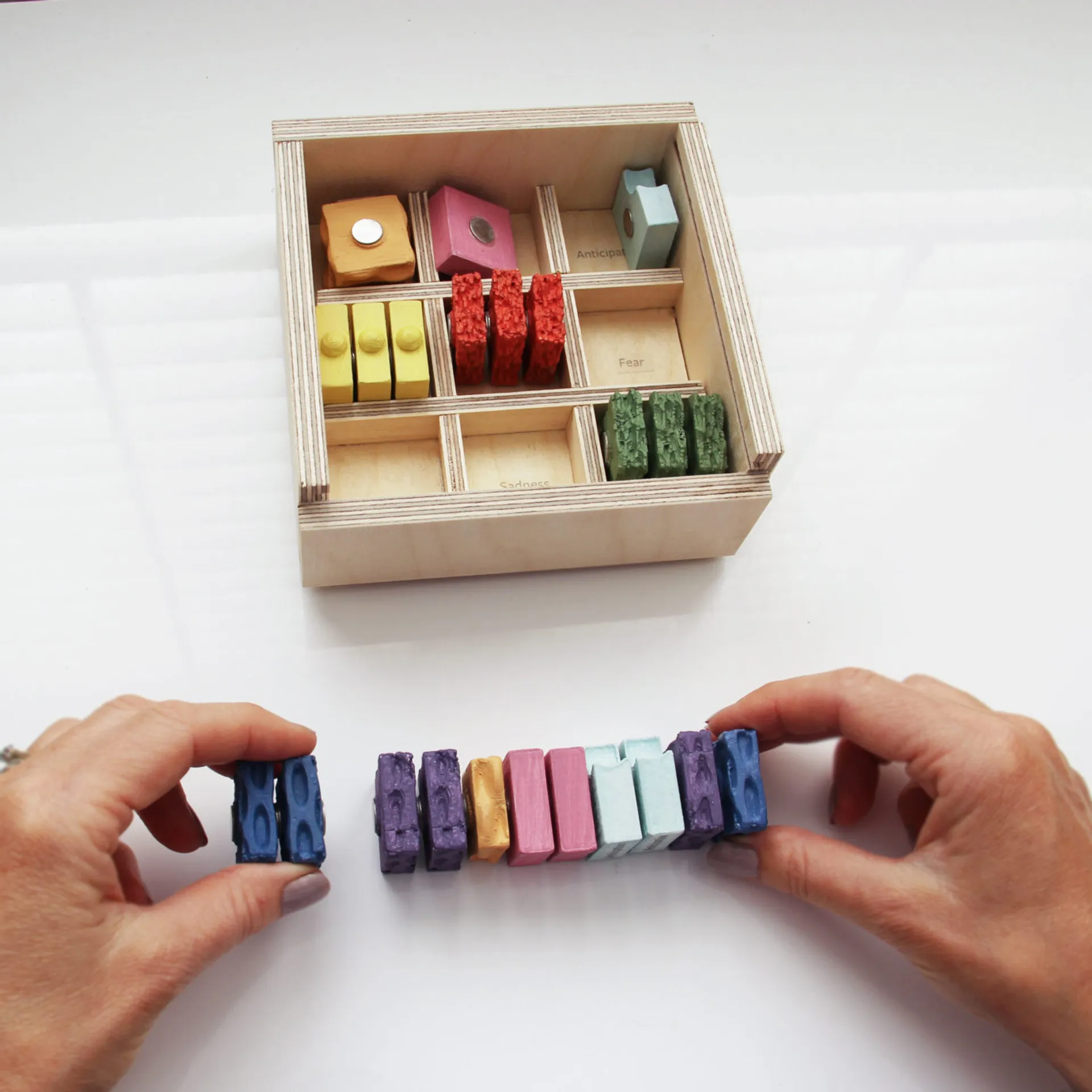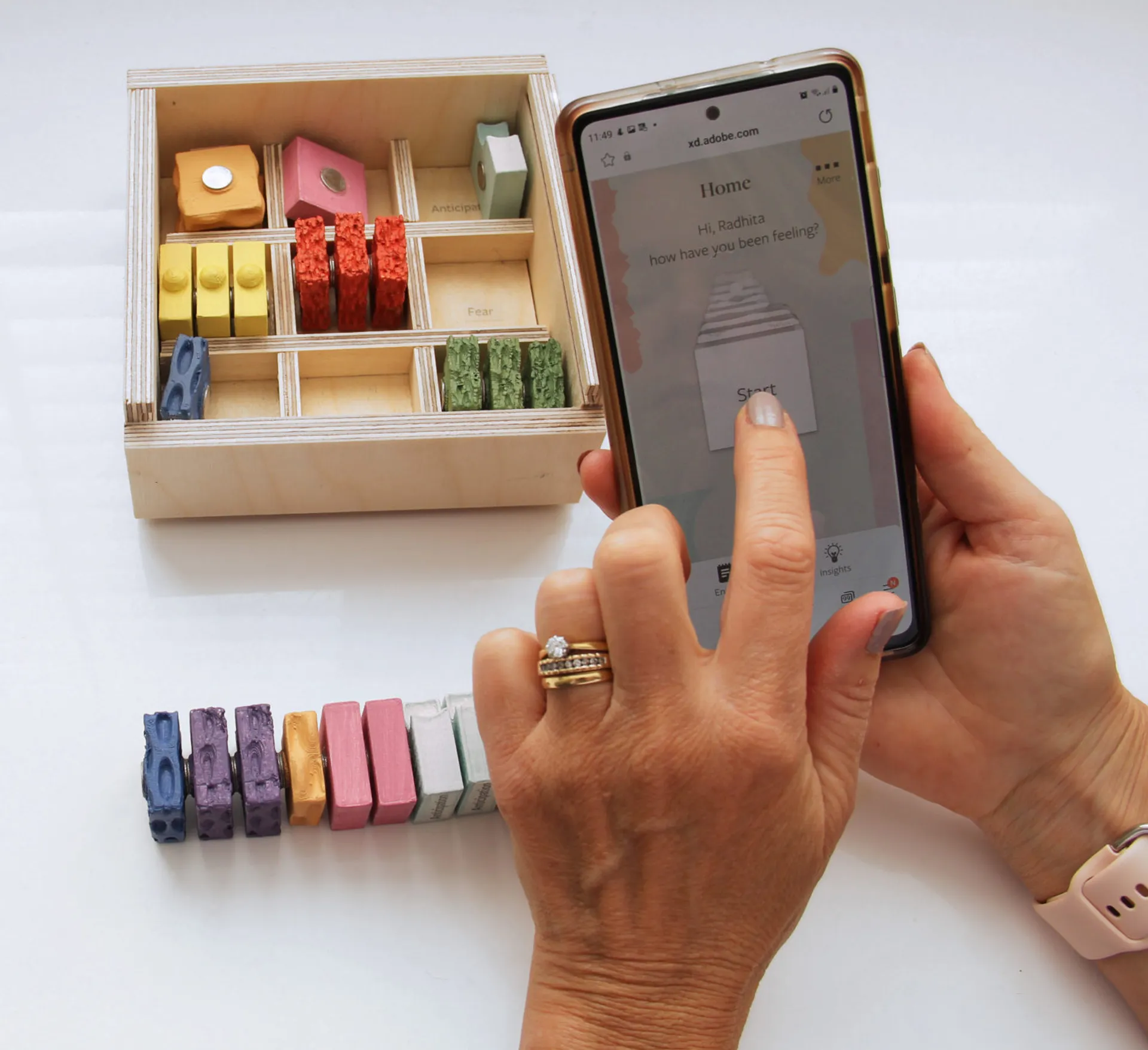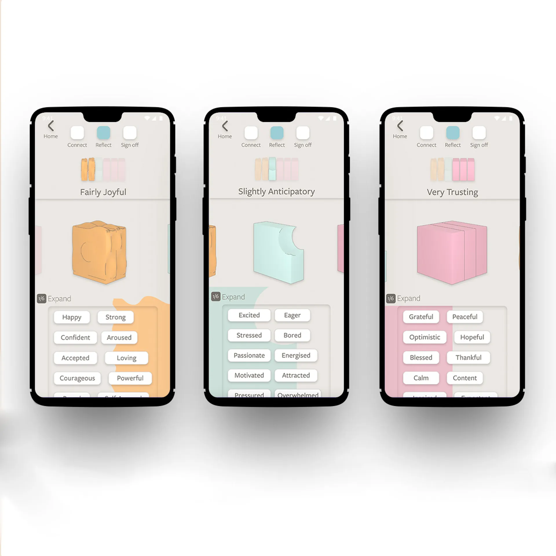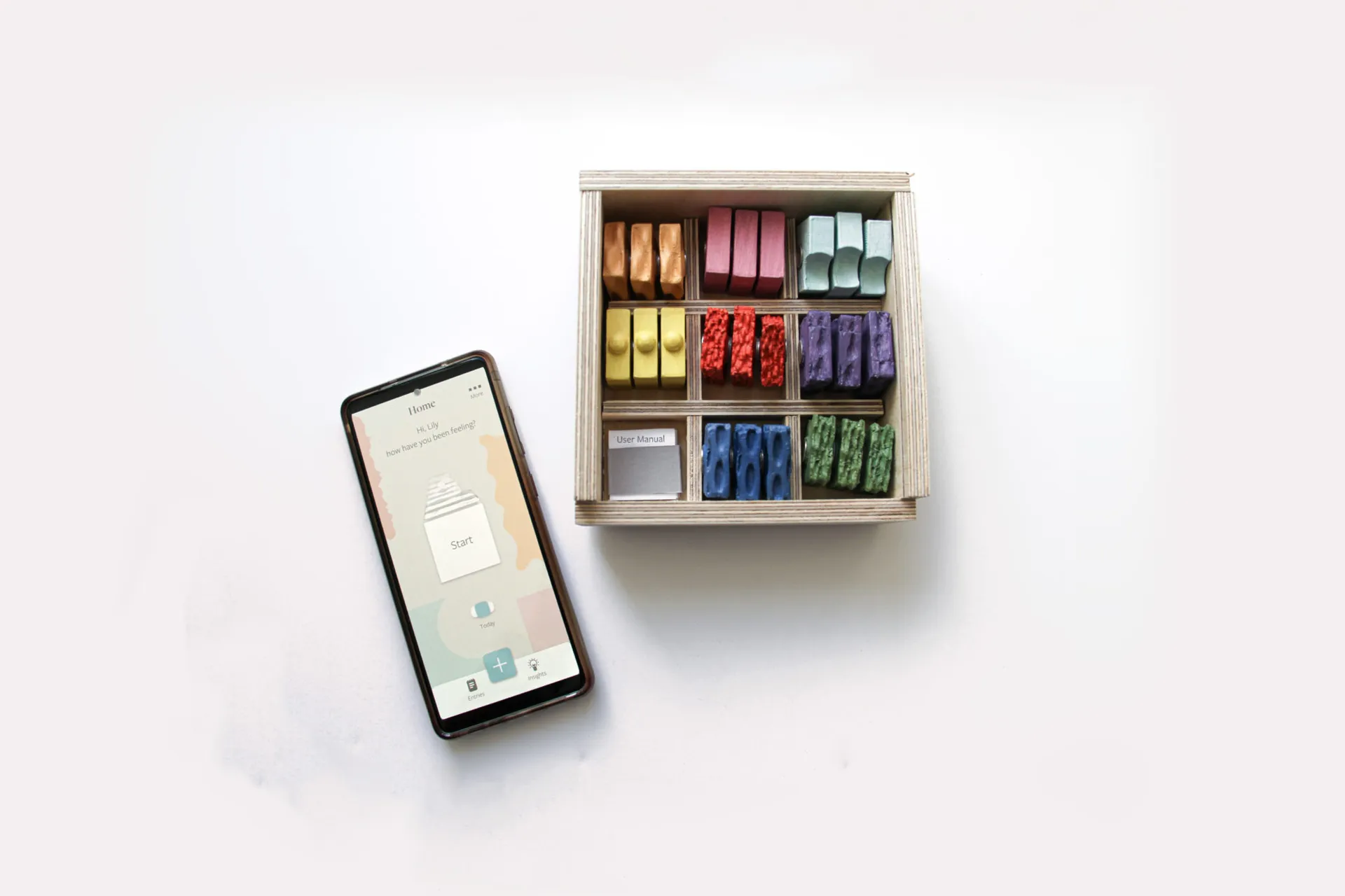 This involves a physical, customisable box of blocks representing the user’s chosen emotions, and an accompanying therapy app that I proposed to sync to the blocks via bluetooth. This aims to reduce the view of digital data as an inhibitor of mental health identity, and increase user engagement within mental health apps.