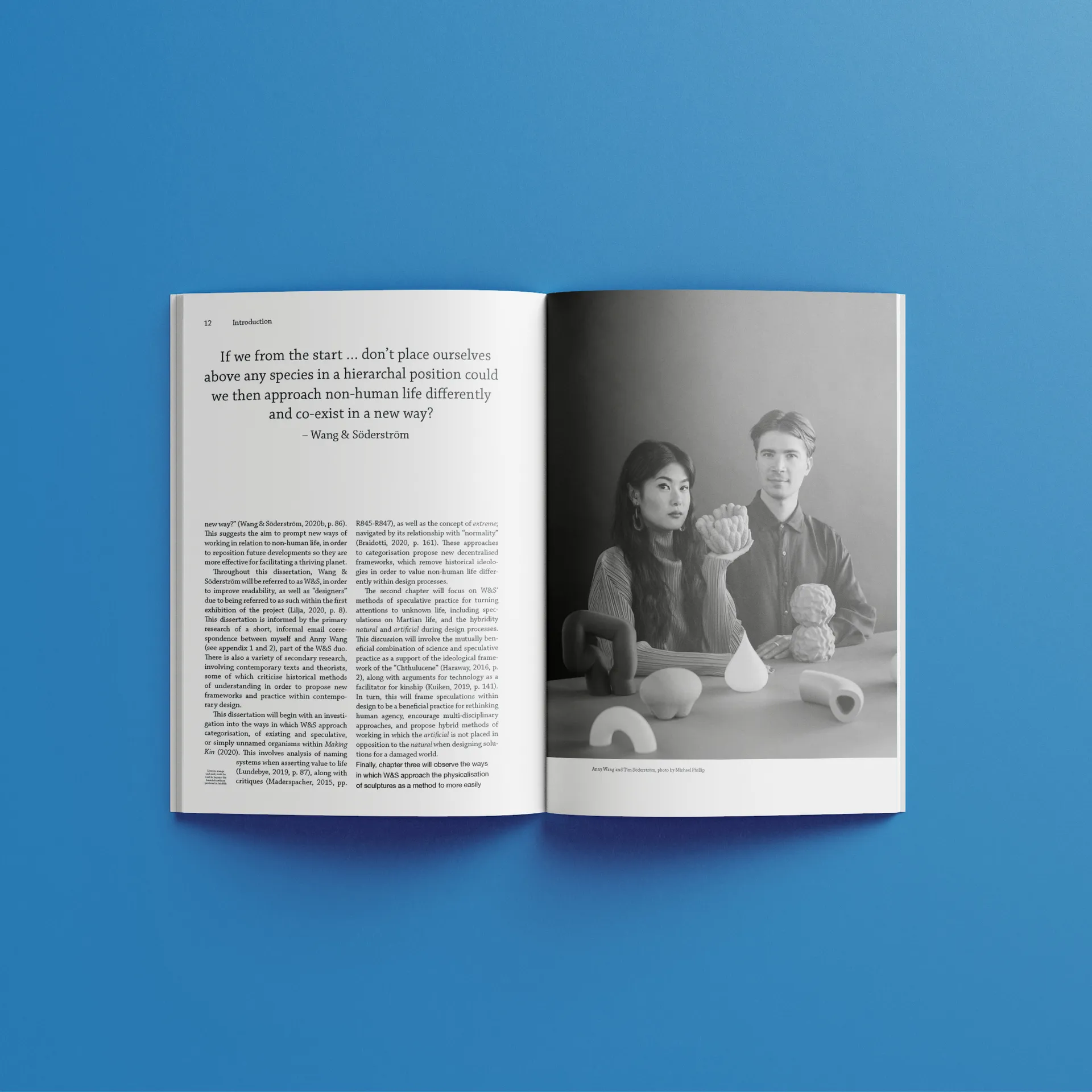 This is a publication containing a dissertation on the use of sculpture design to understand nonhuman life. Accompanied by external essays, examples of relevant art and photography. Held within a 3D printed slip case presenting a selected sculpture within the collection Making Kin, by Wang & Söderström, the outcome draws on contemporary discussions on the hybridity of digital and physical design and its impact on the comprehension of the human to non-human relationship.