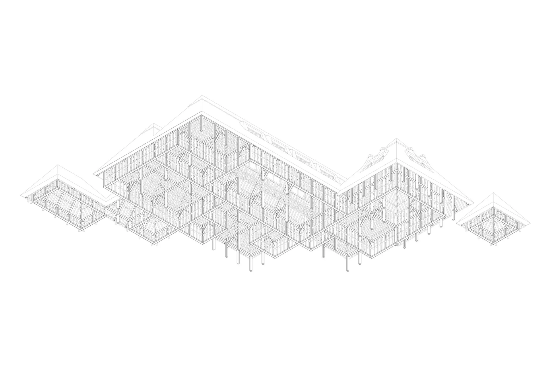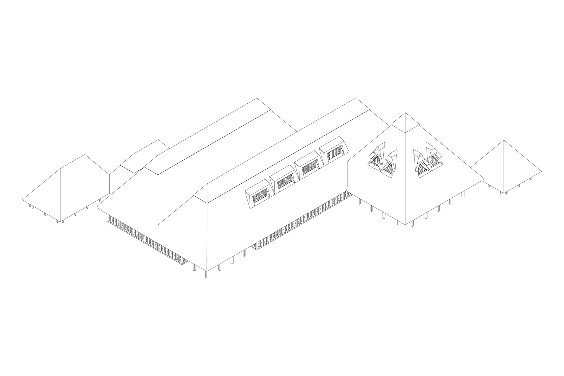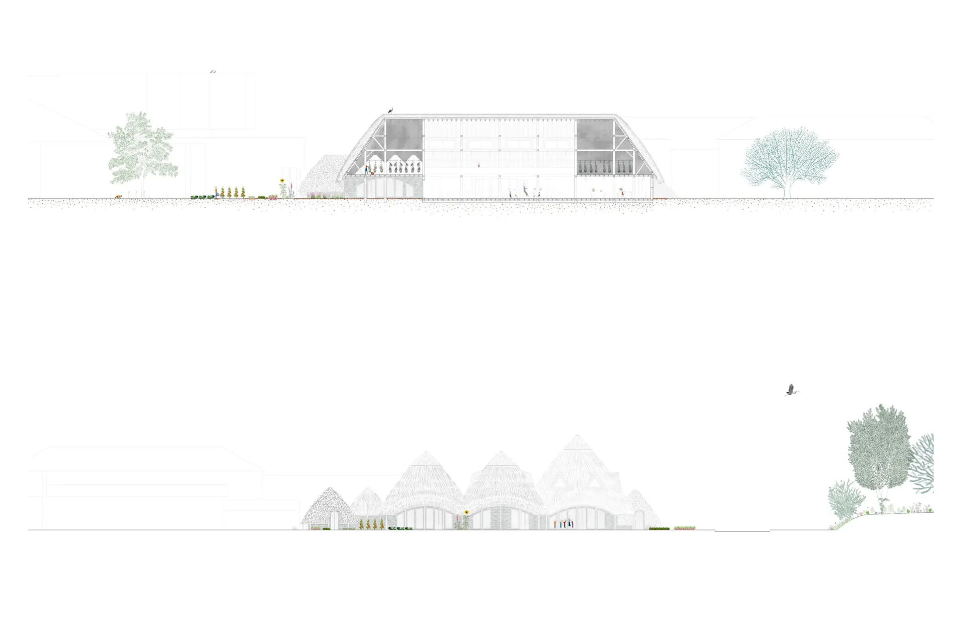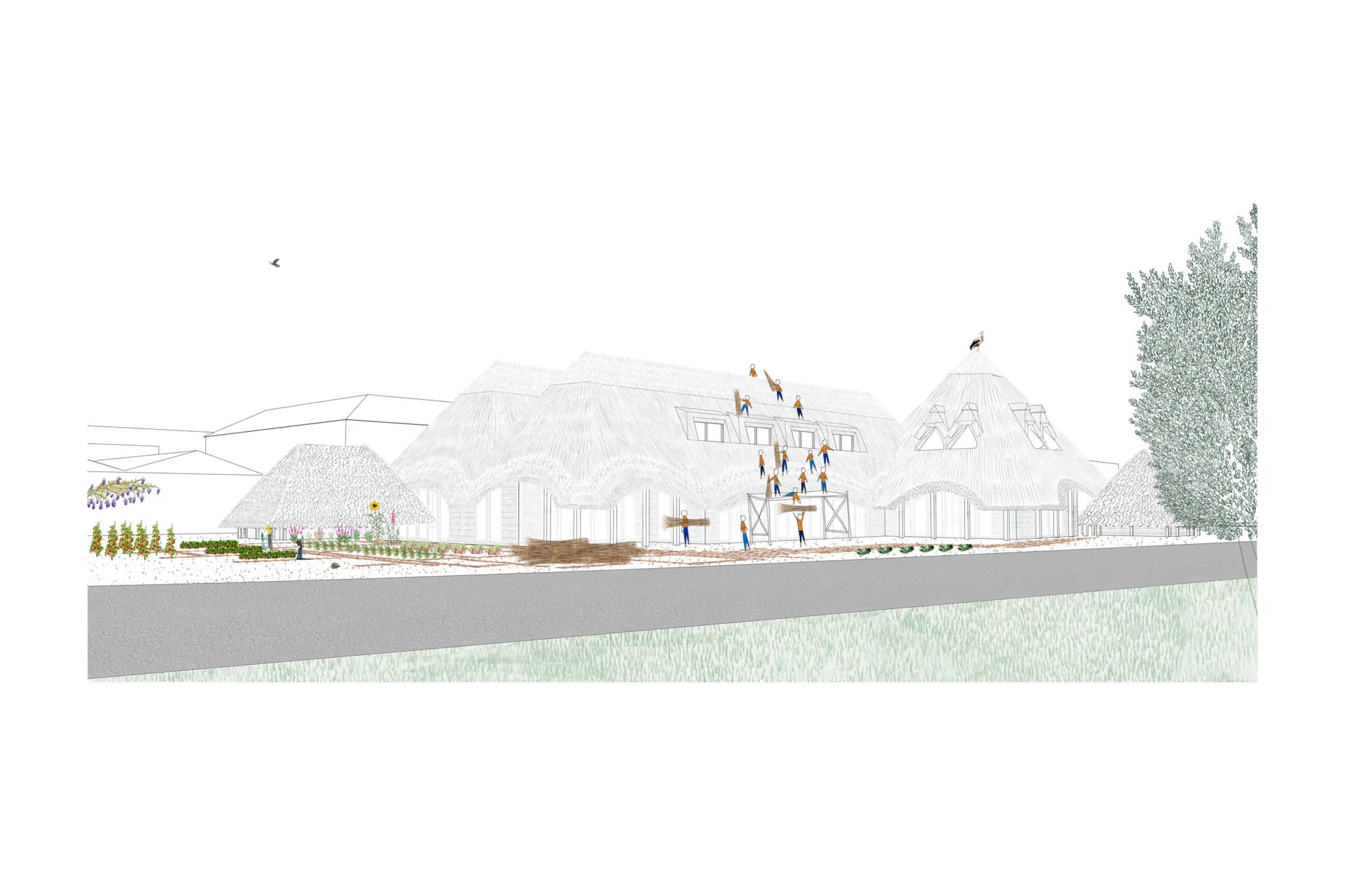 The future of the Tolworth School of Food includes expanding the thatched roofs with forms inspired by industrial buildings into the industrial estate. By doing so, new urban farming spaces will be created as well as bring back a traditional craft of thatching, perhaps a new strategy for industrial estates. With this expansion, a new water hose festival is introduced where water hoses placed around the industrial site guarantee fire safety and create a community festival celebrating their area.