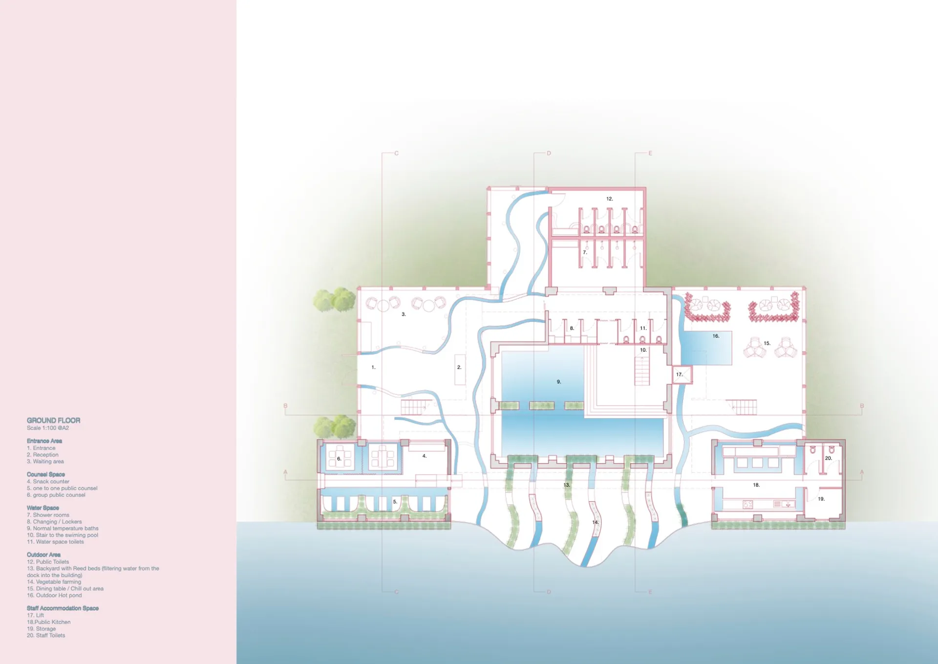 For my Major Project, I purpose to create a wellbeing centre, focusing on young teenager that experience mental health caused by family problems or home-life problems. The proposal will play with water and nature, the water will create energy to repair, renew and refresh to prepare you for new experience, new world and new acquaintance. Water makes a form of flow that brings calmness to our heart, wash out the fear and the badness, and encourage us to be careful in every stage in our lives as the water flows away and never comes back.