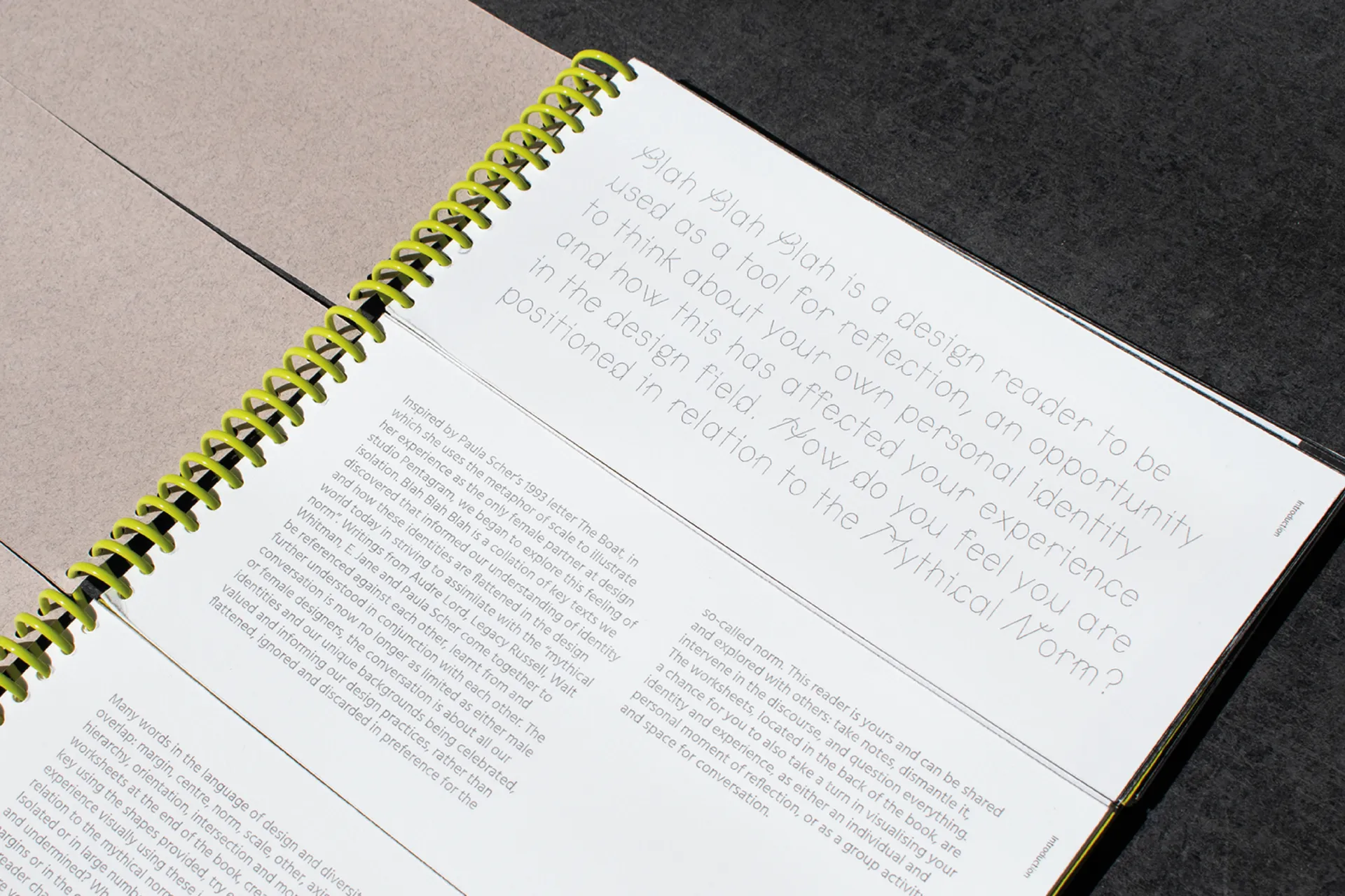 > Blah Blah Blah Reader and Workshop was created in response to Paula Scher’s article ‘The Boat’, in which she describes her annoyance at being labelled a “female designer”. We investigated the concept of identity, and how this can be flattened in the design industry to fit “the mythical norm”. Blah Blah Blah is an opportunity to think about your personal identity and how it has shaped your experience in the design field.