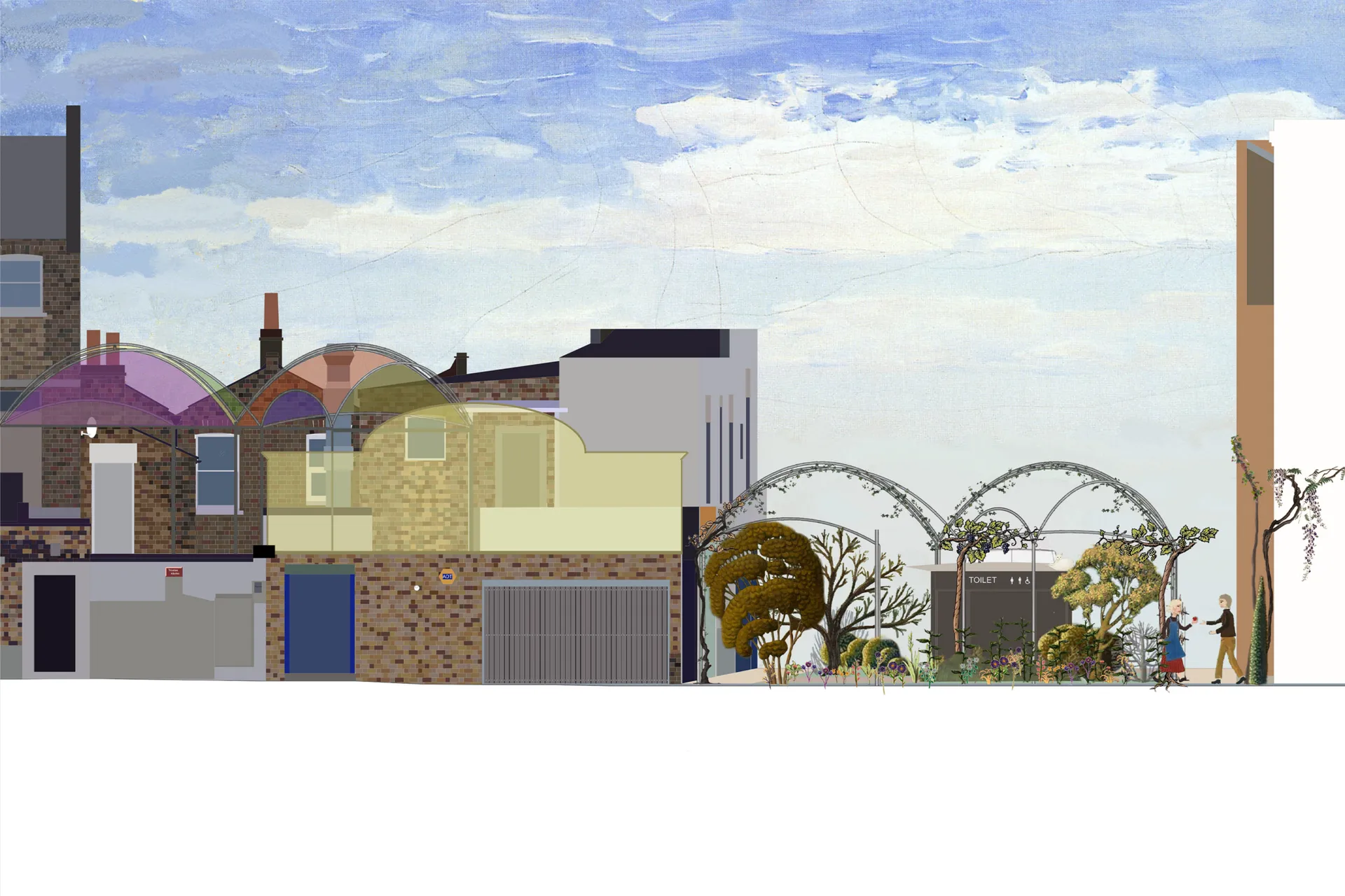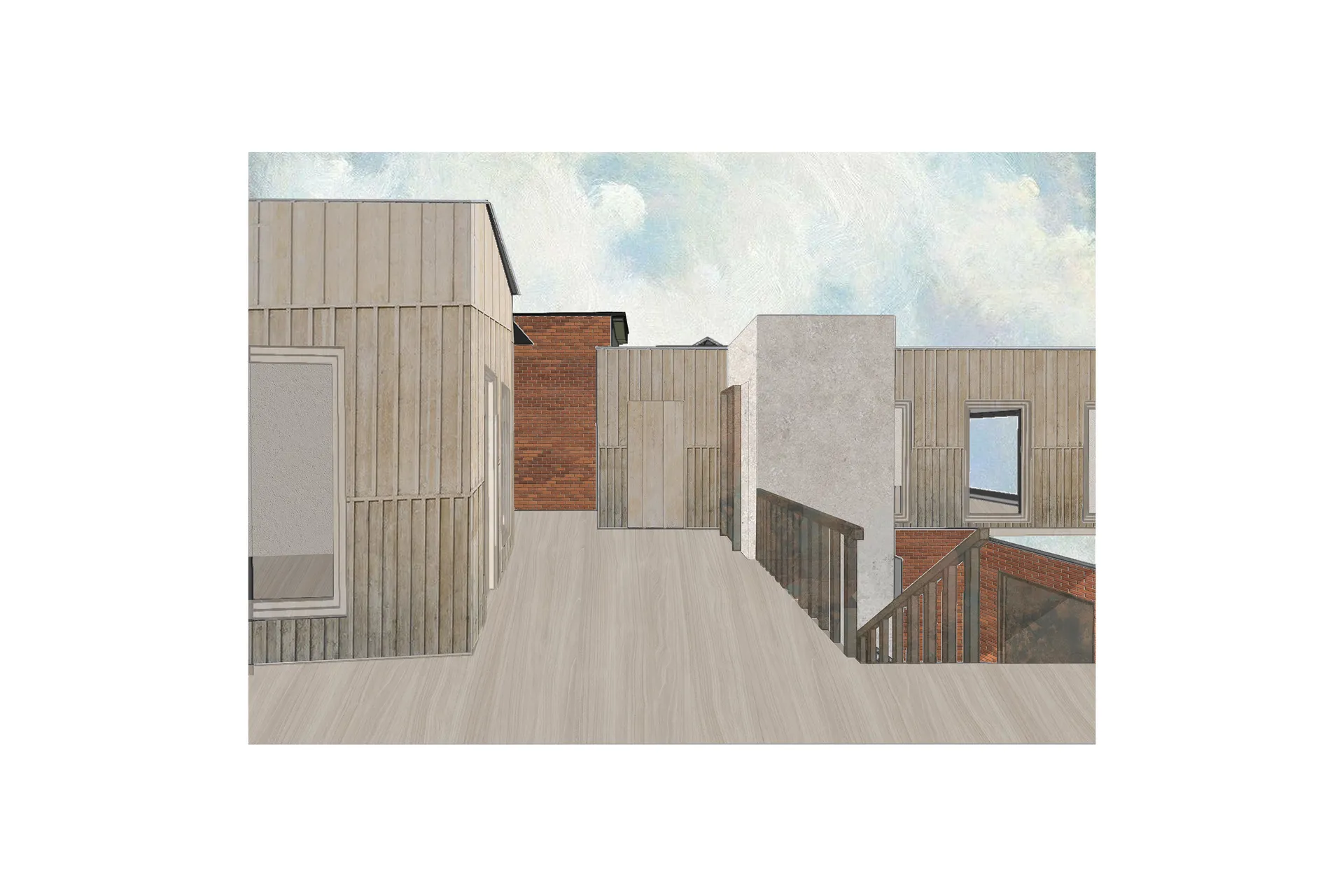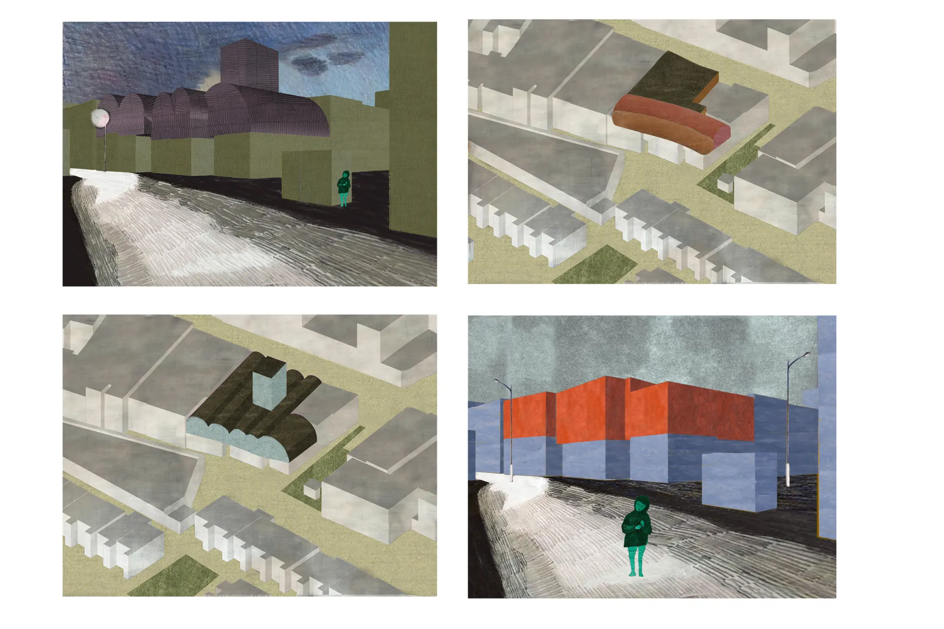 The site of my thesis is located on Rye Lane in Peckham. I propose a “school for adults”, where people can come together and learn anything from music and pottery to German literature and economics. The building consist of series of small structures erected over the backs of existing storage rooms, located in the rears of four houses along Rye Lane. The project also seeks to extend the high street, bringing it to a smaller parallel road via a rain garden, which indices pedestrians to veer off the main road.