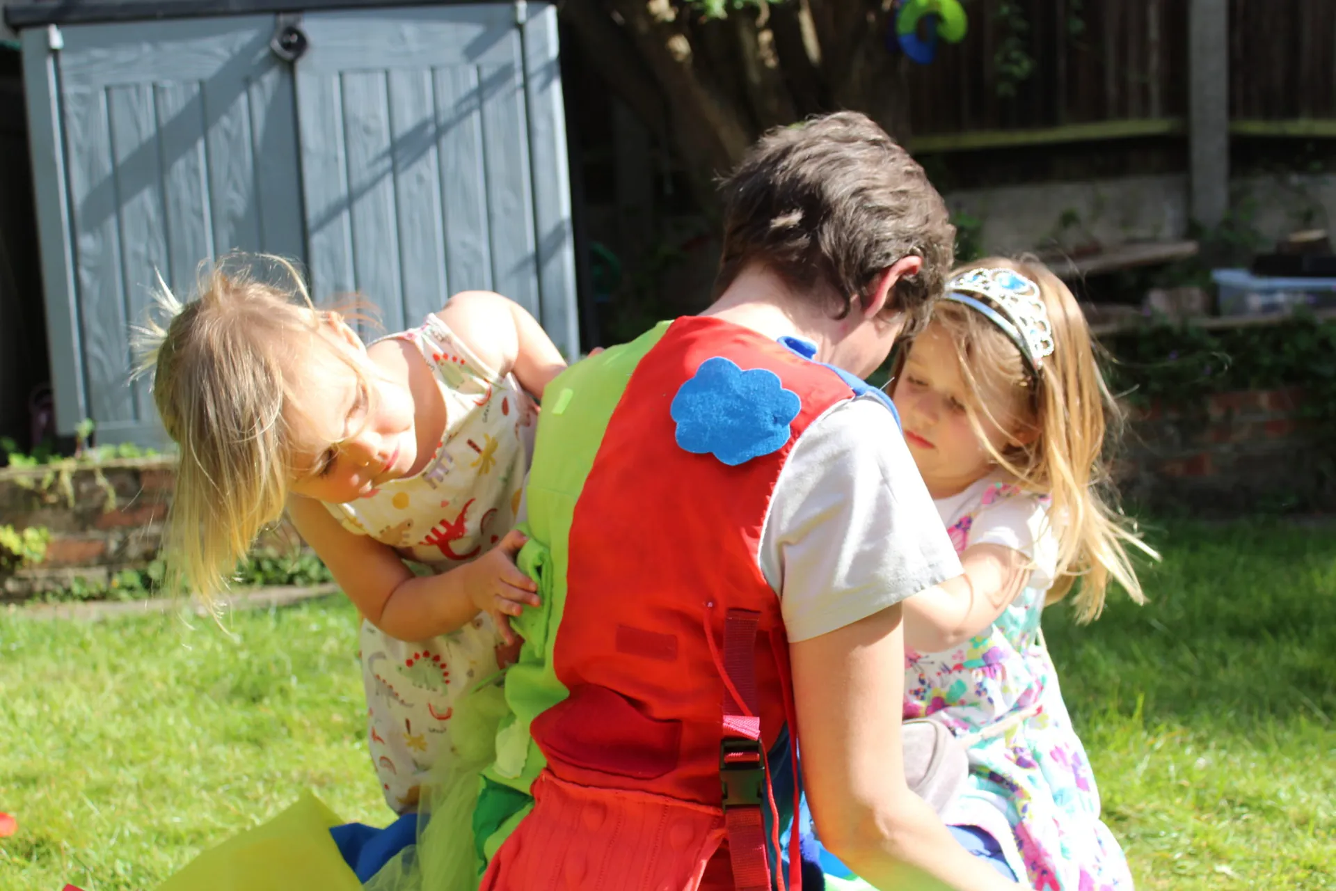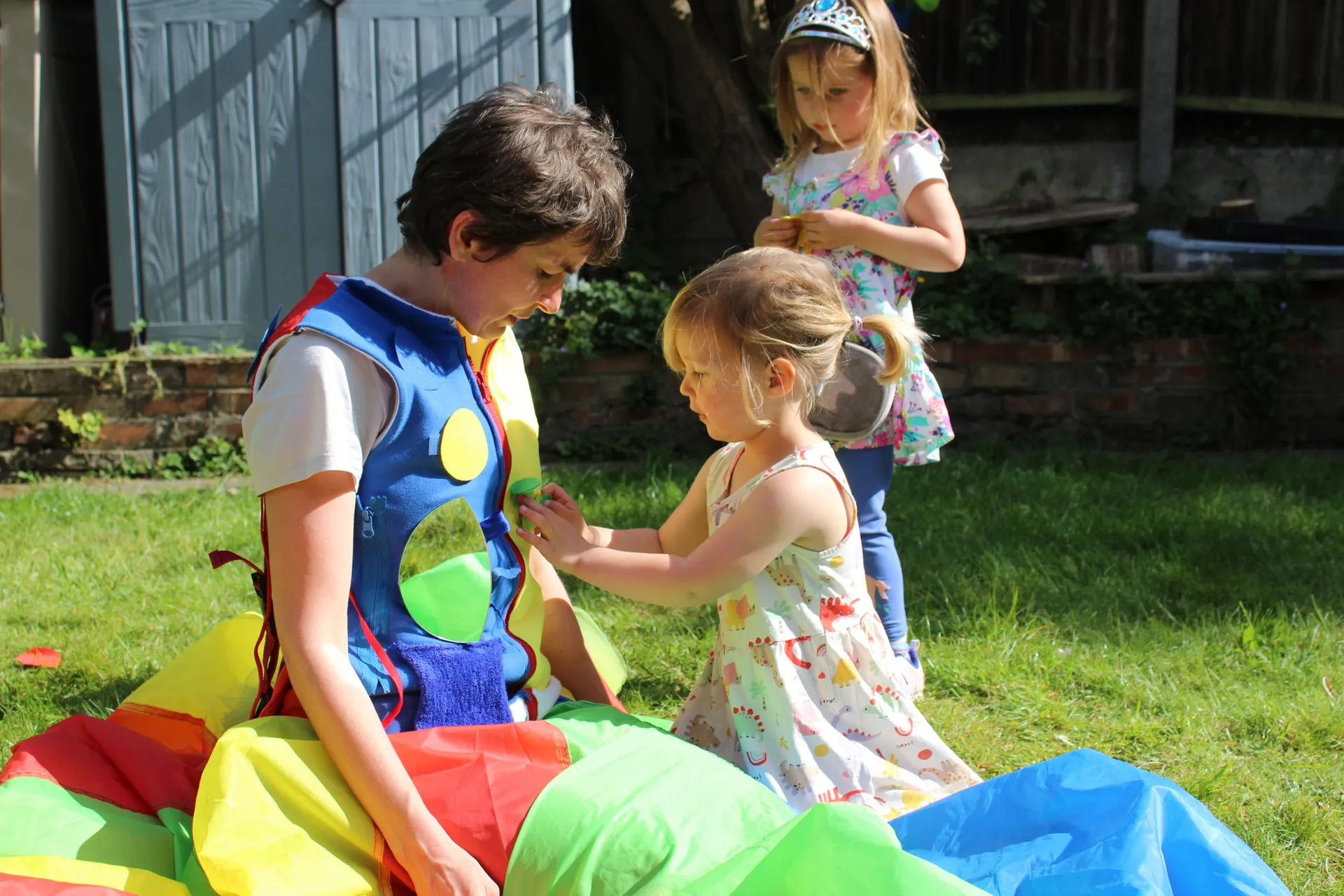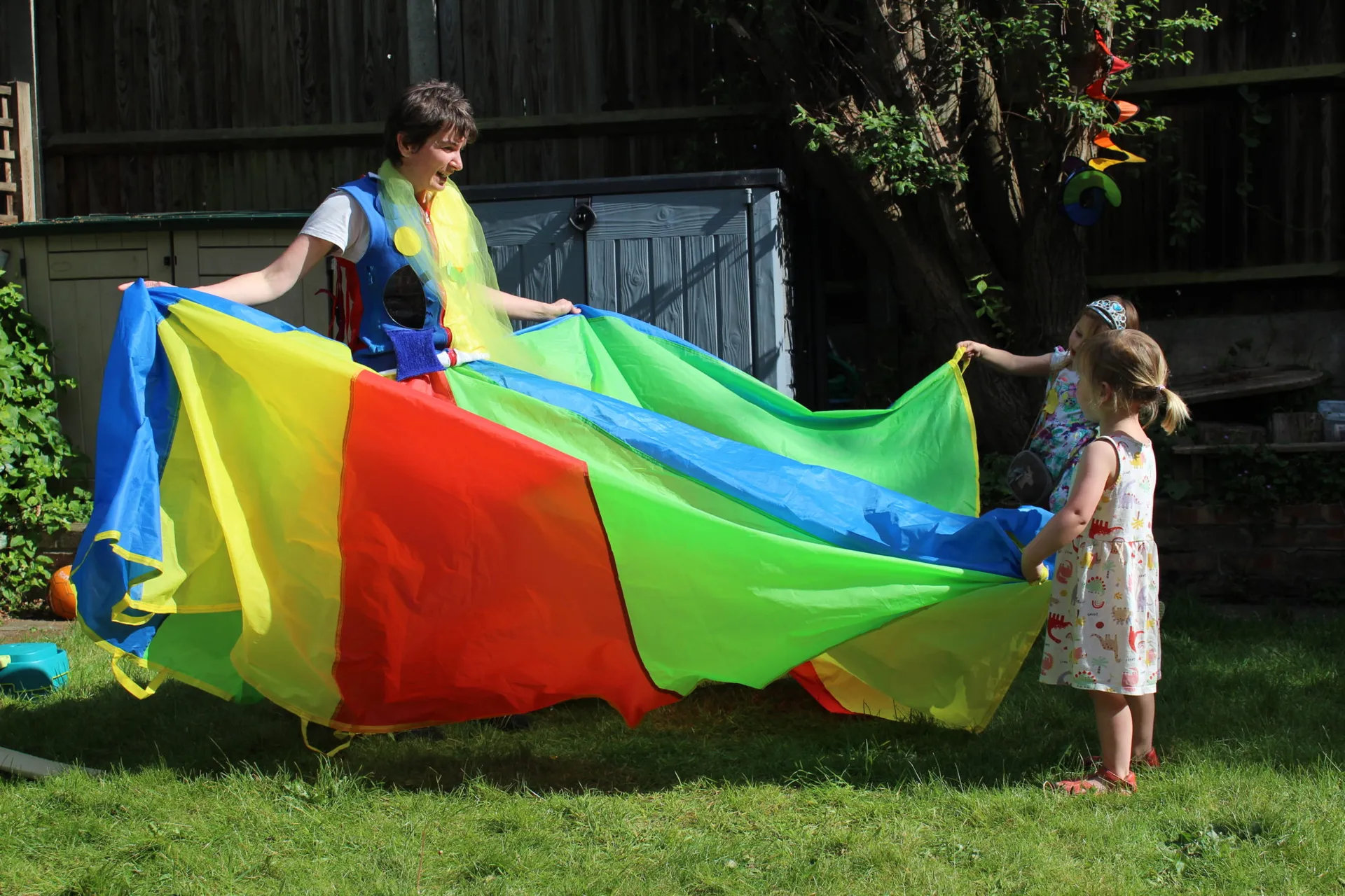 This was achieved through incorporating a range of fun things they enjoy, bright colours, sensory elements, different facial expressions and shapes on Velcro and lots of pockets with a range of fastenings which also contribute to their development of fine motor skills. And of course, a giant parachute!