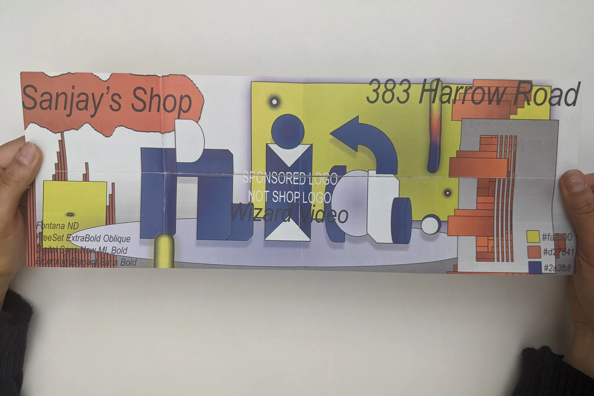 Visual language and banner artwork was inspired by the original corner shop banners’ design using their bold, peculiar and saturated color pallets or weird formats to create patterns. In no way am I trying to replace or upgrade their banners, but instead to celebrate their designs and exaggerate their features by applying my discovered Futurist concept. The Artwork cover side features design observations of exact colors they use, and a list of the countless amount of fonts used.