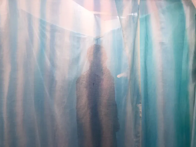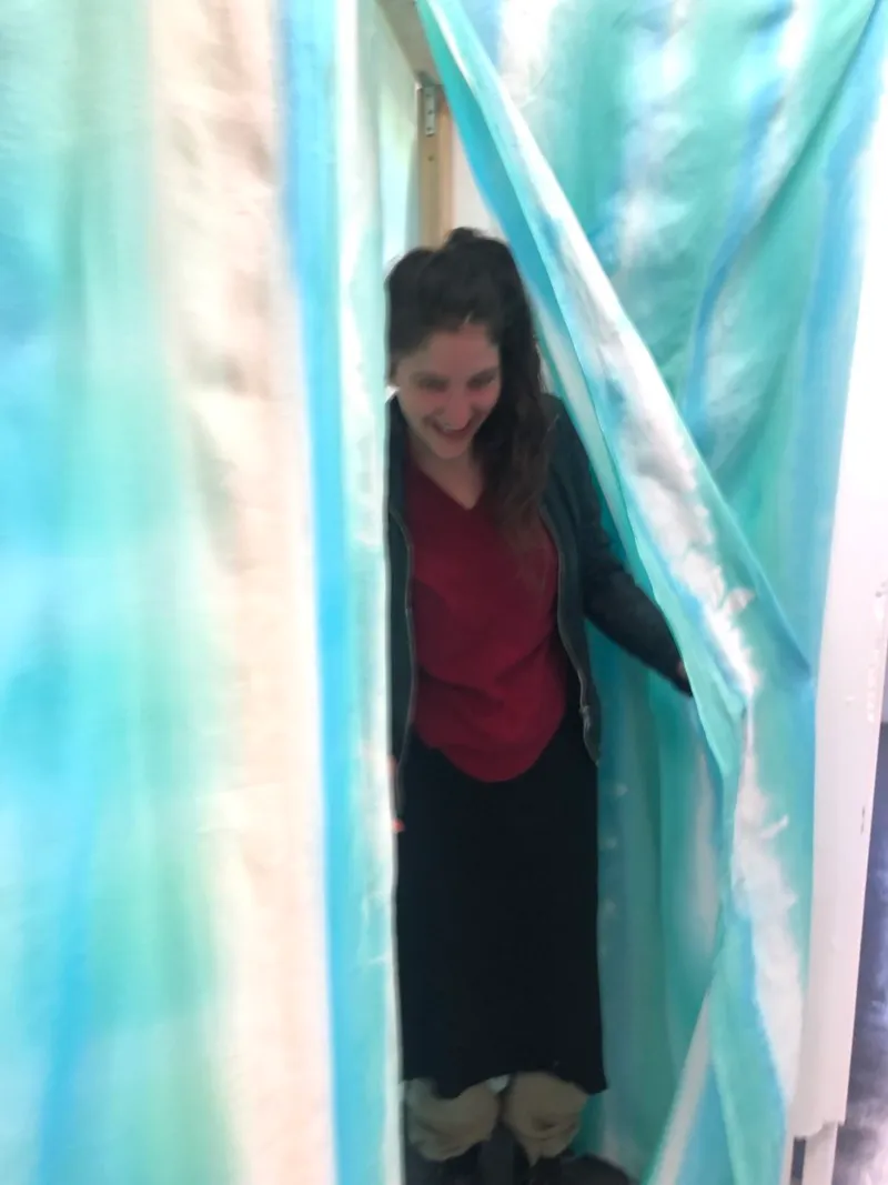 A spatial experience installation work, making a maze-like space connecting many abstract pieces of fabric work alongside.