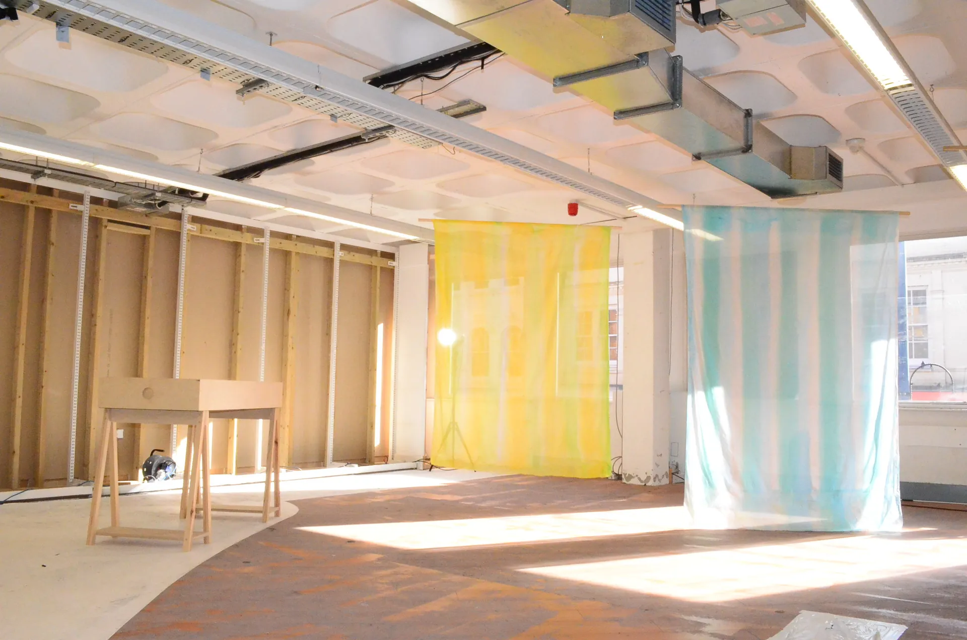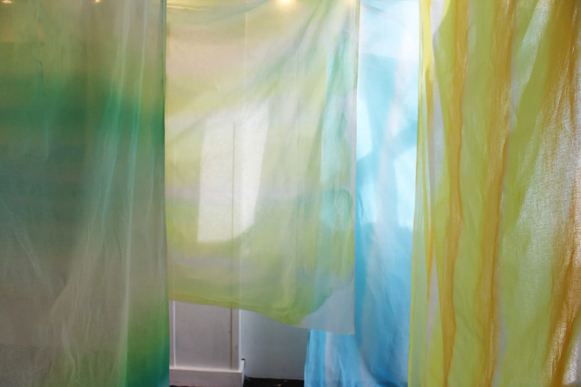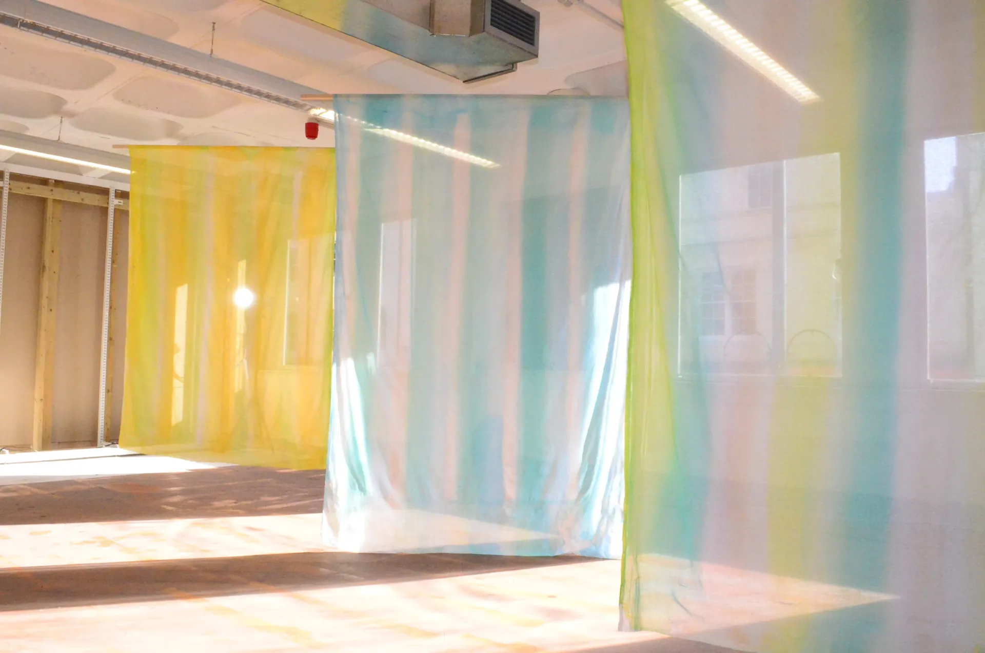 A spatial experience installation work, making a maze-like space connecting many abstract pieces of fabric work alongside.