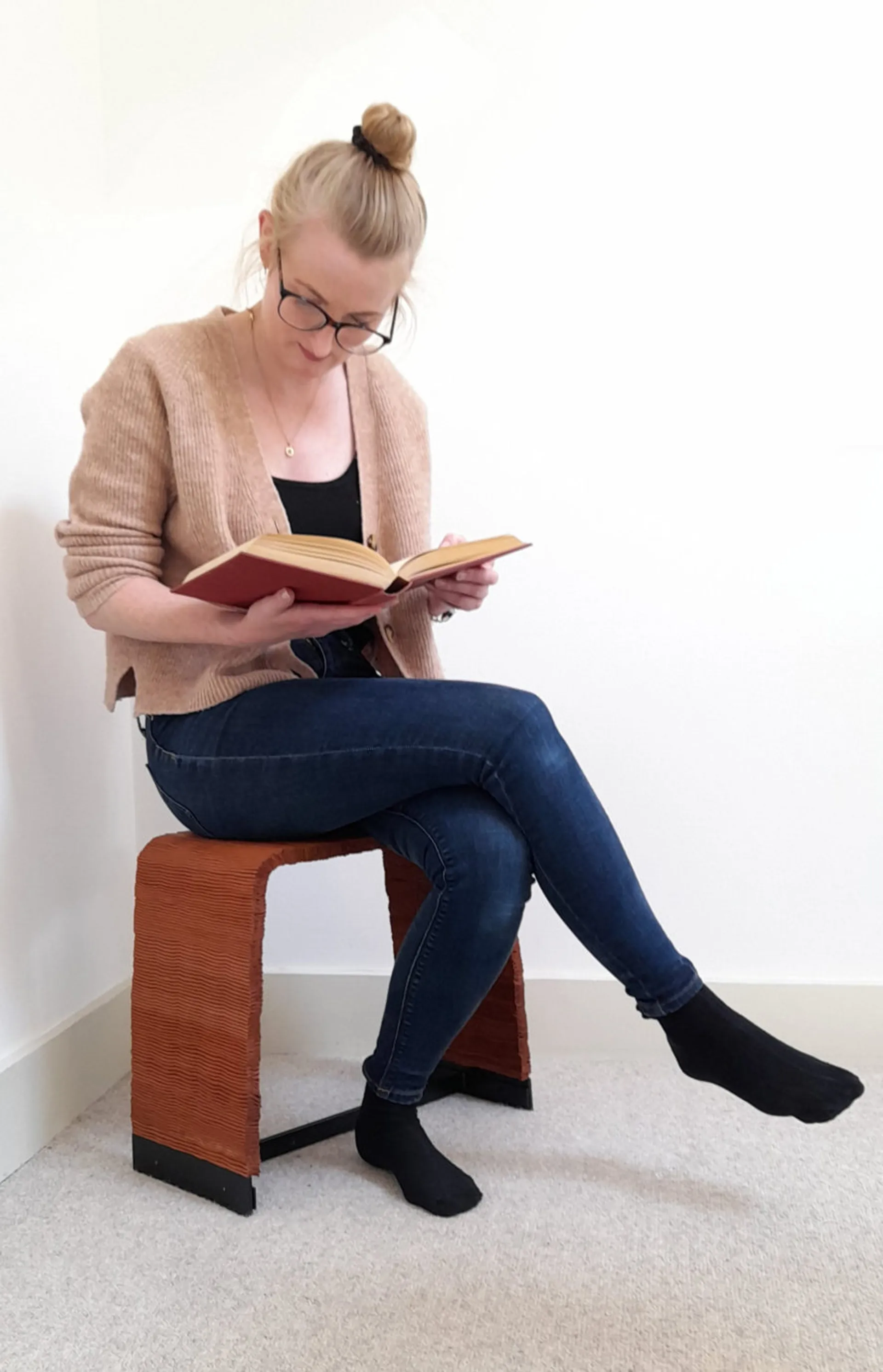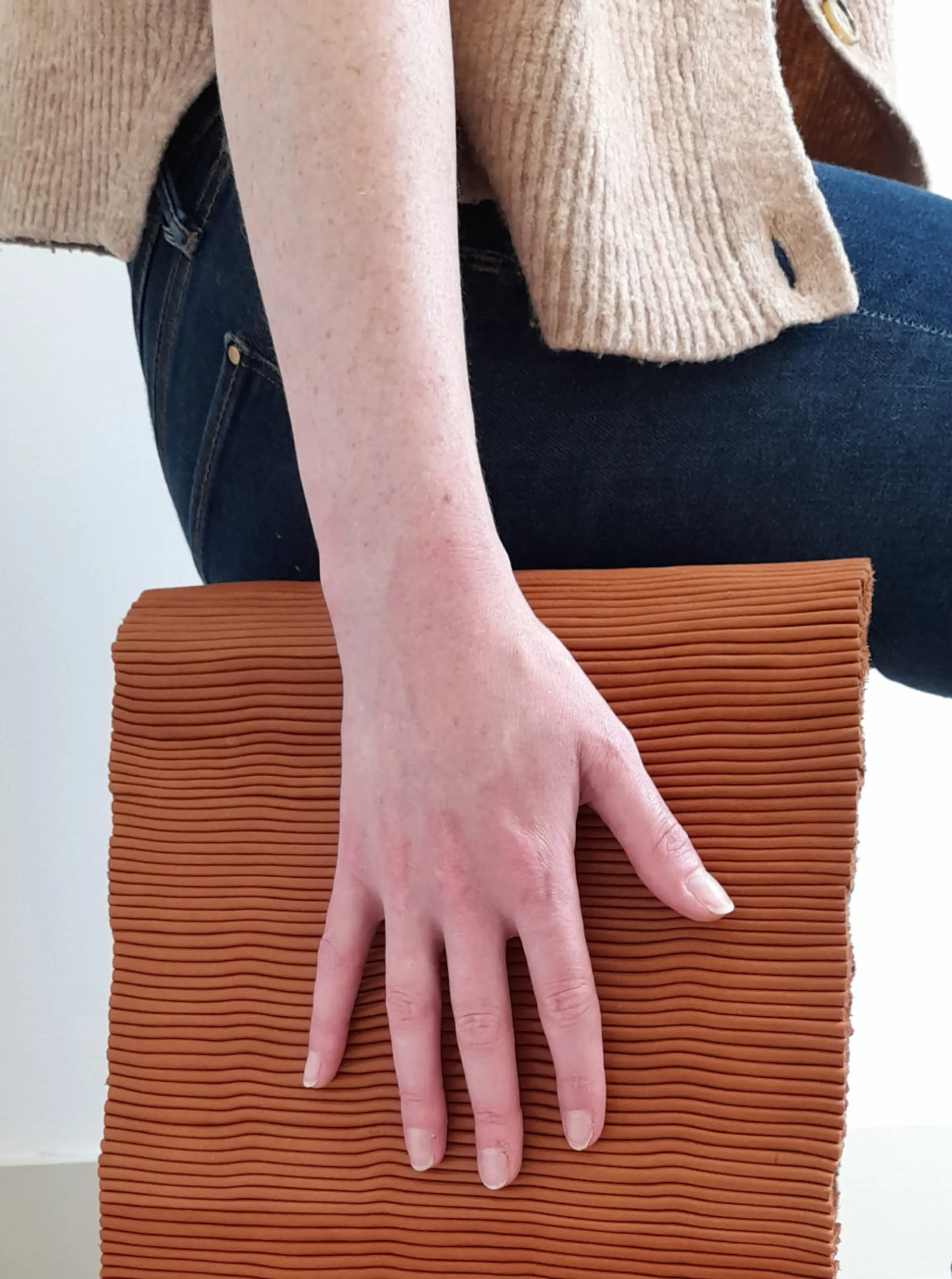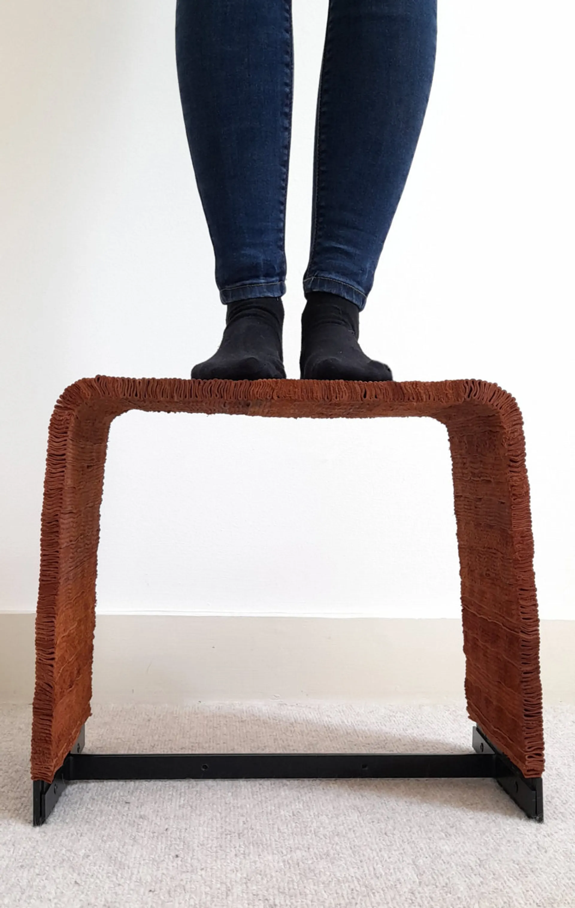 An average of around thirty percent of a leather hide is wasted, discarded after the perfect center shape is cut out. Any small deficiencies or scars can also make an entire hide useless. The uniquely weaved upholstery on the Scrap Leather Stool provides a alternative feel and aesthetic to leather furniture. All leather used had been previously discarded with not one piece of leather on the stool being larger than an A4 piece of paper. The weaving also intentionally disguises small deficiencies within the leather with no glue or adhesives used within the entire construction.