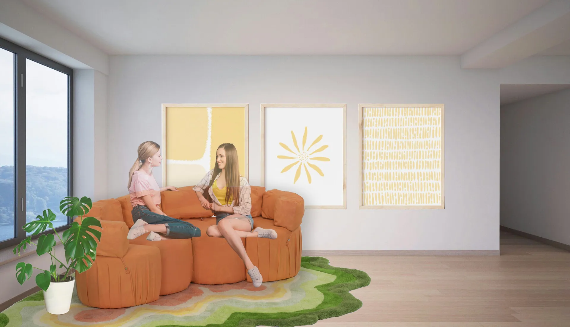 The project aims to contribute positivity to the atmosphere of the space – an area of the home with shapes and colours inspired by psychology. Round shapes entice softness. Orange promotes conversation and comfort, yellow (in small portions) encourages happiness, and green is a grounding colour where the eye is most at rest.