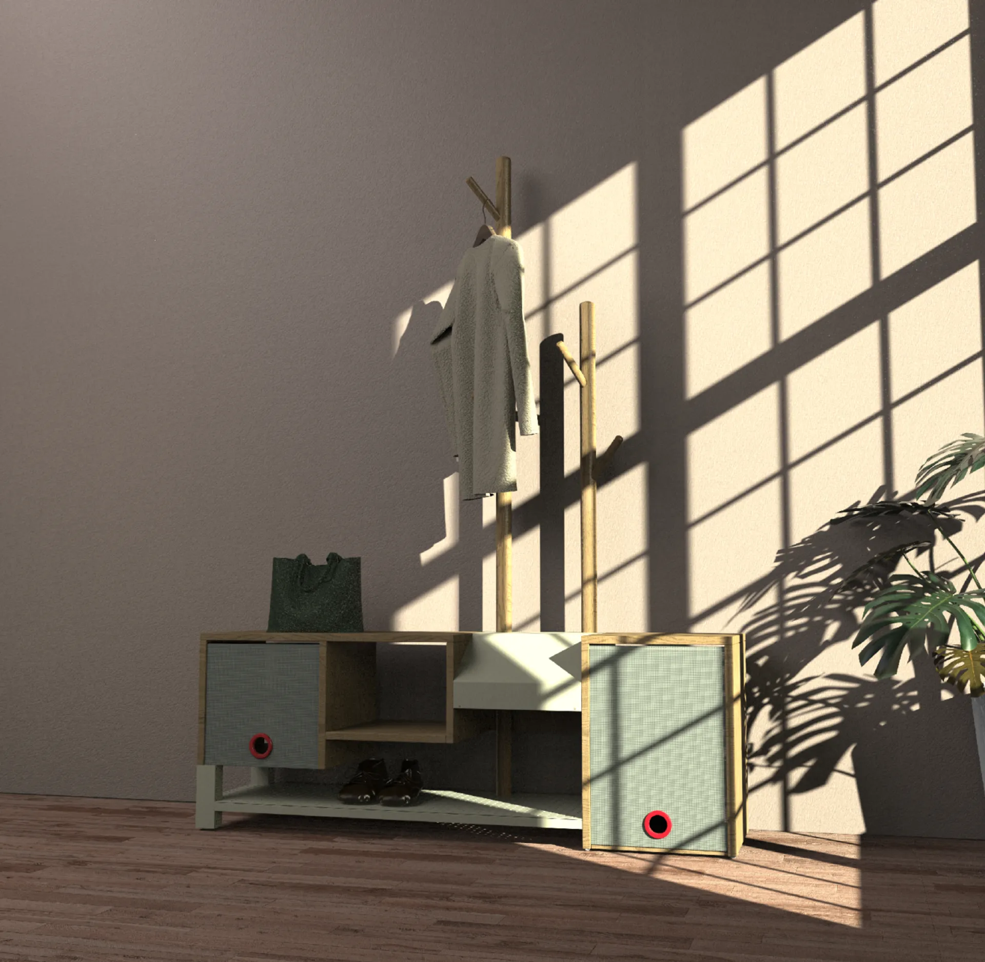 The hallway is often a less valued space, yet it immediately reflects an owner’s style and taste. This furniture elevates the quality of that space with a striking, functional design. Architectural in form the unit juxtaposes materials, storage of shoes & coats, seating, and shoe perching.