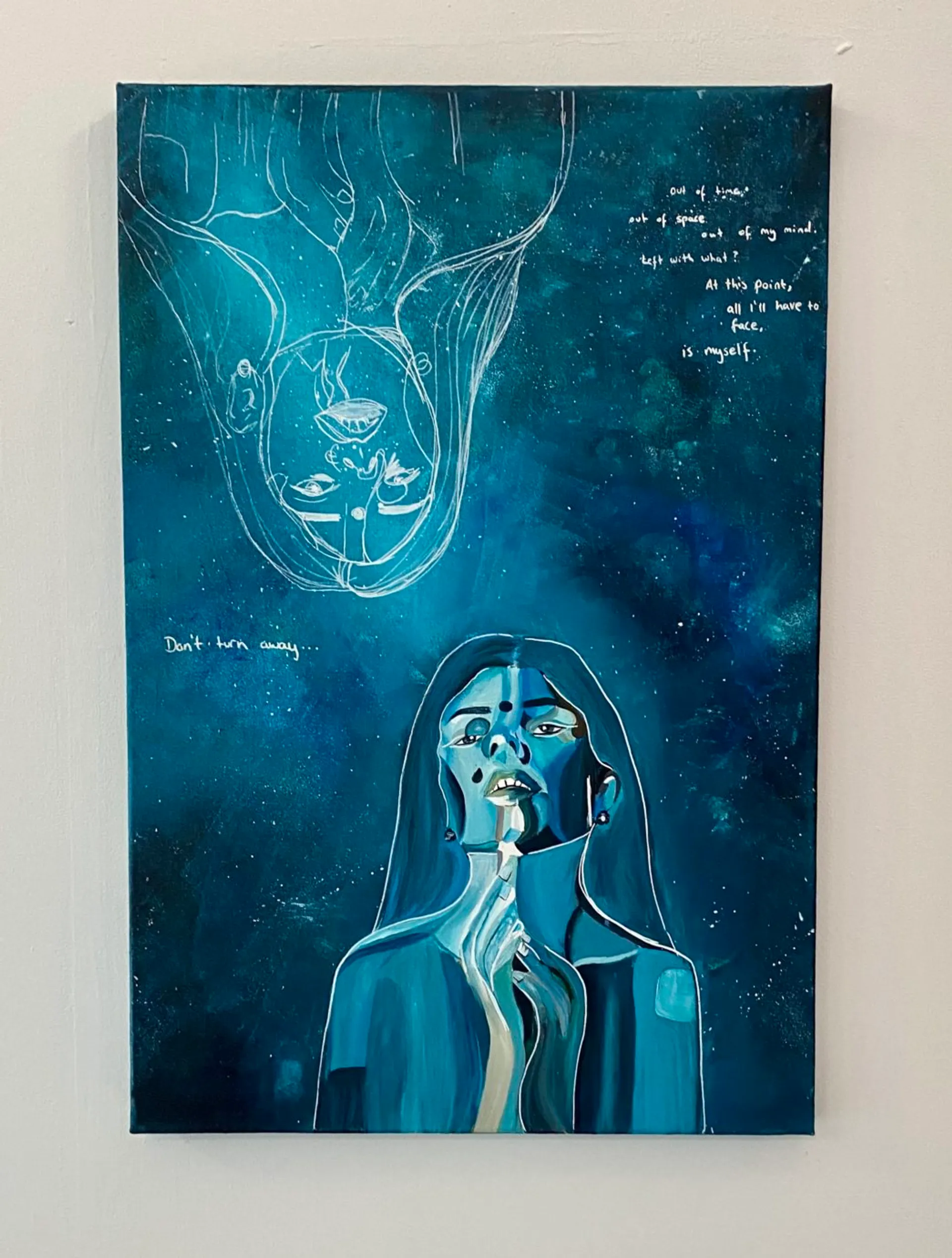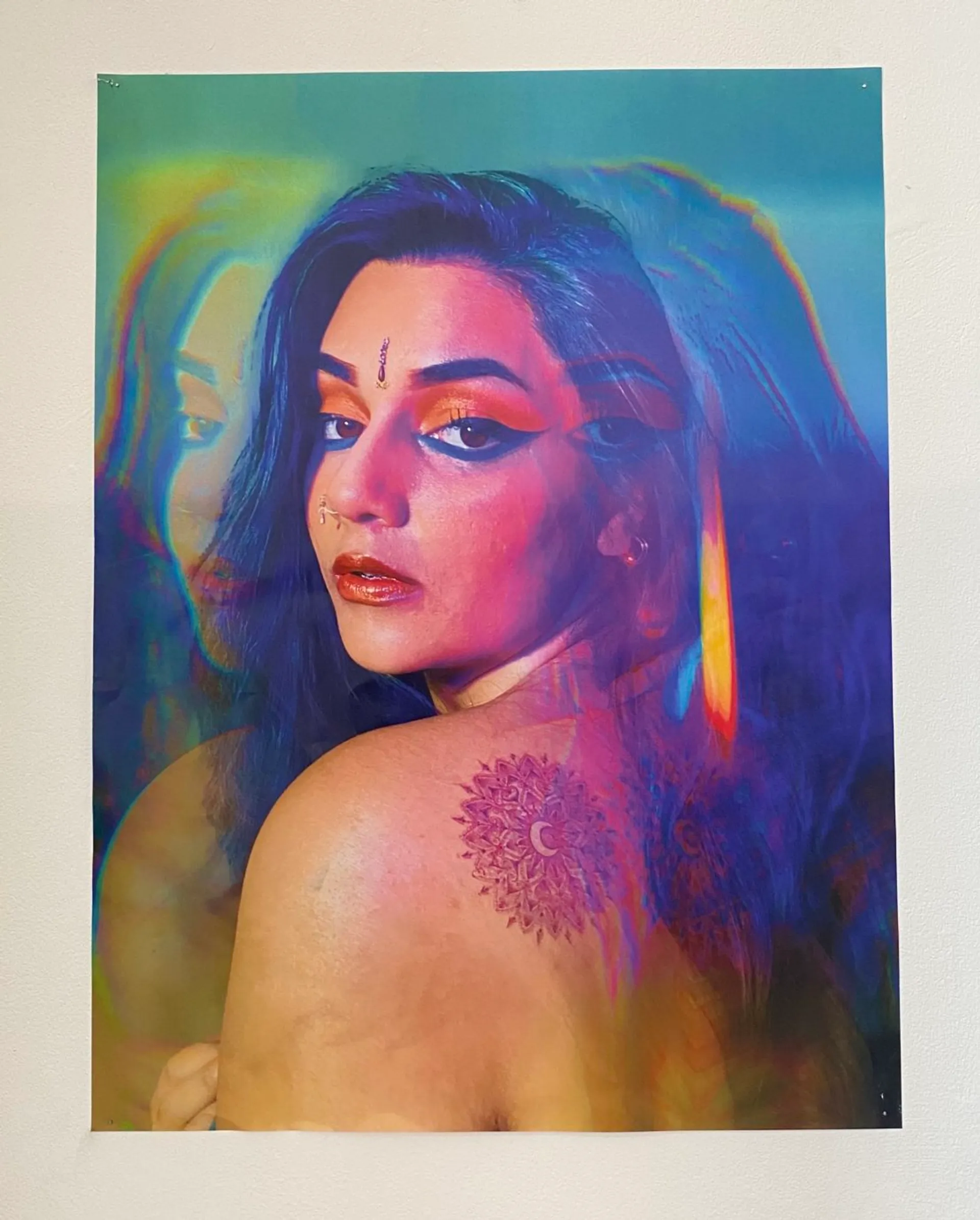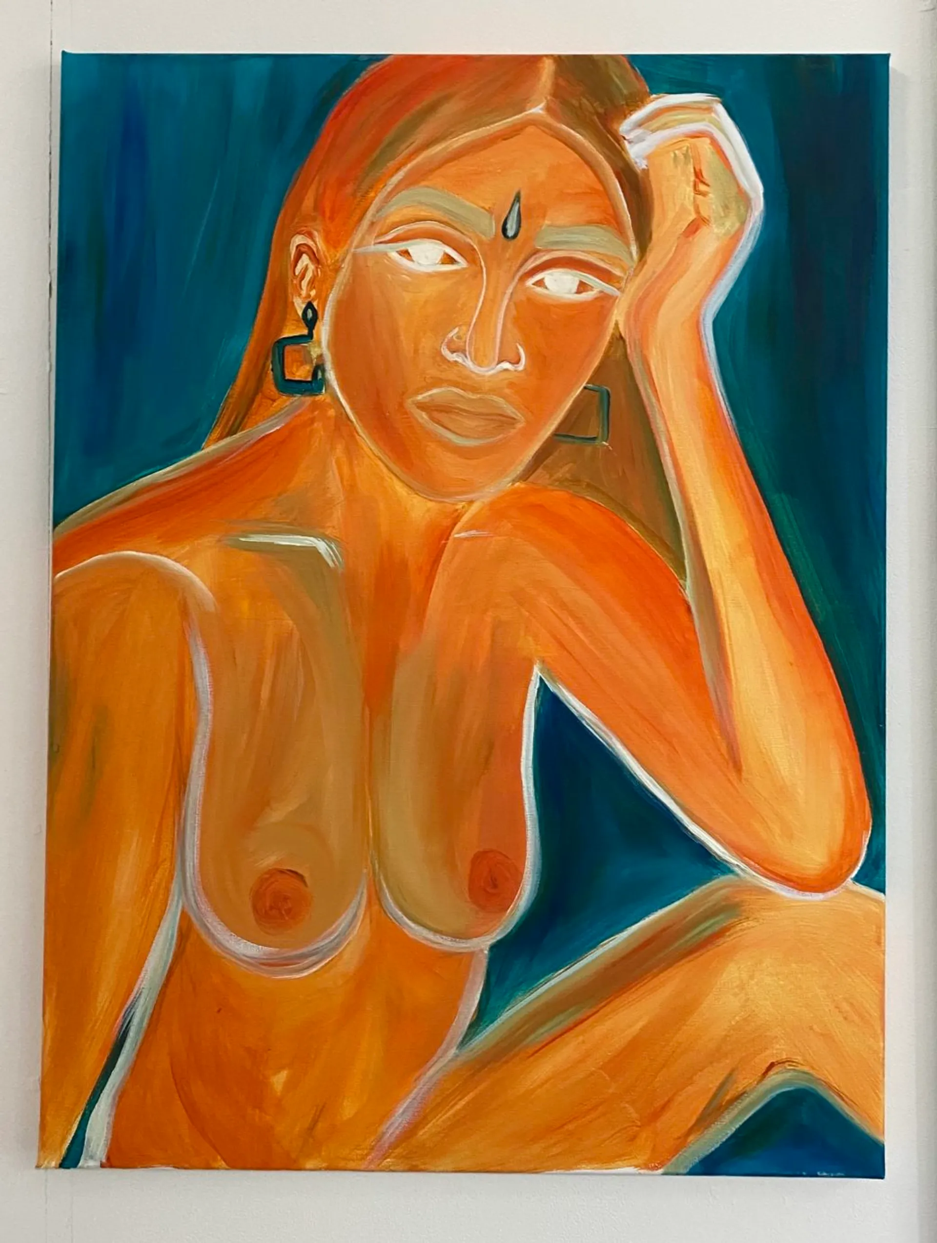 Through painting and photography, Simran explores the relationship with the self and how she has experienced issues around identity as a second generation British Indian woman. Her practice revolves around a confrontational narrative as well as selfhood by creating a powerful yet vulnerable space, allowing higher versions of the self to speak and challenge the regular self. Her portraits and figures all represent memories and feelings of developing a self caring and self dependent relationship.