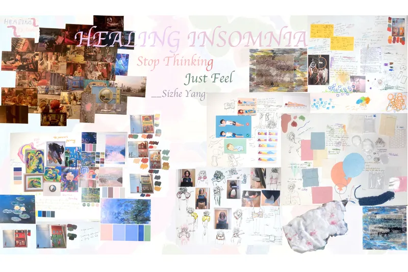 My inspiration came from the fact that many of my friends were talking about insomnia during that time, but I didn’t. So I wanted to help them heal insomnia in my way. I observed myself and noticed a change in the colours I chose for the objects around me, so I guessed that colours would have a certain effect on people ‘s psychology . After a series of preliminary investigations , I have learned about different types of insomnia . As a designer, I can play a certain role in visual, tactile and auditory aspects without drugs. So I watched a movie have a title” Healing Movie” and found that the choice of brightness and saturation in it could achieve a relaxing effect. I began to formally study the different effects of colour on people in psychology , and also made relevant questionnaire surveys. However, insomnia is not caused by a single reason, people of different genders, different ages and different professions have different troubles about insomnia . Therefore, I can only select. several common types from them for research . Others, for example, offer medical explanation for the healthiest way to sleep, since many people are unable to sleep because of physical pain. So in my final design, there are also some important parts that support the body to keep it healthy. In addition, some people’s choice of comforters in pajamas and sheets became my research part, which was also used in the final design.