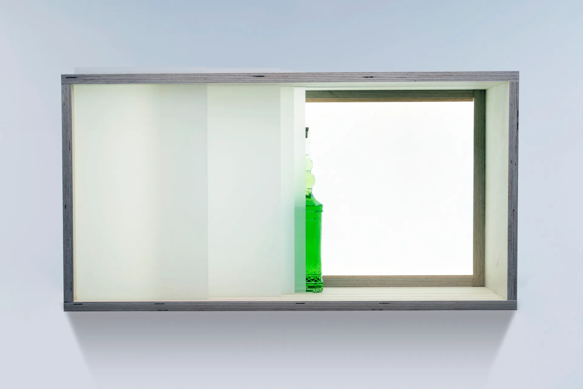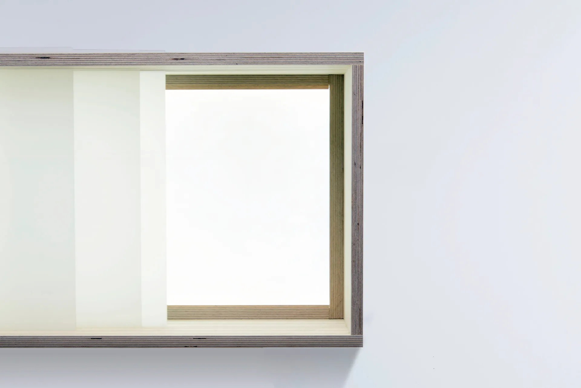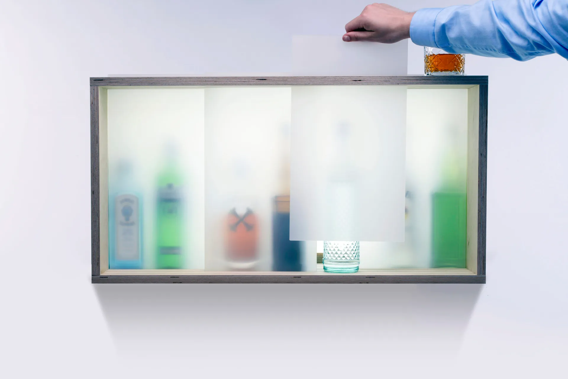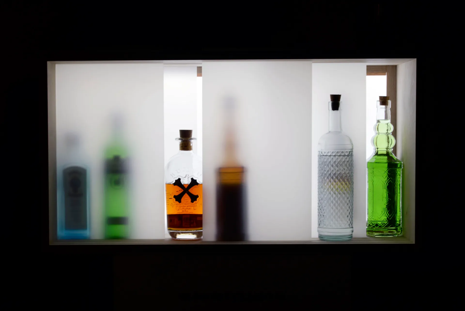 ‘Ghost’ cabinet celebrates the theatre that the user can have whilst displaying objects, in this case spirit bottles, allowing them to curate their own display and change the focus of the objects in an analogue nature by moving the frosted screens and layering opacity up in the backlit cabinet. These screens provide the ‘ghost’ like effect that the bottles are given within the cabinet.