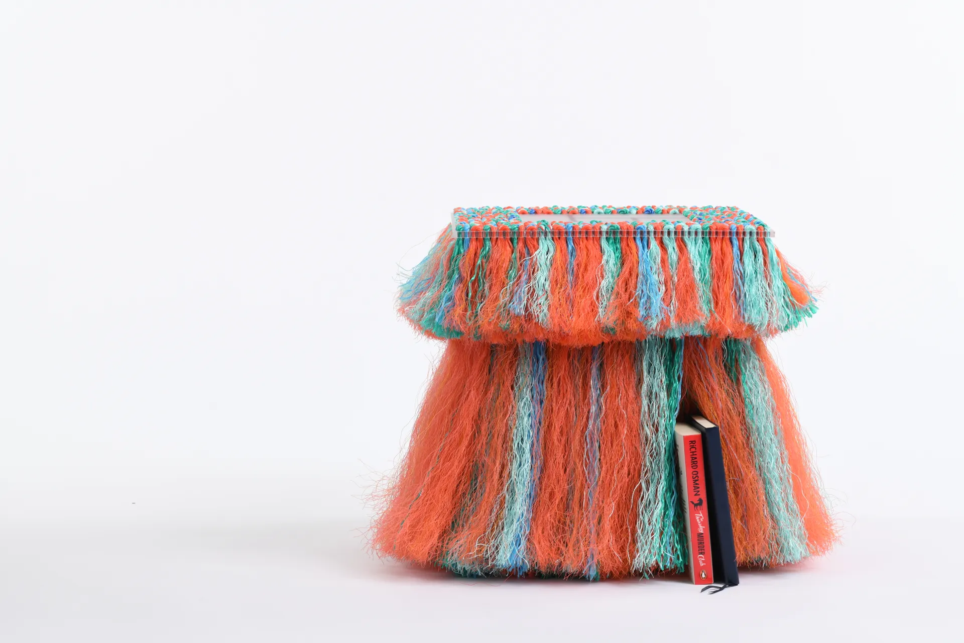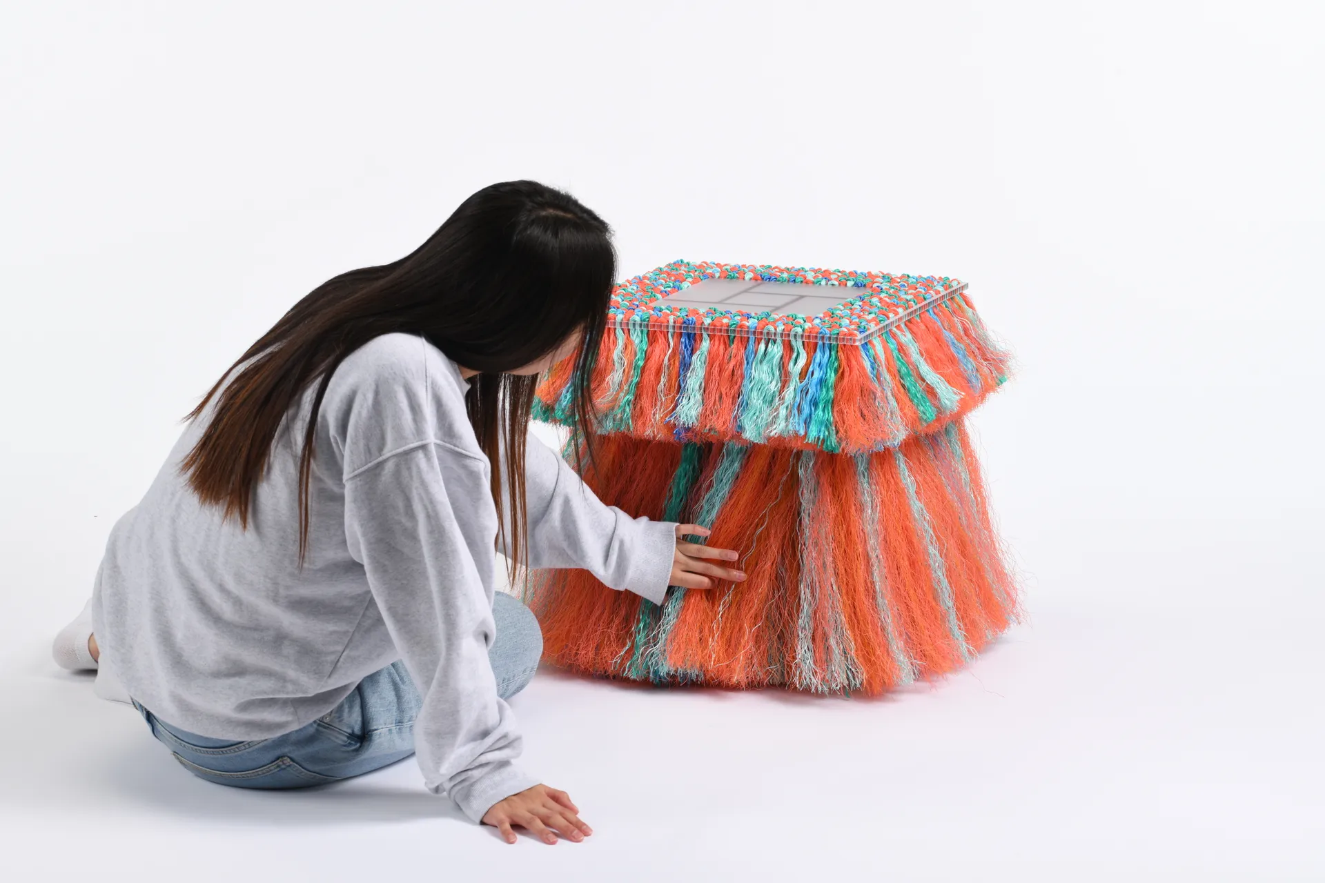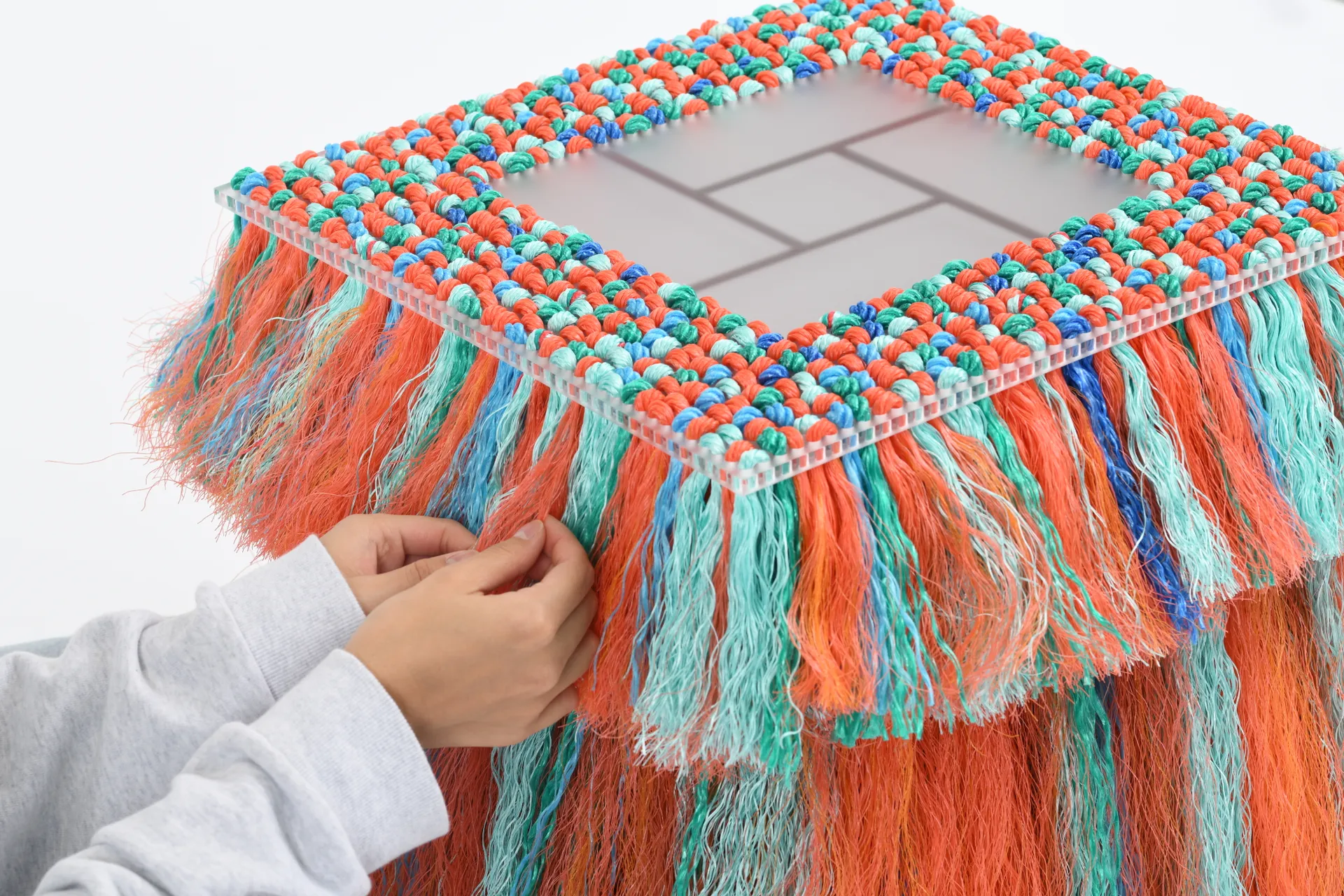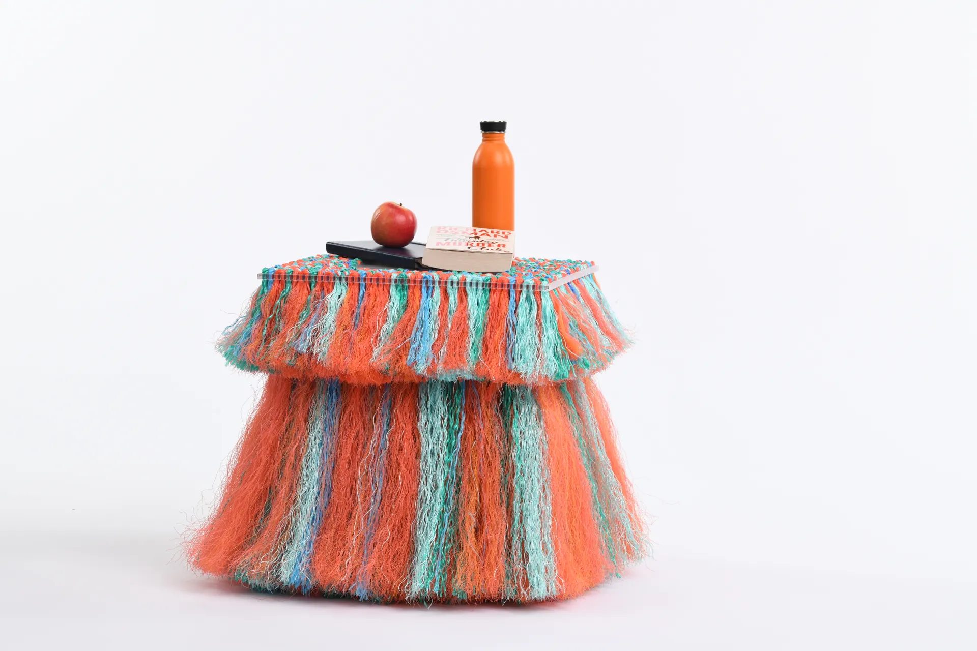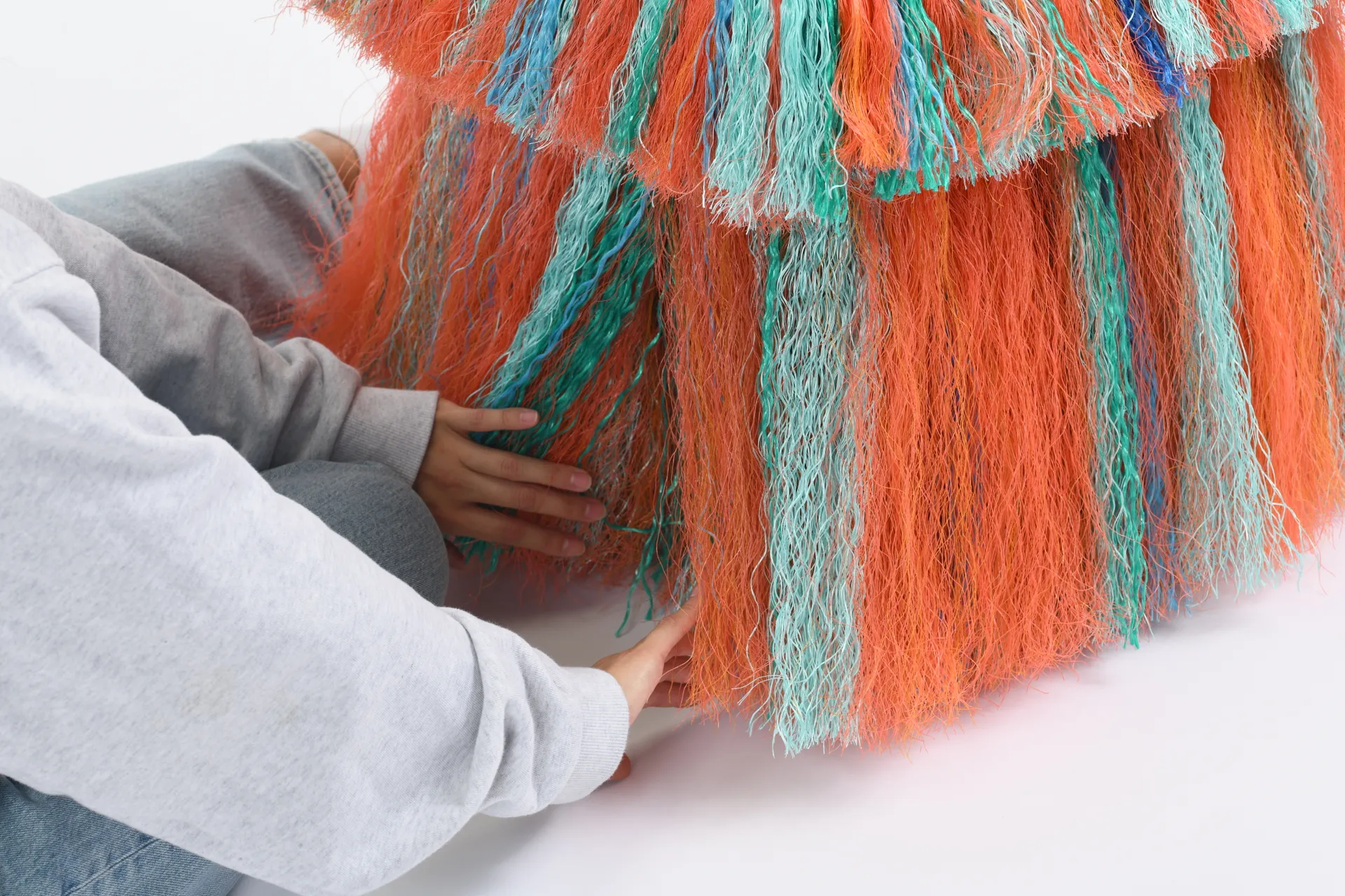 Fishing Rope Furniture proposes the reuse of discarded fishing rope. It aims to give fishing rope a new meaning and value through furniture design. Colourful commercial fishing ropes gathered from beaches in the UK are untangled and the fine filaments are woven by hand.