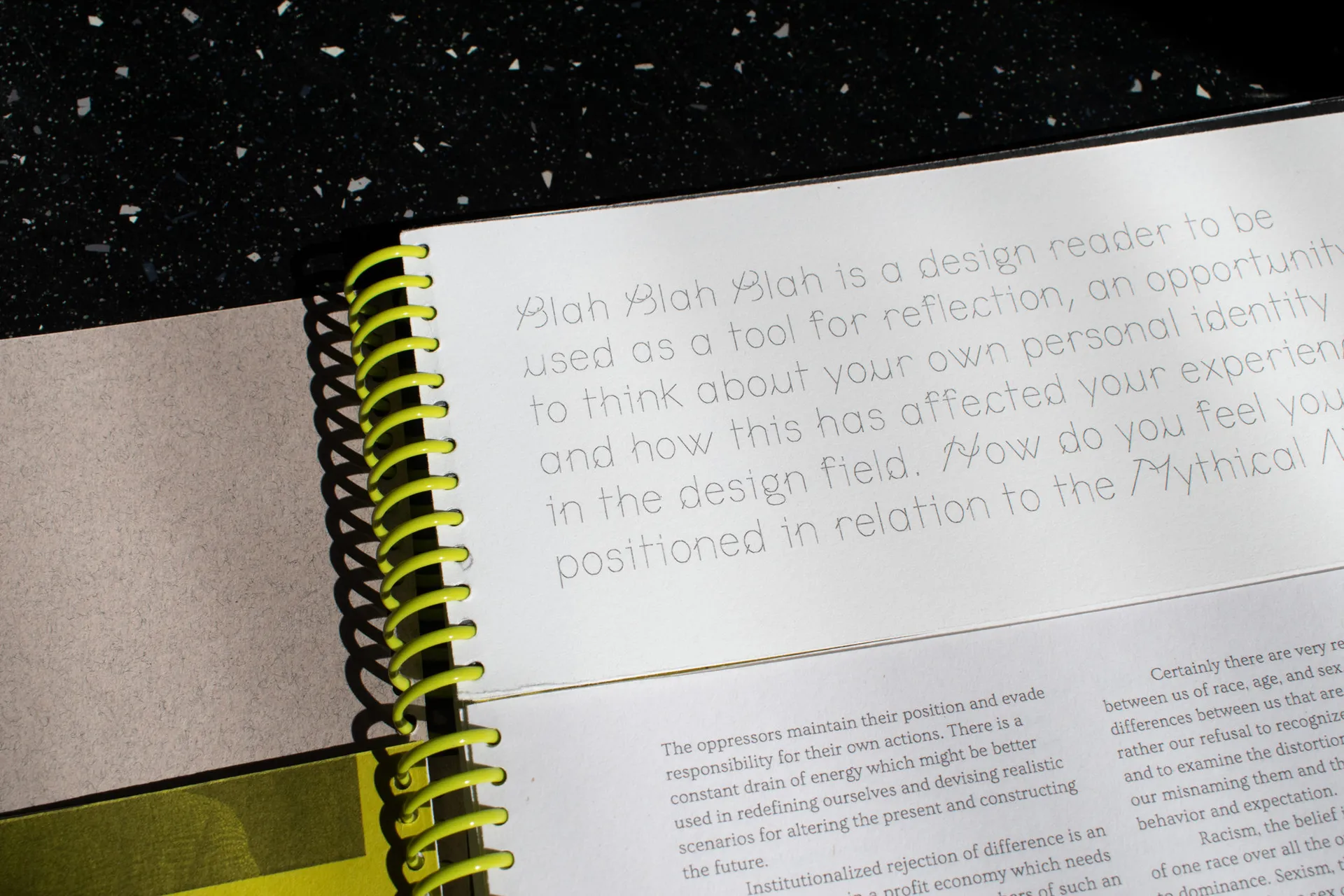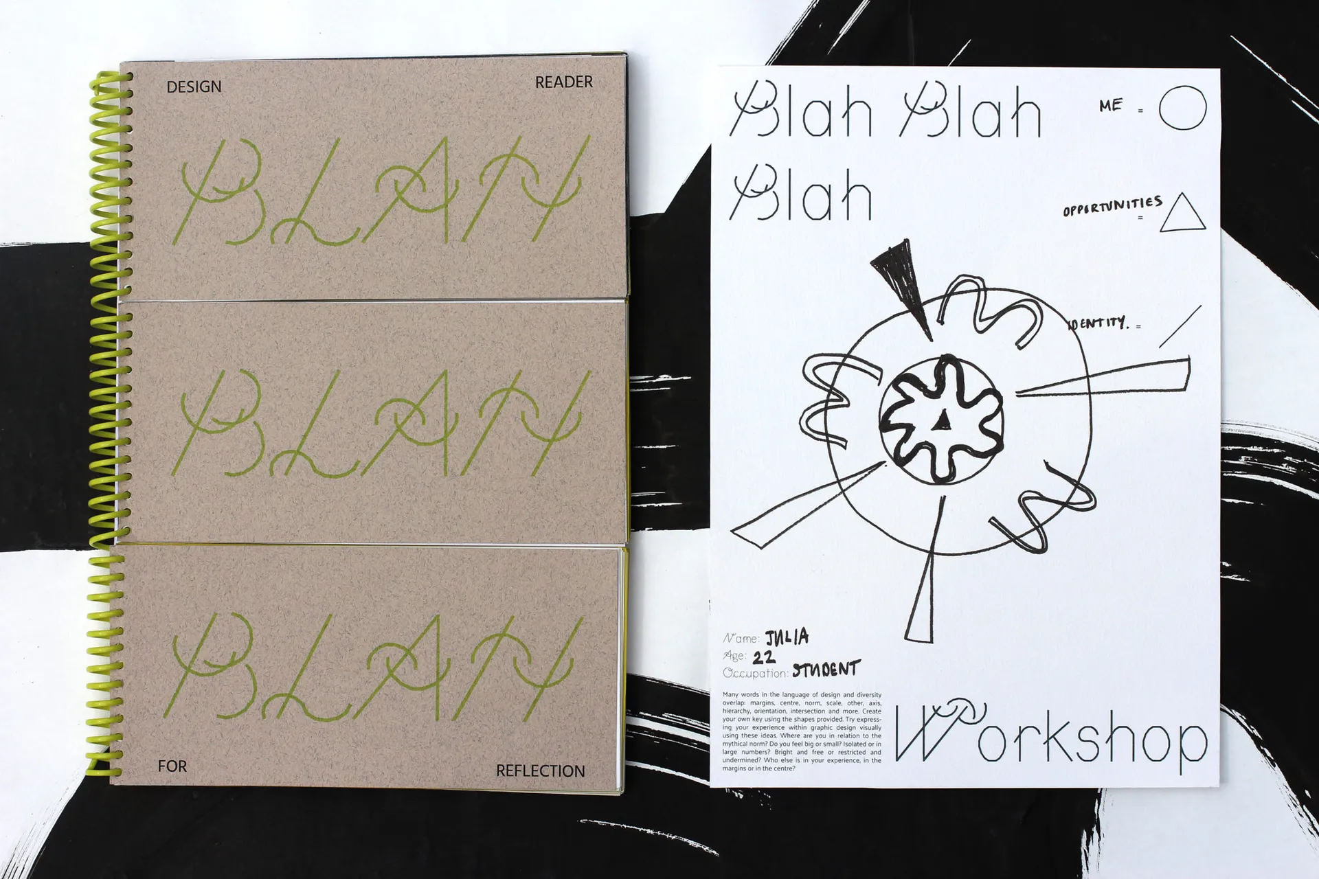 > Blah Blah Blah was created in response to Paula Scher’s 1990s letter on being labelled as a female designer. Blah Blah Blah is a design reader consisting of collated texts on identity. Designed to encourage reflection upon designers’ own experience in the field and how it may have been informed by their identity. It is accompanied by an ink-based workshop in which critical discussion is invited between designers through the tangible expression of identity within design.