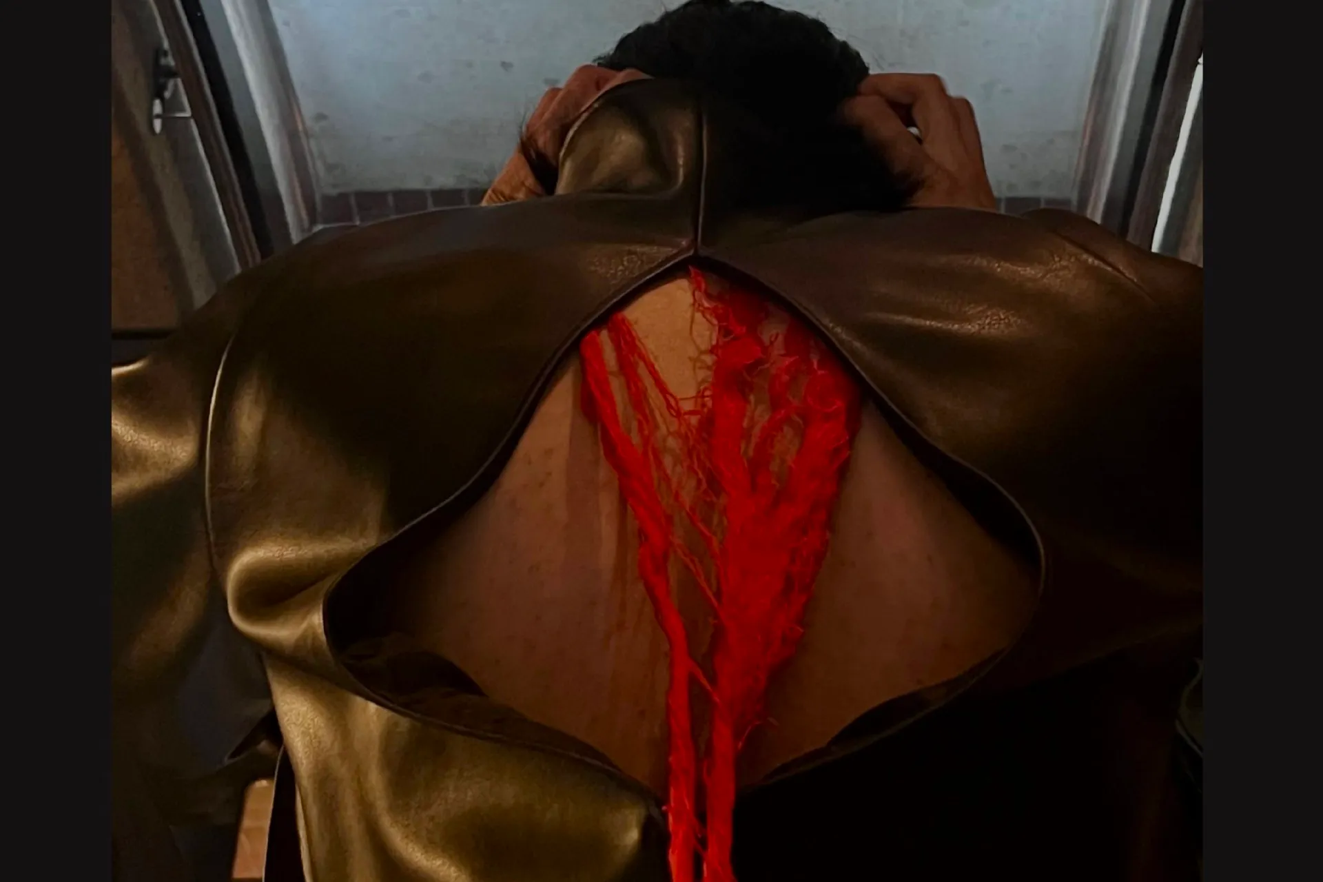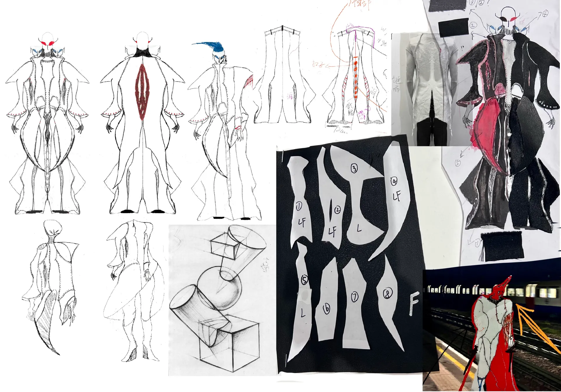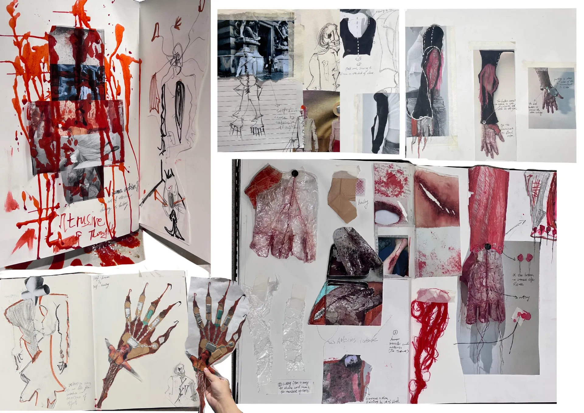 I am a person suffering from intrusive thoughts, in this project, I designed a sharp silhouette with a sense of conflict clothes to express the concept of intrusive thoughts. By creating a character who is troubled by intrusive thoughts and giving him a costume to express the process from a calm state to the brain being invaded and dissipated by violent and bloody thoughts, In my opinion, intrusive thinking is the contemporary Viennese action school. Compared to the radicalism of the art movement and some acts of self-harm, intrusive thought is more like a kind of energy existing in the brain.