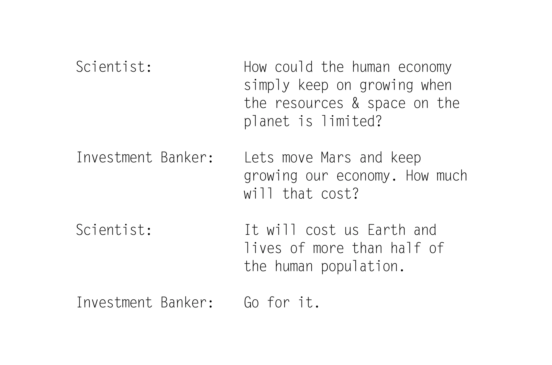 Stories are used to spark speculative and meaningful conversations about important socio-political and socio-economic issues in our world. The humorous stories are based on hybrid realities, to prompt us to reflect on alternative financial systems such as ‘ESG’ (Environmental, Social, and Governance – a corporate reporting framework), time banks, cryptocurrencies, and Universal Basic Income. The typeface used in the stories mimics financial bills and receipts.