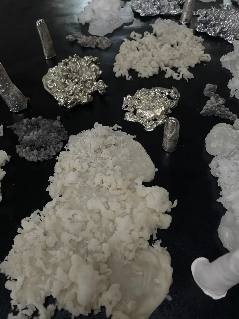 I tend to be drawn to material explorations in my work most recently I have been looking at materials which I feel have a performance/transformative aspect to them. In previous work I started to look at the idea of performative sculpture by making my destroys piece which was a wire frame wrapped in dissolvable fabric which was washed away in the act of it being destroyed. In my current exploration I have been looking at trapping a process/transformation in a material, for this I started to look at pouring wax into bubbles to trap the bubbles in a more permanent material, these works then developed into pewter casts of bubbles which I have combined with a sound piece featuring noises of the process such as the wax/metal pouring and bubbles popping, to bring a sense of movement back into the sculptural works.