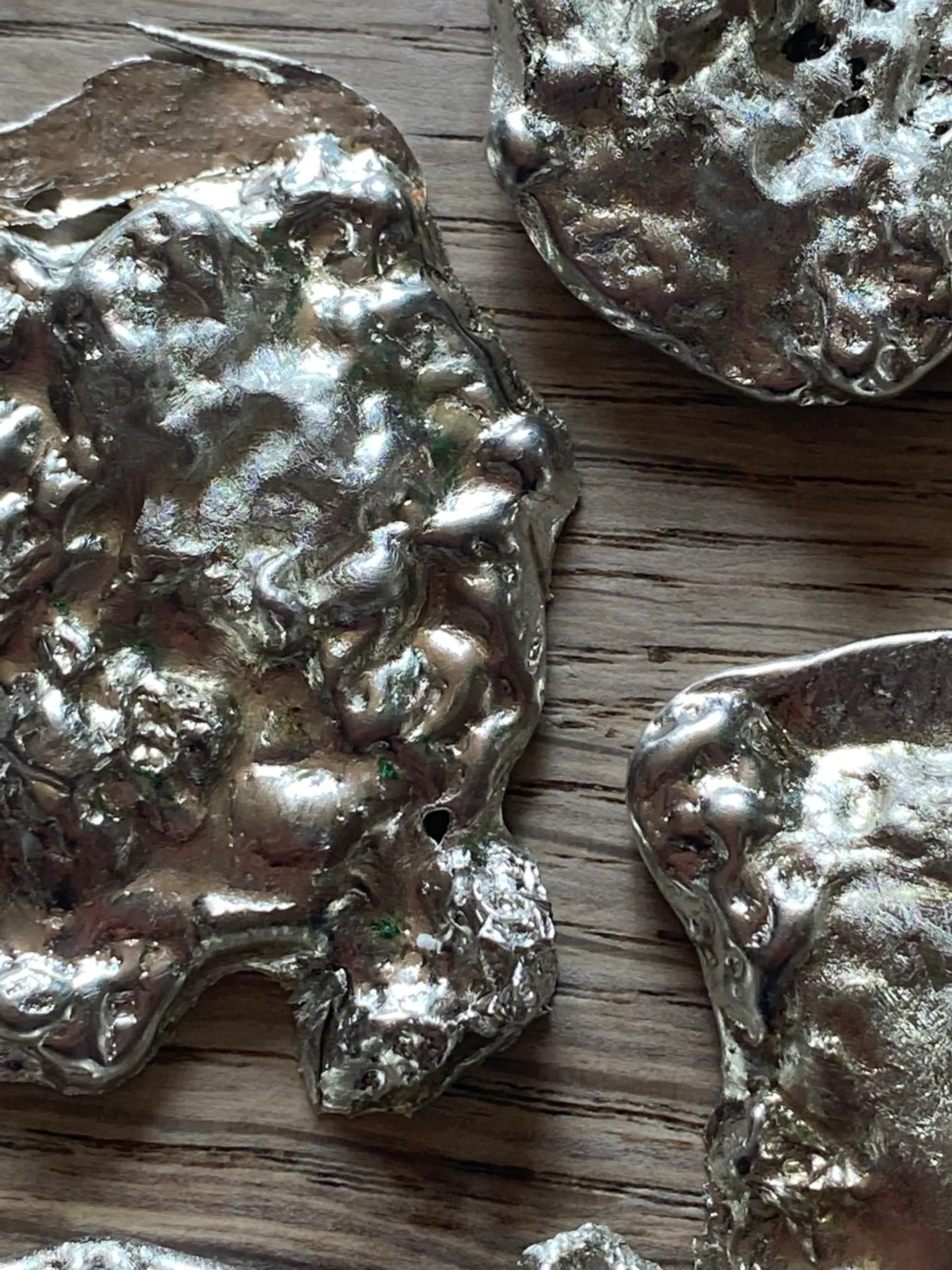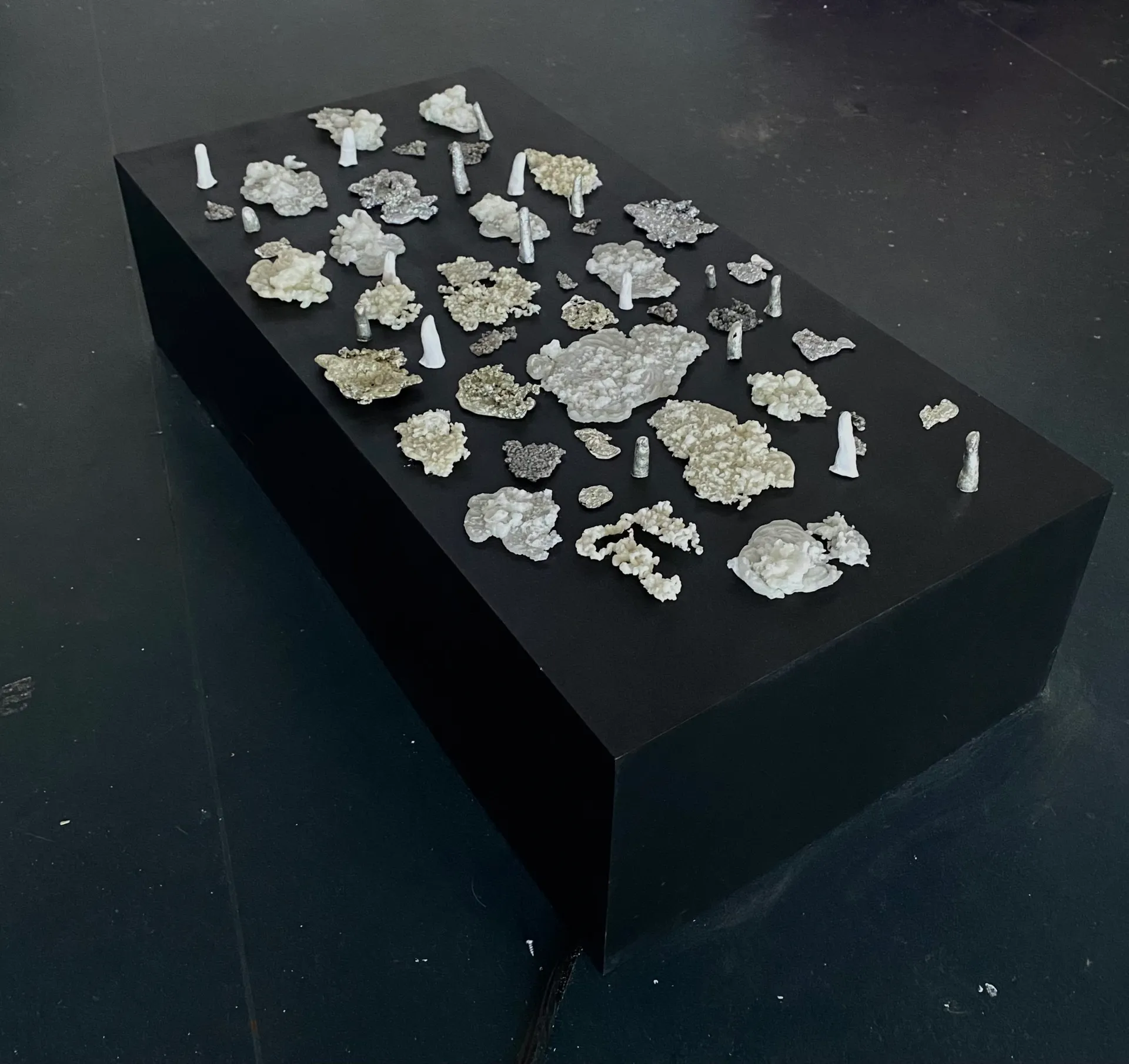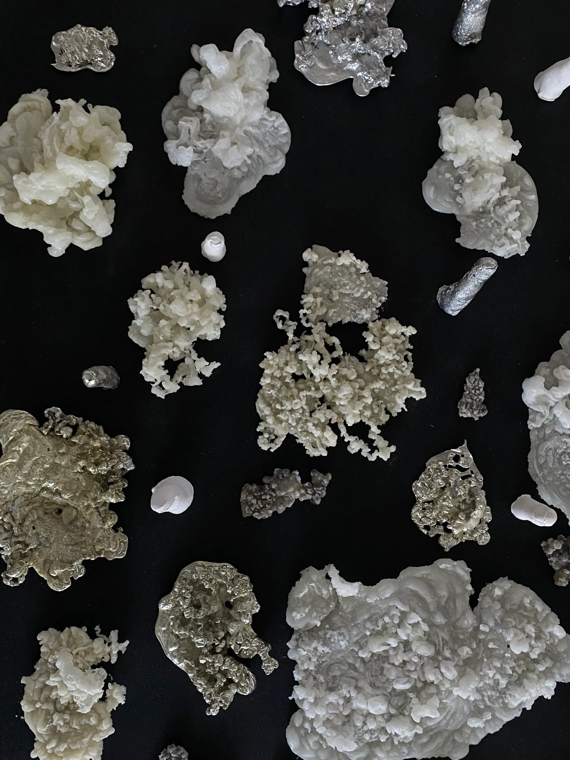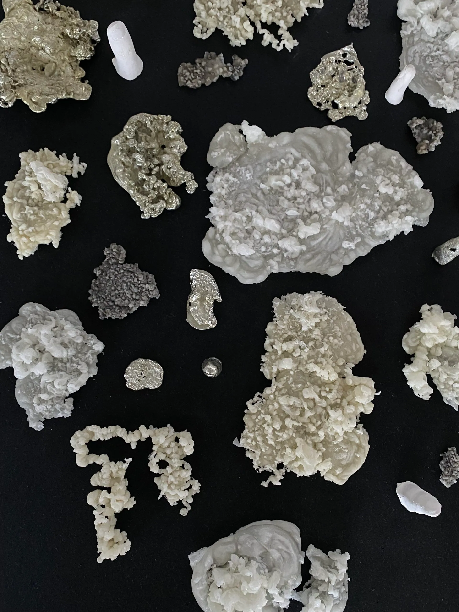 I tend to be drawn to material explorations in my work most recently I have been looking at materials which I feel have a performance/transformative aspect to them. In previous work I started to look at the idea of performative sculpture by making my destroys piece which was a wire frame wrapped in dissolvable fabric which was washed away in the act of it being destroyed. In my current exploration I have been looking at trapping a process/transformation in a material, for this I started to look at pouring wax into bubbles to trap the bubbles in a more permanent material, these works then developed into pewter casts of bubbles which I have combined with a sound piece featuring noises of the process such as the wax/metal pouring and bubbles popping, to bring a sense of movement back into the sculptural works.