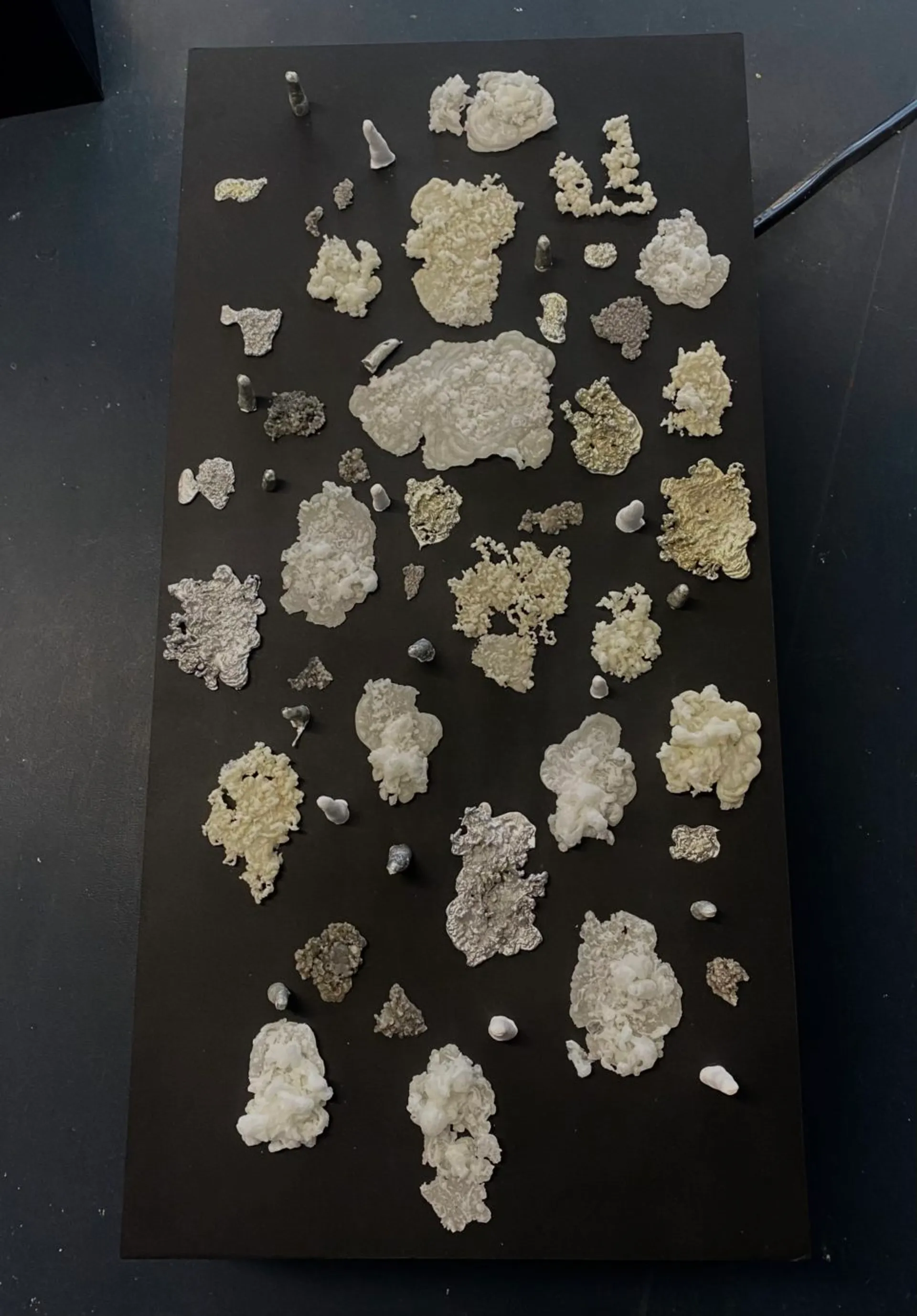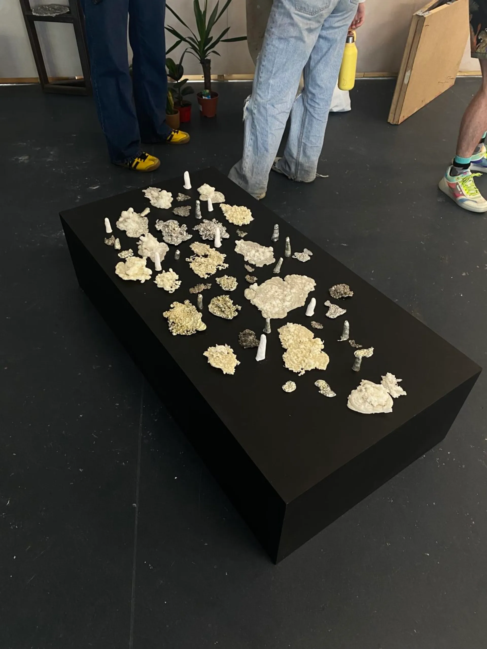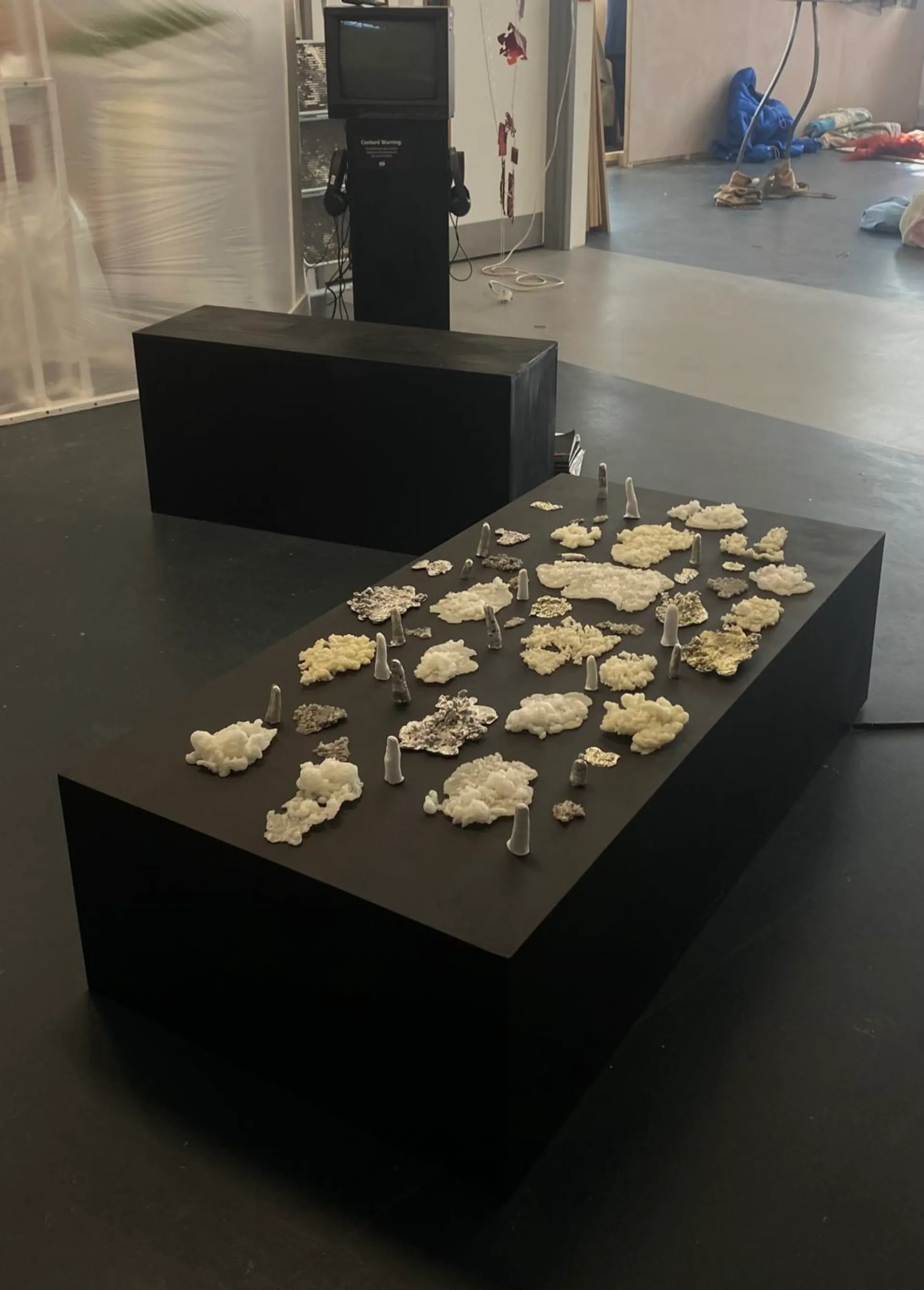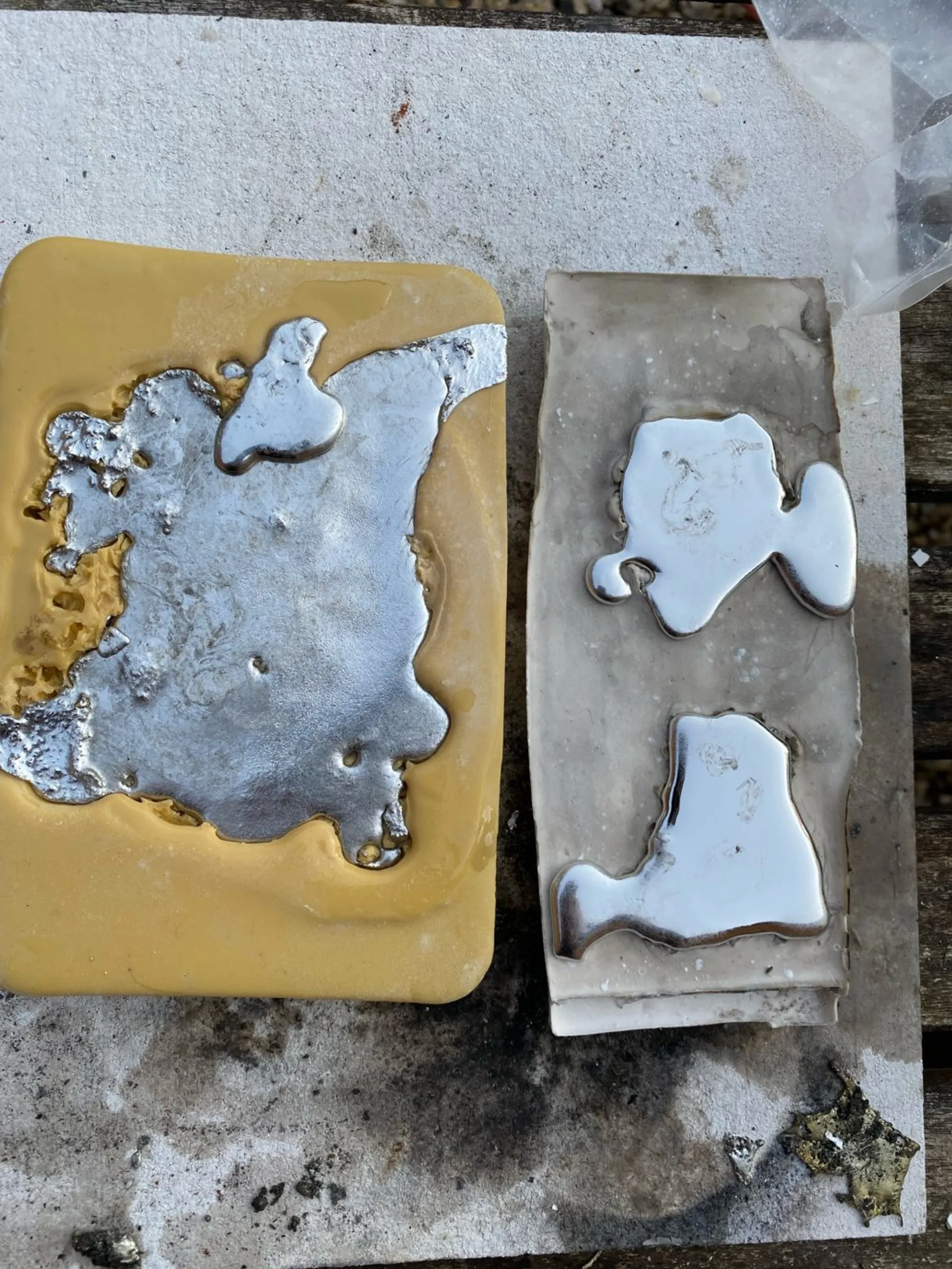 I tend to be drawn to material explorations in my work most recently I have been looking at materials which I feel have a performance/transformative aspect to them. In previous work I started to look at the idea of performative sculpture by making my destroys piece which was a wire frame wrapped in dissolvable fabric which was washed away in the act of it being destroyed. In my current exploration I have been looking at trapping a process/transformation in a material, for this I started to look at pouring wax into bubbles to trap the bubbles in a more permanent material, these works then developed into pewter casts of bubbles which I have combined with a sound piece featuring noises of the process such as the wax/metal pouring and bubbles popping, to bring a sense of movement back into the sculptural works.