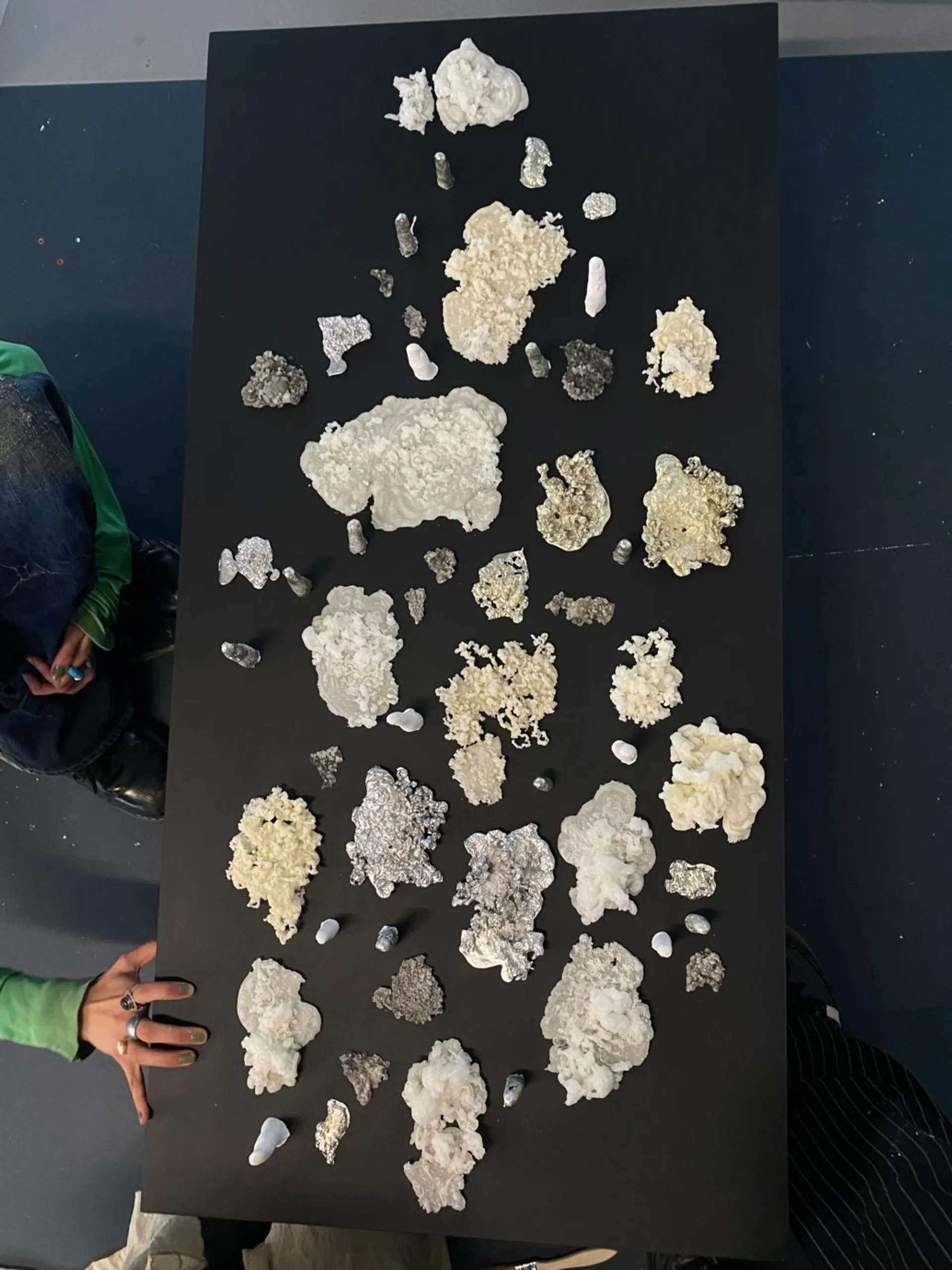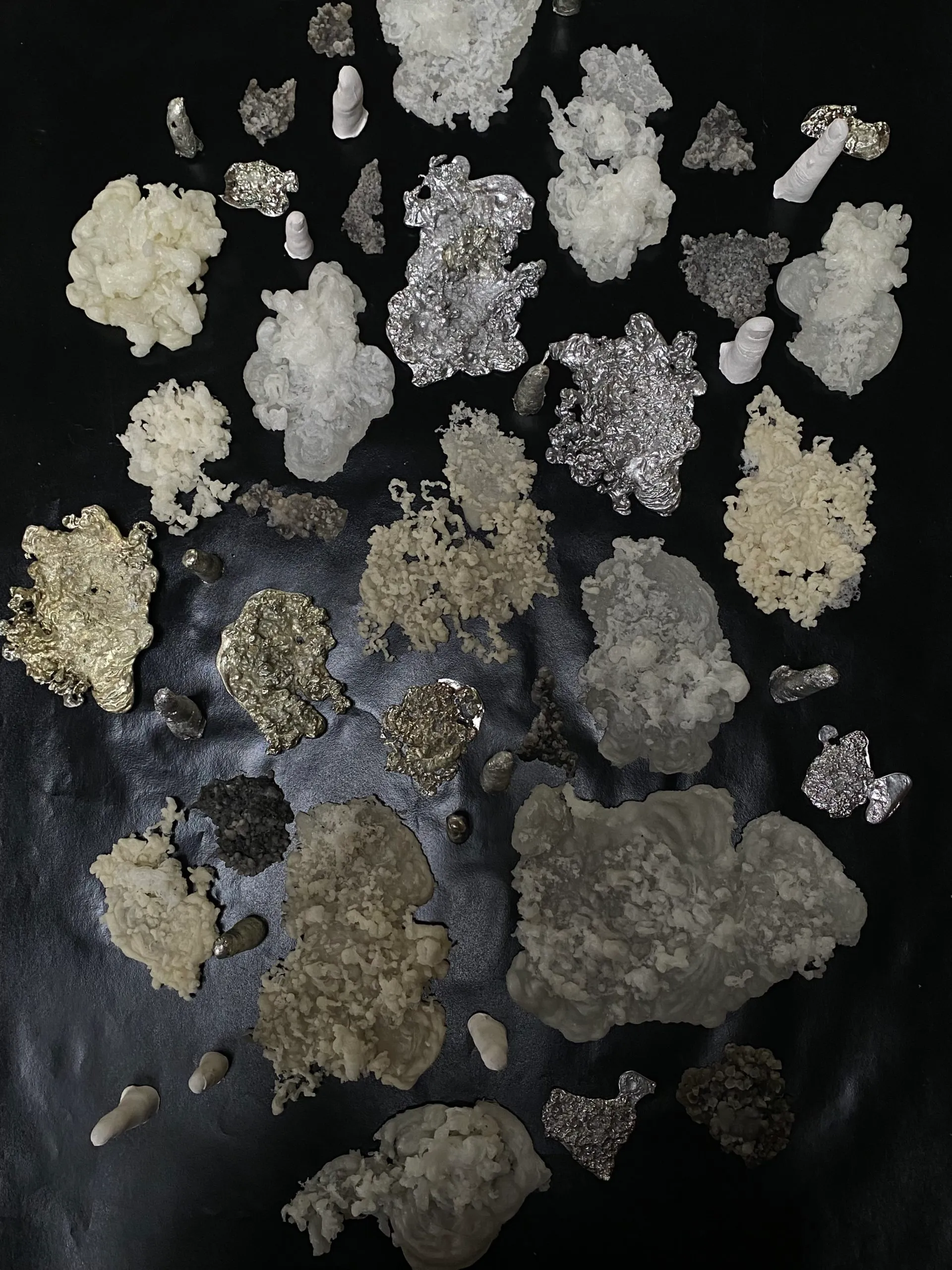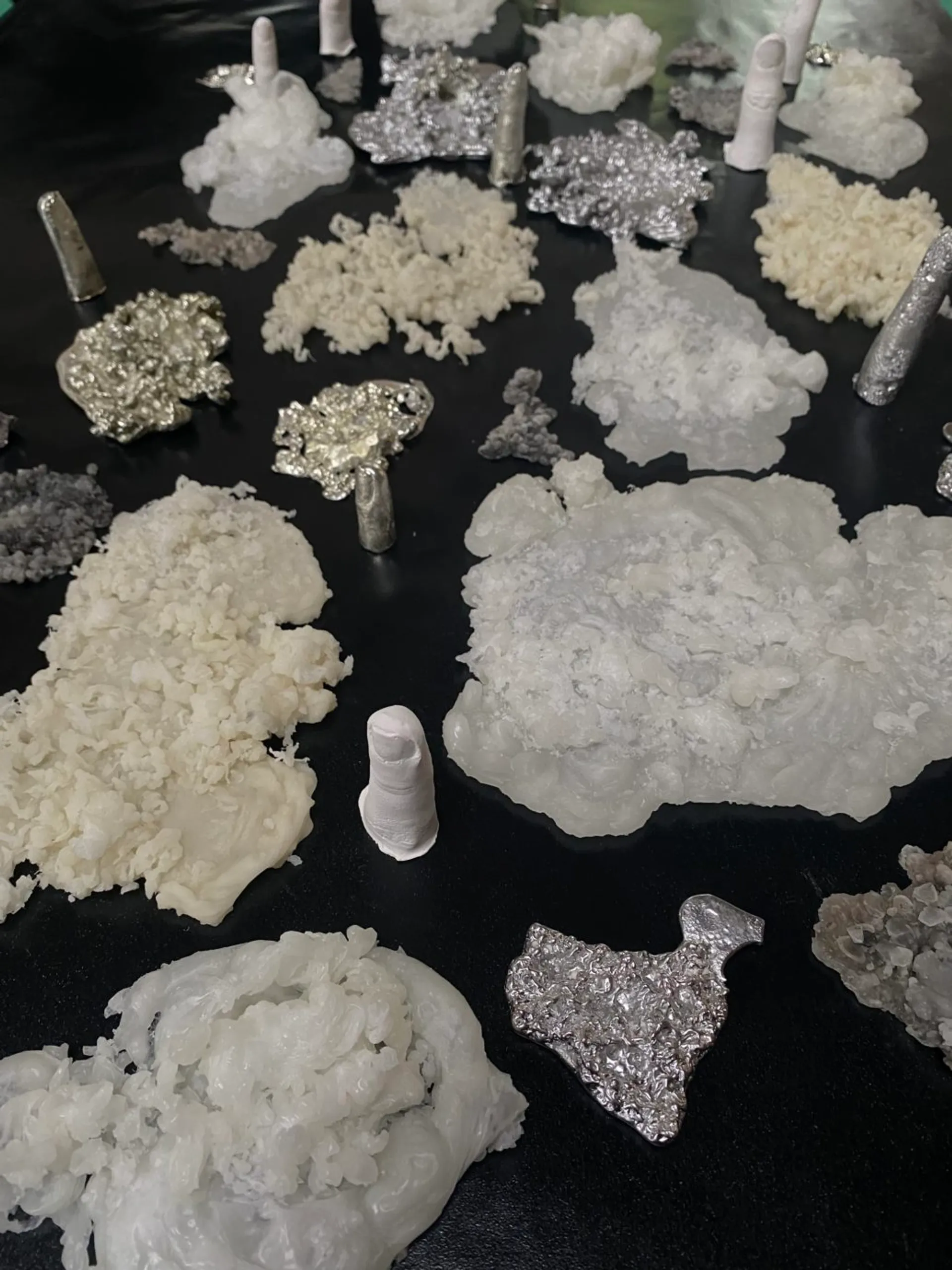 I have been making work with the intention of capturing a transformation in material. In these images I have shown my sculptural outcomes and process, made by pouring wax into bubbles, casting in pewter and casting from my body in plaster.