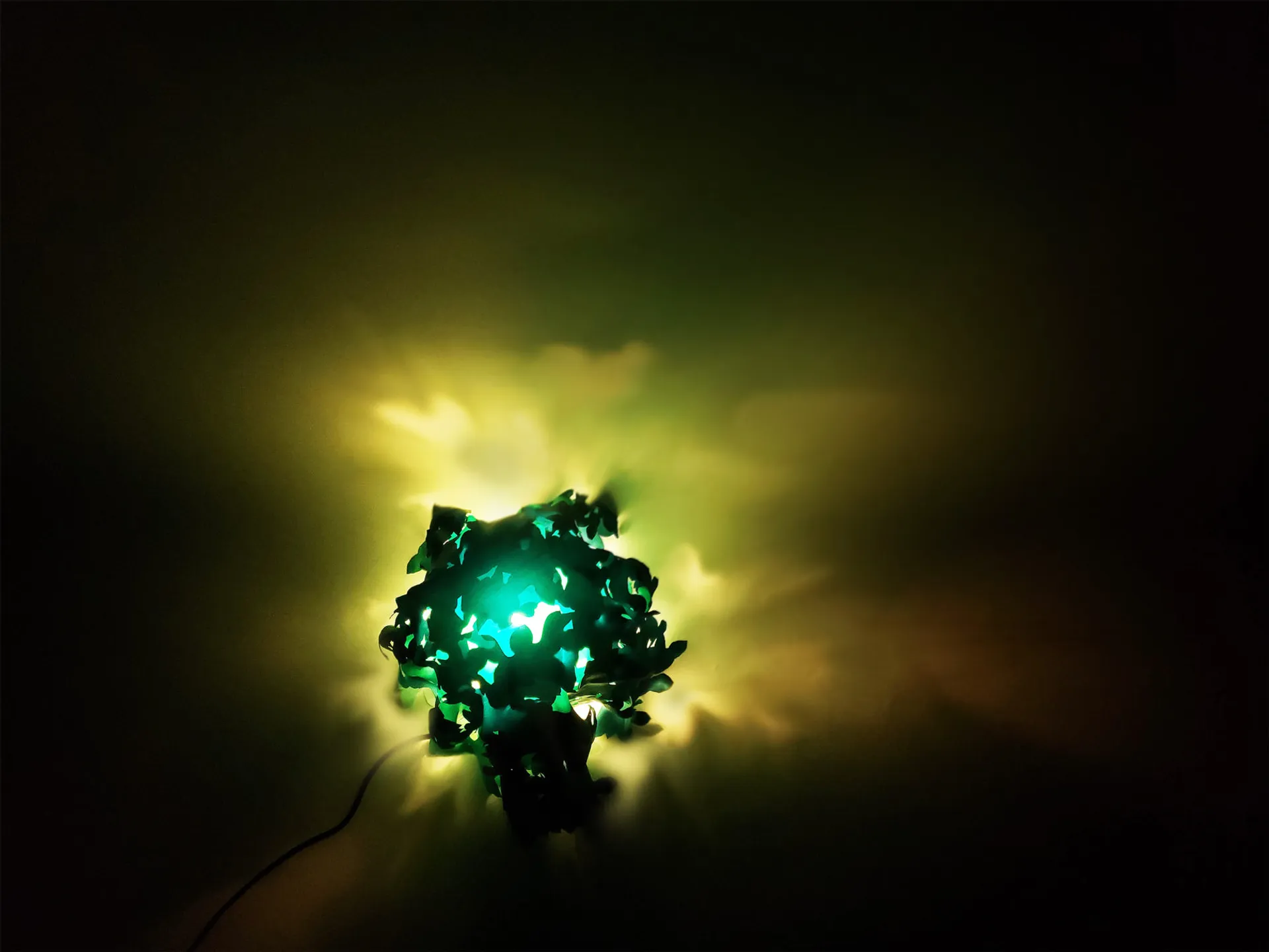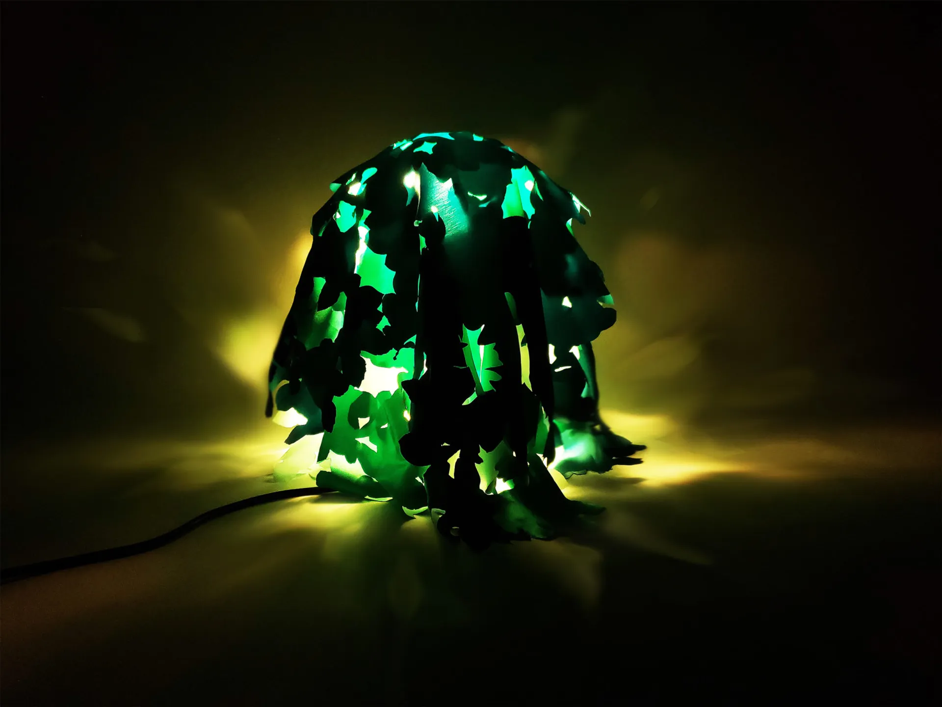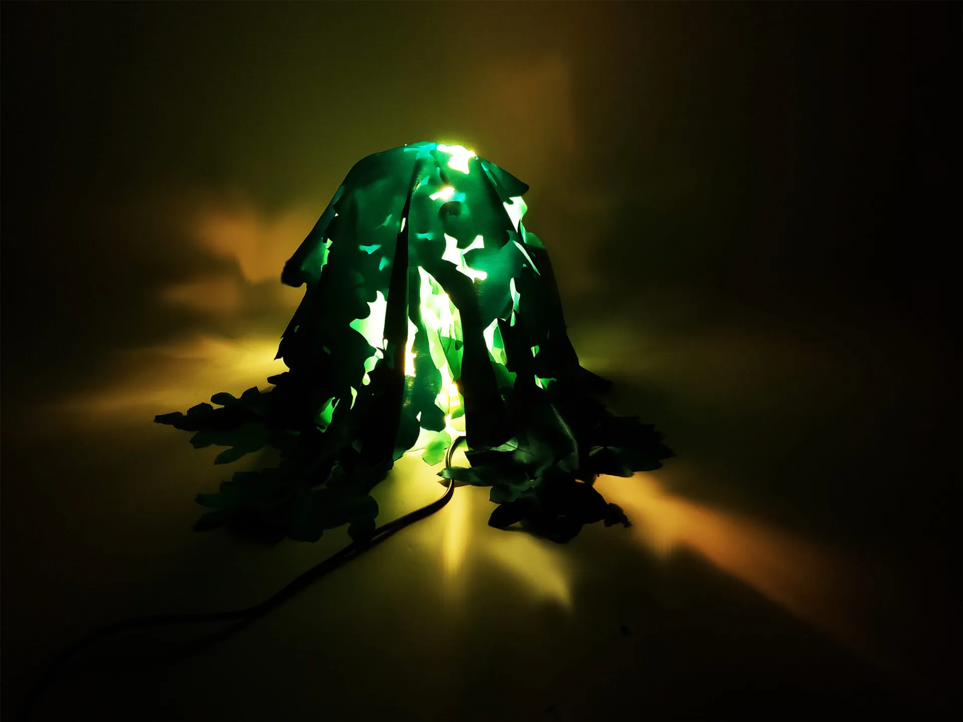 The use time of this light is at night or in dark weather. People usually like the ambience when the sun shines through the leaves. This design can approach the real scene through shadows. And I chose to use silk for the leaves. The cutting is done by laser cutting, on the grounds that this way the silk does not snag. The outlines of the leaves are perfectly cut. I chose three different shades of green to show the staggered relationship of real leaves. In the dark and cloudy environment, the color of the lamp will be slightly green when illuminated by the light, which also reflects the characteristics of sunlight shining through the dense leaves.