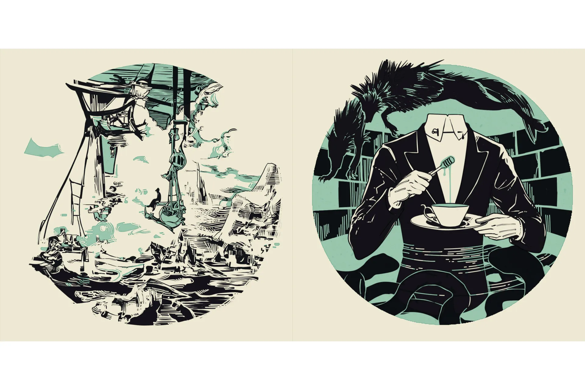I have used digital drawing techniques that are reminiscent of linocuts. The series of illustrations is assembled into a book, inviting the audience to participate actively in considering ideas about societal actions, cages and shelters. My aim is to express a timeless quality, using bold, dark lines, blocks and limited colours. This echos existing, analogue techniques, but presents the ideas in a new, progressive way. I am inspired by early films, science fiction films and AI painting methods. The logic of this is that abstract and unrealistic feelings can help to reflect the human aspects that these images are emphasising.