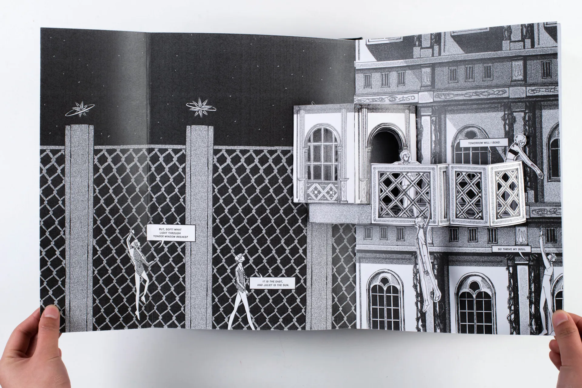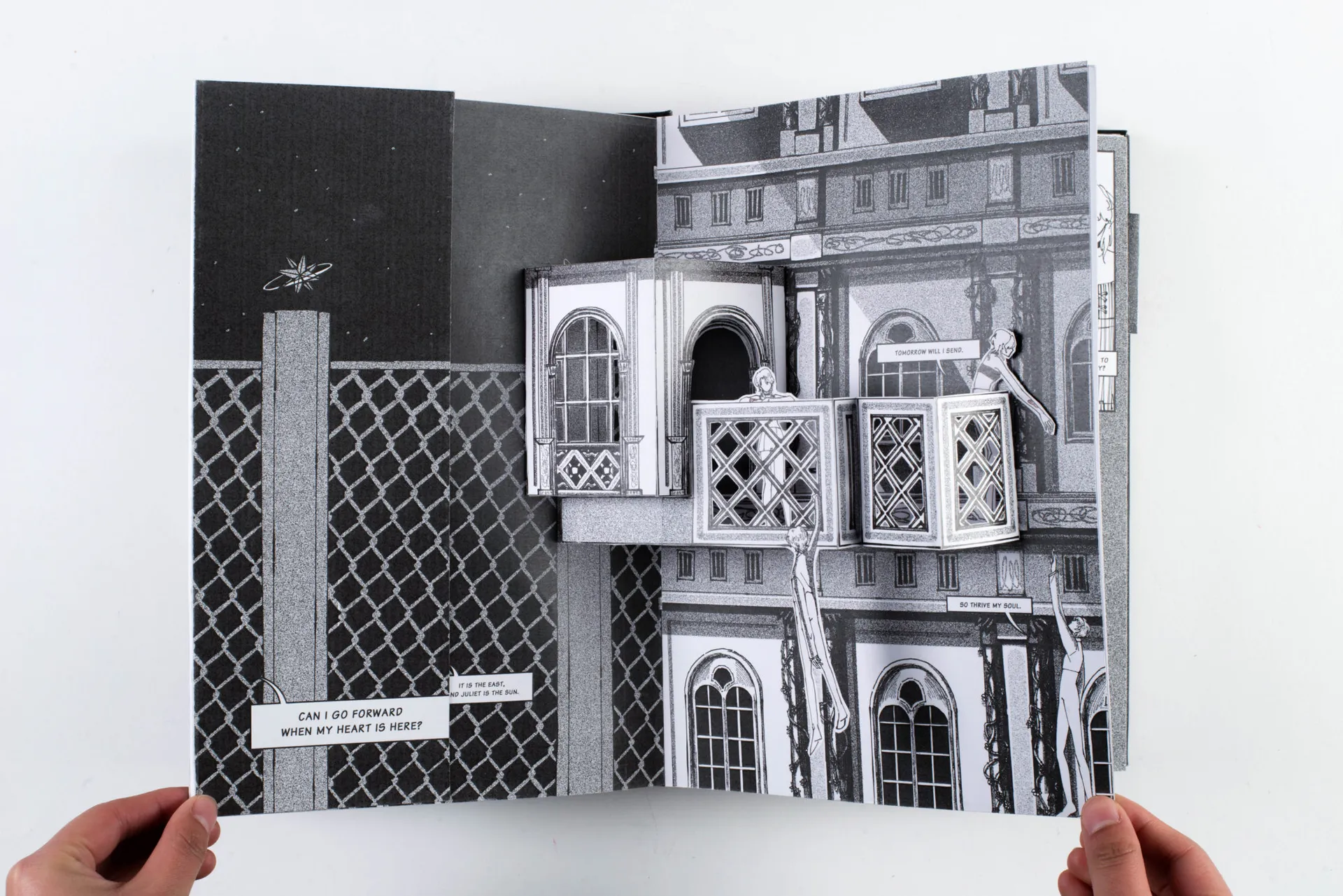 This project takes the form of an illustrated graphic novel with pop-up pages, aimed at an audience of around 14-18. My approach is mostly monochromatic, with a sparing use of colour.