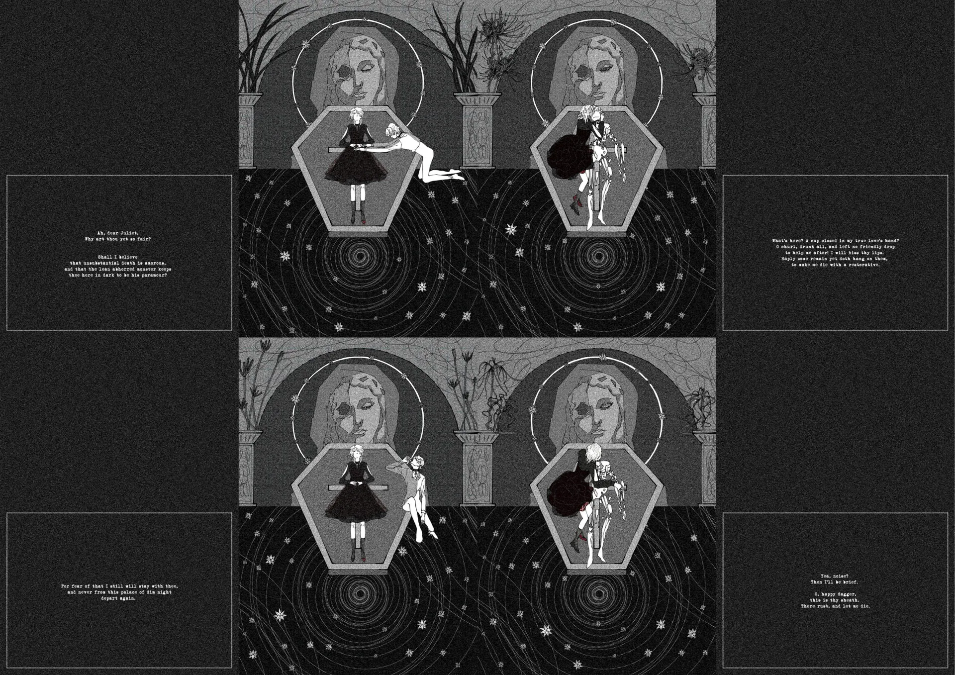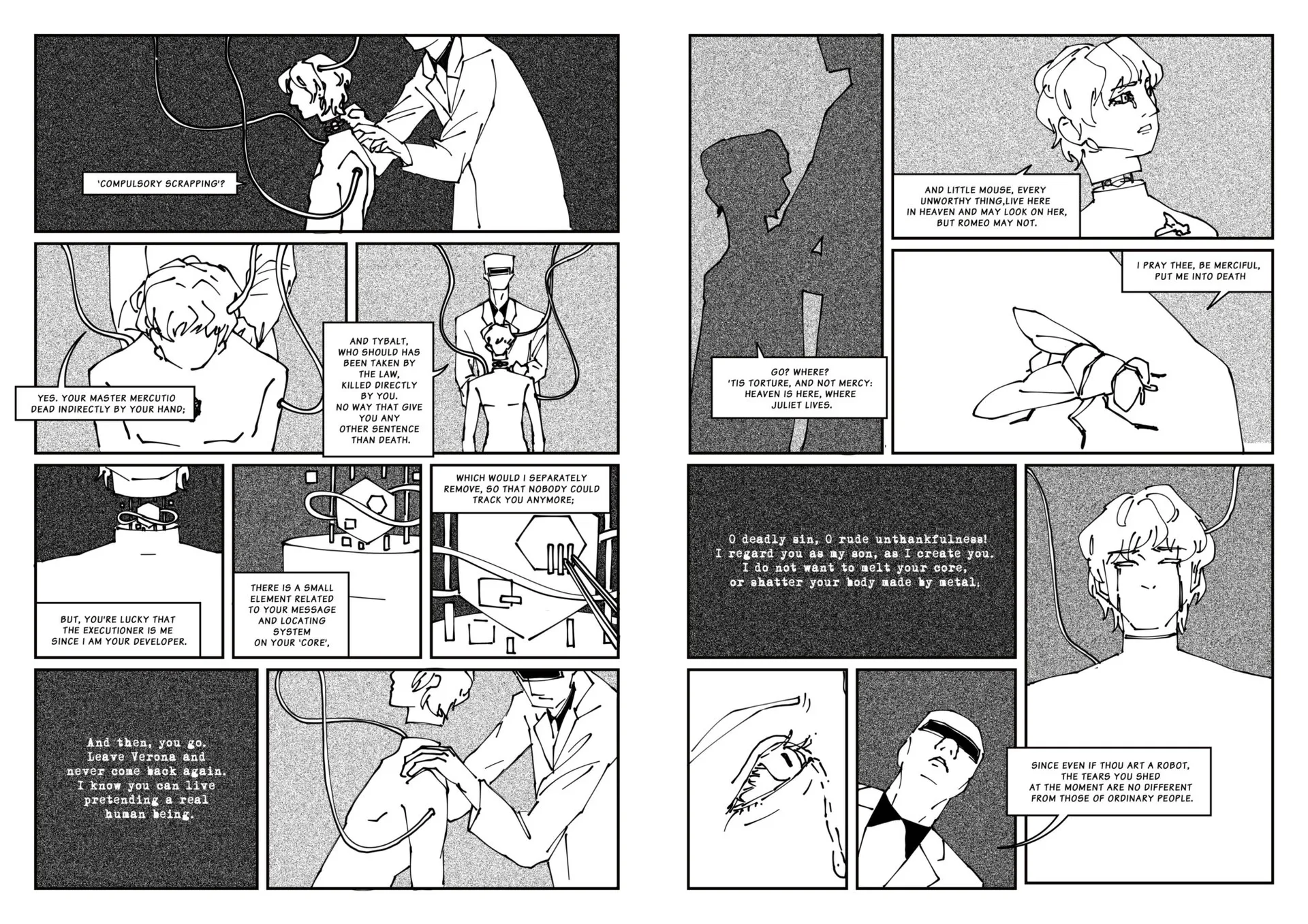 My project tells an alternative version of ‘Romeo and Juliet‘, set to the background of an imaginary future. This is a classic story about love that goes beyond hatred and distance. This project imagines the story taking place in a fictional future, where human beings and androids co-exist. As society keeps developing, so will the the story of ‘Romeo and Juliet‘. The story has the potential to be told in many ways, and in many time periods.